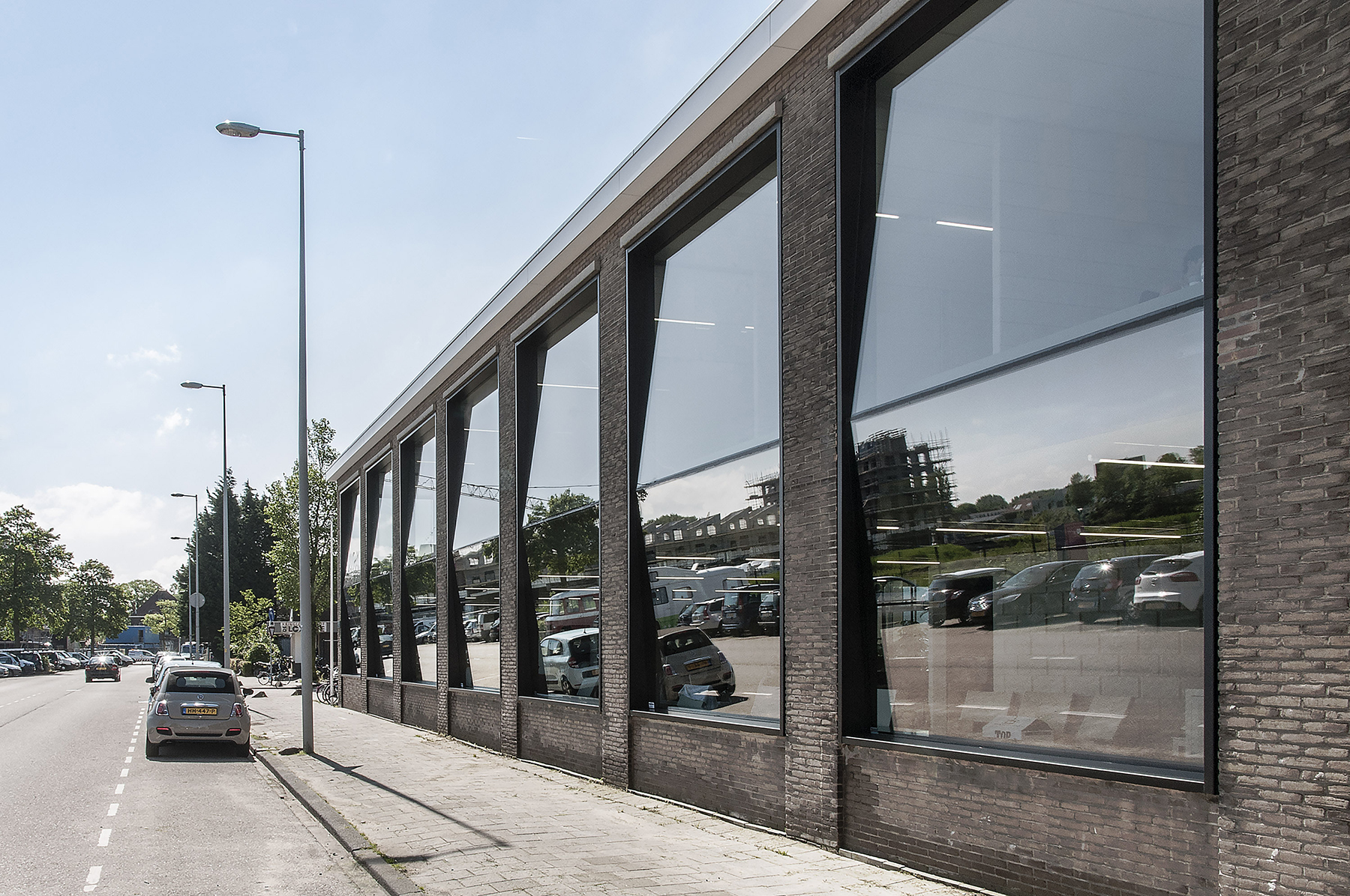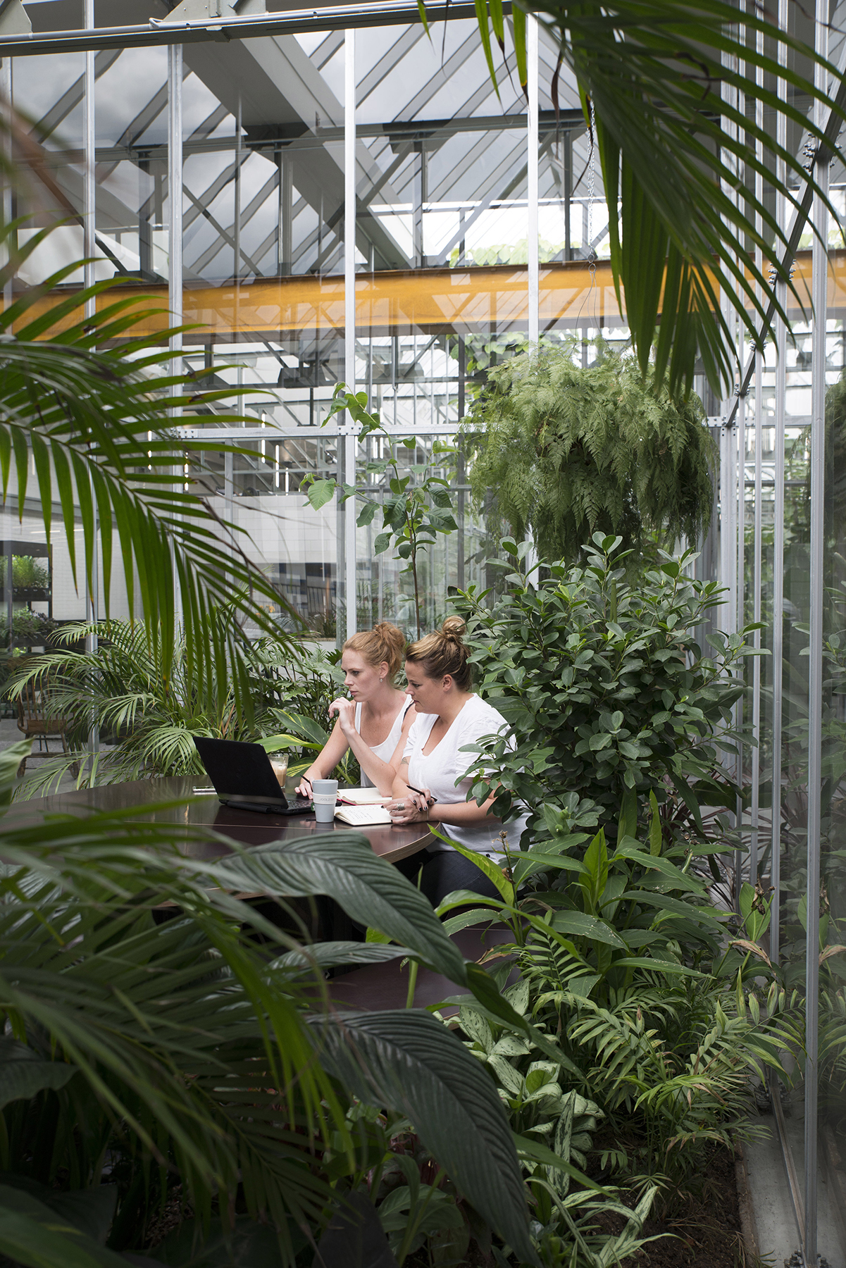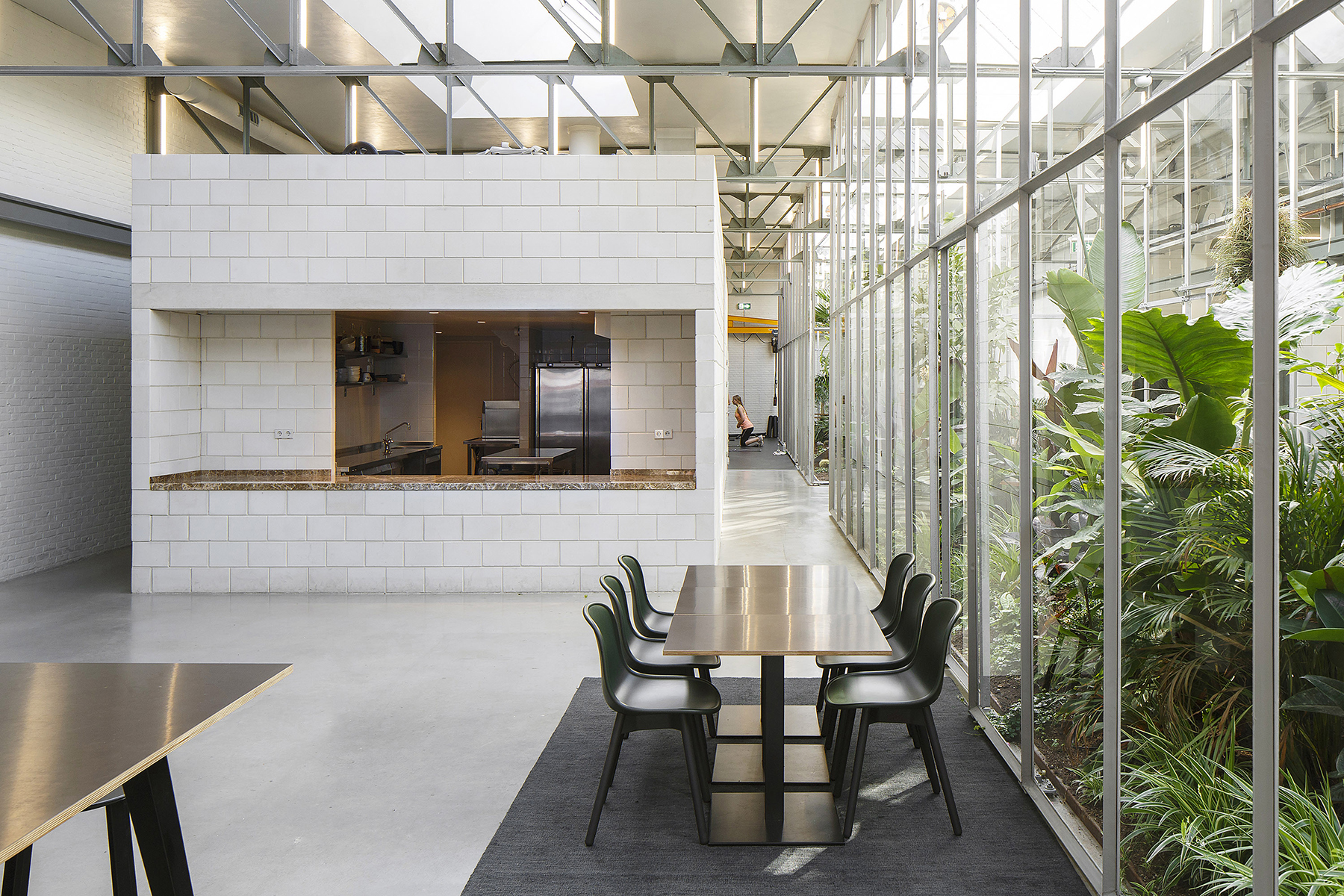 Het industriële pand aan de Distelweg bestaat uit twee, van elkaar gescheiden delen: een lichte fabriekshal en een tweelaags, generiek kantoor. De eerste ingreep van Space Encounters was om de wand tussen de beide bouwdelen op de begane grond open te breken, waardoor er één grote ruimte ontstond. De fabriekshal werd hierdoor vanaf de straat zichtbaar. De harde barrière maakte plaats voor een natuurlijke, doorwaadbare scheiding in de vorm van drie kassen vol tropische planten en bomen. Ze zijn direct onder een reeks bestaande daklichten geplaatst en liggen daardoor zowel architectonisch als botanisch op exact de juiste plek. Niet alleen zijn de kassen in vorm en schaal een echo van de daklichten, ook in hun detaillering en materialisering versterken ze het gevoel van logica. In de kassen, waar de planten letterlijk richting de hemel groeien, zijn diverse overleg- en concentratieplekken voorzien. De exotische werkplekken bieden dankzij de dichte begroeiing en de aanwezigheid van grote, glazen schuifpuien zowel visueel als akoestisch de nodige privacy. Ontvangst, ontmoeting, ontspanning en informeel overleg vinden plaats in het ruime werkrestaurant in de voormalige fabriekshal, terwijl in het tweelaagse bouwdeel aan de straat de bureauwerkplekken zijn ondergebracht. Eenvoudige volumes van kalkzandsteenblokken verdelen beide zones in kleinere, overzichtelijke eenheden. Ze herbergen functies als keuken, kleedruimten, pantry, toiletten, opslag en verticale verbindingen. Het werkrestaurant is ruimer vormgegeven dan noodzakelijk omdat naast de primaire functie van bedrijfsrestaurant, heeft restaurant ook een buurtfunctie heeft. De kantoorzone bestaat op de begane grond uit grootschalige, open werkplekken, terwijl de verdieping middels kalkzandstenen wanden op stramien opgedeeld is in kleinere werkgebieden. De gangzone ligt hier langs de gevel, maar is van het werkgebied af te sluiten met glazen schuifdeuren. Dankzij een groot aantal trappen blijven alle ruimten bereikbaar, ook als plaatselijk de glazen deuren dicht zijn geschoven. We wilden met behulp van dit gebouw ook de buurt mooier en veiliger maken. Niet alleen door het kantoor een buurtfunctie te geven, maar ook als baken van licht en leven langs een vrij donkere en anonieme route.” Dankzij de gekantelde plaatsing van de grote glazen puien is de transparantie vanaf buiten maximaal. Vooral in de avonduren opent het pand zich als een poppenhuis waar voorbijgangers dwars doorheen kunnen kijken.