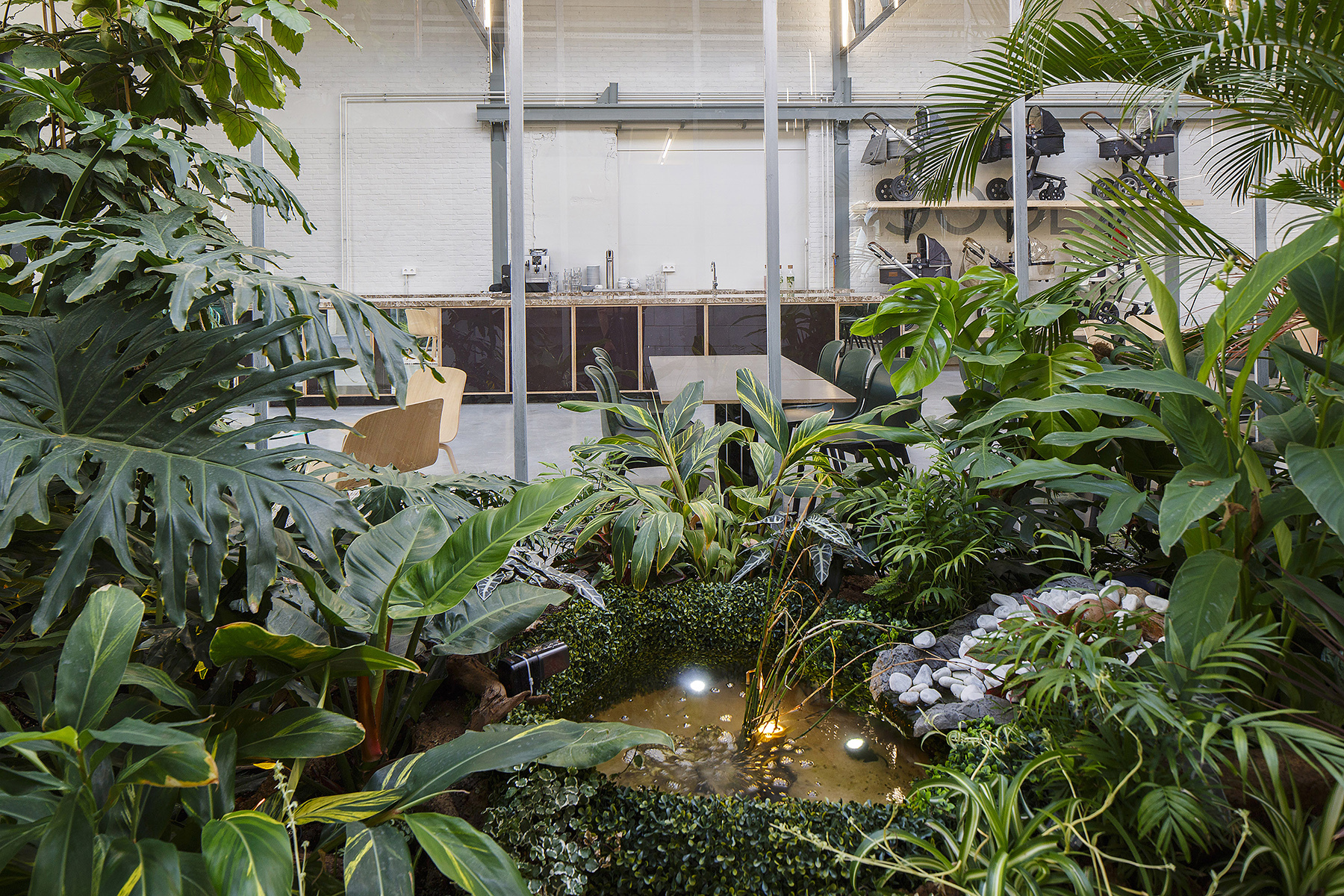 Joolz is dan wel een kinderwagenproducent, maar dat doet de ingang van het gebouw niet vermoeden. Het eerste wat je ziet is namelijk een kas met tropische planten in, waardoor je bij een fruitkweker denkt beland te zijn. Maar nee, in dit tropische klimaat worden inderdaad kinderwagens ontworpen. “Wat je ziet is de vertaling van de wensen van onze werknemers door de architect”, vertelt Stan Vermeulen, CEO en mede-oprichter van Joolz. “De slagzin van Joolz is ‘positive design’ en dat moest ons nieuw hoofdkantoor ook uitstralen toen we anderhalf jaar geleden deze oude machinefabriek kochten.” Joolz is sinds 3 maanden verhuisd van een smal grachtenkantoor in centrum Amsterdam naar dit ruime pand in Noord-Amsterdam. “We wilden voor ons nieuw hoofdkantoor een plek waar creativiteit gestimuleerd wordt en een inrichting die uitstraalt waar wij als merk voor staan. Bovendien helpt dit decor bij een goede sfeer op de werkvloer en leren we elkaar beter kennen door de verschillende open plekken in het kantoor.” Het kantoor van Joolz ziet er niet alleen uit als een bos in een tropisch regenwoud, ze werken met de verkoop van hun kinderwagens ook aan meer groen in de wouden. Zo wordt er bijvoorbeeld per verkochte kinderwagen een boom gepland in Colombia. “Kinderwagens maken is niet echt eco-friendly, maar we proberen in alles wat we doen onze ecologische voetafdruk te verminderen.” Een gezonde geest in een gezond lichaam. Dat is een spreuk die al meegaat sinds het bestaan van spreuken en ook belangrijk is bij Joolz. “De sportruimte is samen met mijn eigen kantoor en de bar mijn favoriete plek in het kantoor. Ik probeer zelf twee keer per week te sporten. Dat is altijd leuk om met collega’s te doen, zeker als je er even klaar mee bent en de motivatie om te werken ver te zoeken is.” Naast een sportruimte, is er ook gedacht aan een goede lunch om de werknemers gezond te houden. De lunch is steeds organisch en heel divers. De groenten die Stan en zijn team eten zijn niet in de kassen gekweekt, zoals ik verwachtte. “We werken samen met de buurtboer en een cateraar om er zeker van te zijn dat we elke dag lekker en gezond eten krijgen.” Naast de sportruimte, het gezonde eten en de mooie werkplek heeft Stan nog andere manieren om zijn werknemers gelukkig te houden. “Elke week houden we een VrijMiBo bij ons op kantoor waar we met z’n allen gezellig aan de bar bijkletsen."