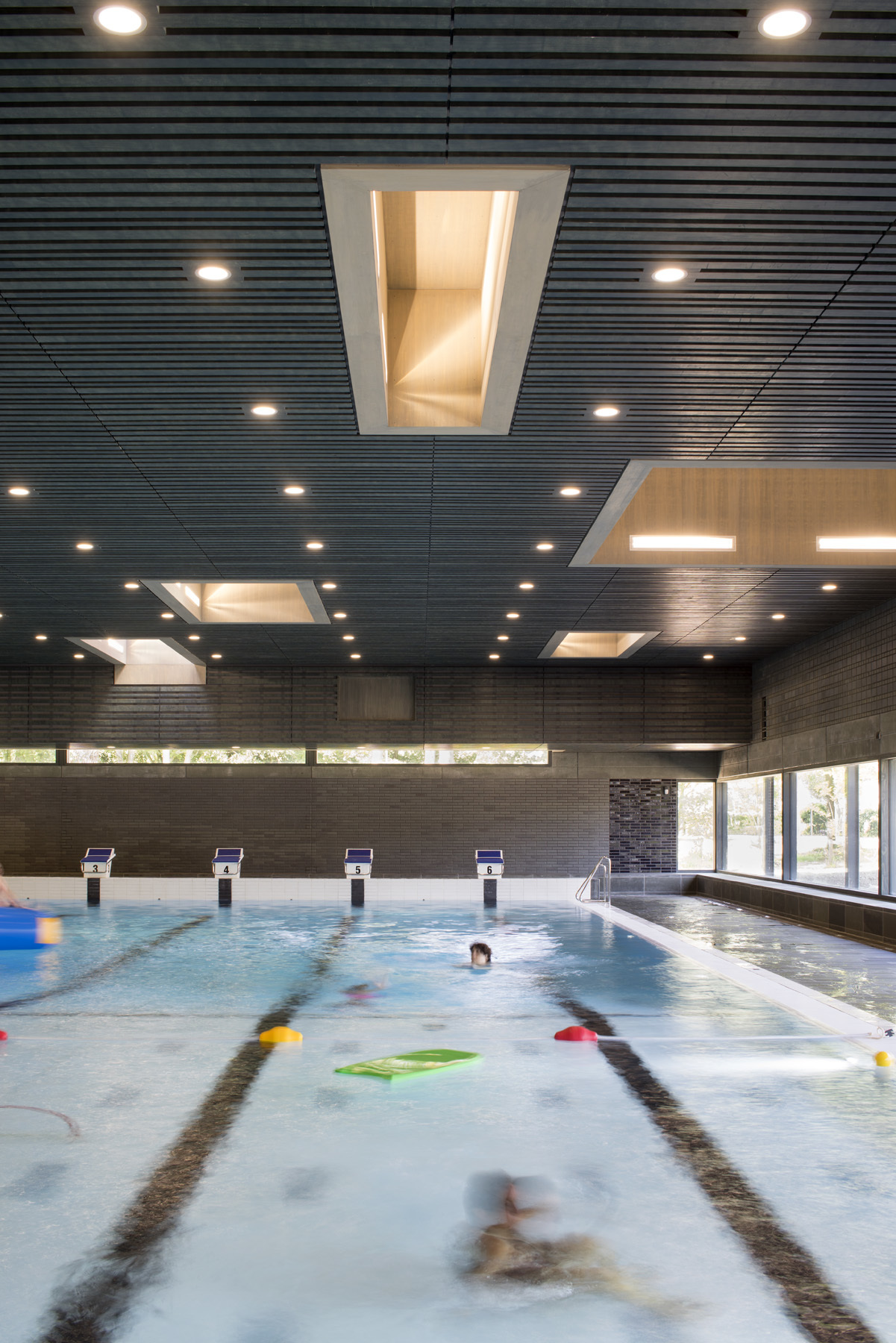 Een optimale inpassing in de omgeving stond voorop. Dit is gerealiseerd door een integraal ontwerp van gebouw, interieur en landschap. Uitgangspunt was een alzijdig gebouw dat bovendien de entree tot Rozenburg zou markeren. Ook diende het gebouw functioneel van aard te zijn maar aanzienlijk meer dan alleen een sportcentrum. Referentie was een clubhuis voor de gemeenschap met een hoge belevingswaarde. Sportcentrum Rozenburg is een compact, alzijdig gebouw. Op de hoeken is de bouwmassa lager waardoor het volume kleiner lijkt en beter aansluit op de omliggende bebouwing. De hoofdvorm volgt de rechthoekige opzet van de kavel. Hierdoor blijft het parkachtige karakter van de locatie behouden. Alle gevels hebben een eigen gezicht. Daarbij wordt steeds gereageerd op de omgeving. Zo helpen de gevels grenzend aan de bestaande bebouwing om de woonwijk aantrekkelijker te maken: ze maken van de achterkant weer een voorkant. Grote gevelopeningen verlevendigen de plint van het sportcentrum. Mede gestuurd door de bestaande hoogteverschillen zijn de hoofdfuncties en de entree goed herkenbaar. Hierdoor oogt het niet als een ‘saai’ gebouw maar als een afwisselend en samenhangend geheel. De vele doorzichten en zichtlijnen maken de omgeving (en de lucht) vanuit het gebouw optimaal ervaarbaar. Functies lopen over van binnen naar buiten. Groene lichthoven (met bomen) brengen daglicht en het groen letterlijk tot in het hart van het gebouw. Het gebouw is eenvoudig van opzet en gerealiseerd met ‘alledaagse materialen’, geheel binnen het vooraf vastgestelde budget. De materialen zijn bijzonder waar noodzakelijk en regulier waar het kan. De hoge architectonische kwaliteit vloeit voort uit een focus op samenhang, een zorgvuldige detaillering en een extra inspanning in het ontwerptraject. Zo is voor het sportcentrum een speciale groene gevelsteen ontwikkeld. De steen sluit aan op aangrenzende bebouwing en laat het gebouw opgaan in het groen. De buitengevel is doorgezet in het interieur en geeft het complex binnen een warme uitstraling. De groene steen geeft, samen met het maatwerk meubilair, de natuurstenen zwembadperrons en de transparant gebeitste kozijnen, een geheel eigen sfeer aan het interieur. De gevelstenen zijn voorzien van een schijnvoeg waardoor (ondanks het reguliere halfsteens verband) de voegen doorlopend zijn. Samen met de verdiept gedetailleerde ramen draagt dit bij aan de sculpturaliteit van het volume.
