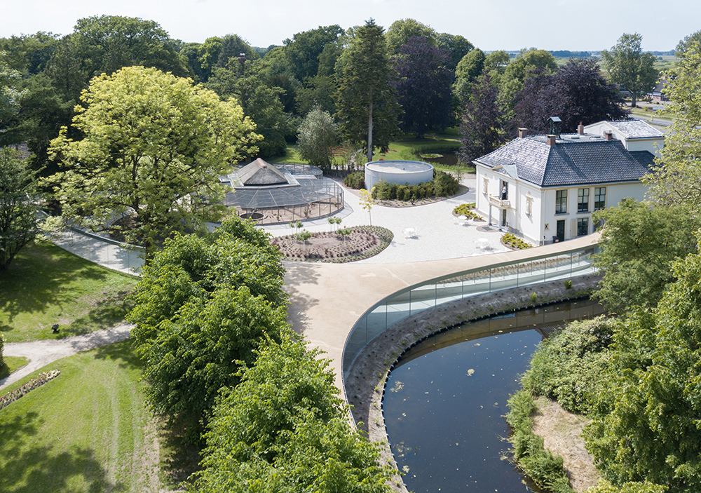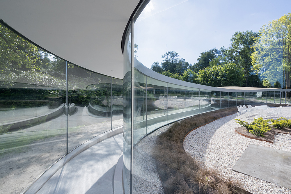Opgave De opgave was een bezoekerscentrum te creëren als uitbreiding van de rijks-monumentale villa. Tegelijkertijd zou de uitbreiding moeten opgaan in het rijks-monumentale park. Door de vorm te laten ontstaan vanuit de historische landschapslijnen en het gebouw zo transparant mogelijk uit te voeren, te verzinken, is geprobeerd haar impact te verkleinen. Een glazen gang sluit naadloos aan op een bestaande gevelopening van de villa, waardoor slechts minimale ingrepen aan het monument noodzakelijk waren. Conceptuele kracht Het gebouw gaat maximaal op in het park. Het bestaat uit drie glazen lijnen die bestaande landschappen accentueren (een vijver, een lindelaan, een villatuin) en bezoekers van en naar de verschillende bestemmingen in het park leiden. Ook in het verticale vlak volgt het paviljoen de zacht glooiende lijnen van de omgeving, waardoor het gebouw zelf een nieuw soort landschap wordt. Uitwerking De glazen gevellijnen zijn zo transparent en continue mogelijk uitgevoerd, van de eerste ontwerpschetsen tot de draagconstructue in glas en de detaillering. Zo ontstaan er compleet vrije uitzichten naar alle kanten van het park. Er zijn verschillende entrees gemaakt, die eenvoudig toegang verschaffen naar en van het park. De verbinding met de villa via een hellingbaan maakt eenvoudig gecombineerd gebruik mogelijk. Landschappelijke inpassing Het gebouw komt voort uit de historische landschappelijk elementen van haar omgeving: een vijver van Roodbaard, een historische lindelaan, de overgang naar het oude wandelbos en de oude villatuin. De door de jaren heen enigszins verwaterde landschappelijke structuur heeft door het nieuwe paviljoen weer een zekere helderheid en kracht terug gekregen. Materialisatie Uitgangspunt is altijd een transparent gebouw geweest. Deze transparentie is optimaal doorgevoerd door het toepassen van een (extra heldere) glazen draagconstructie. Wanden en vloeren bestaan uit in het werk gestort beton. De dakconstructie is van hout en staal, afgewerkt met akoestische pleister (binnen) en epoxygebonden grind (buiten). Het dak heeft ventilatieplenums voor natuurlijke ventilatie. Budget vs. kwaliteit De totale uitbreiding van het park is bijna geheel binnen begroting gerealiseerd. Er zijn helaas wel door vertragingen (o.a. i.v.m. een failliete aannemer) subsidiegelden misgelopen. De Stichting heeft het budget met eigen middelen aangevuld. Desondanks zijn er nooit concessies gedaan t.a.v. de gerealiseerde kwaliteit.