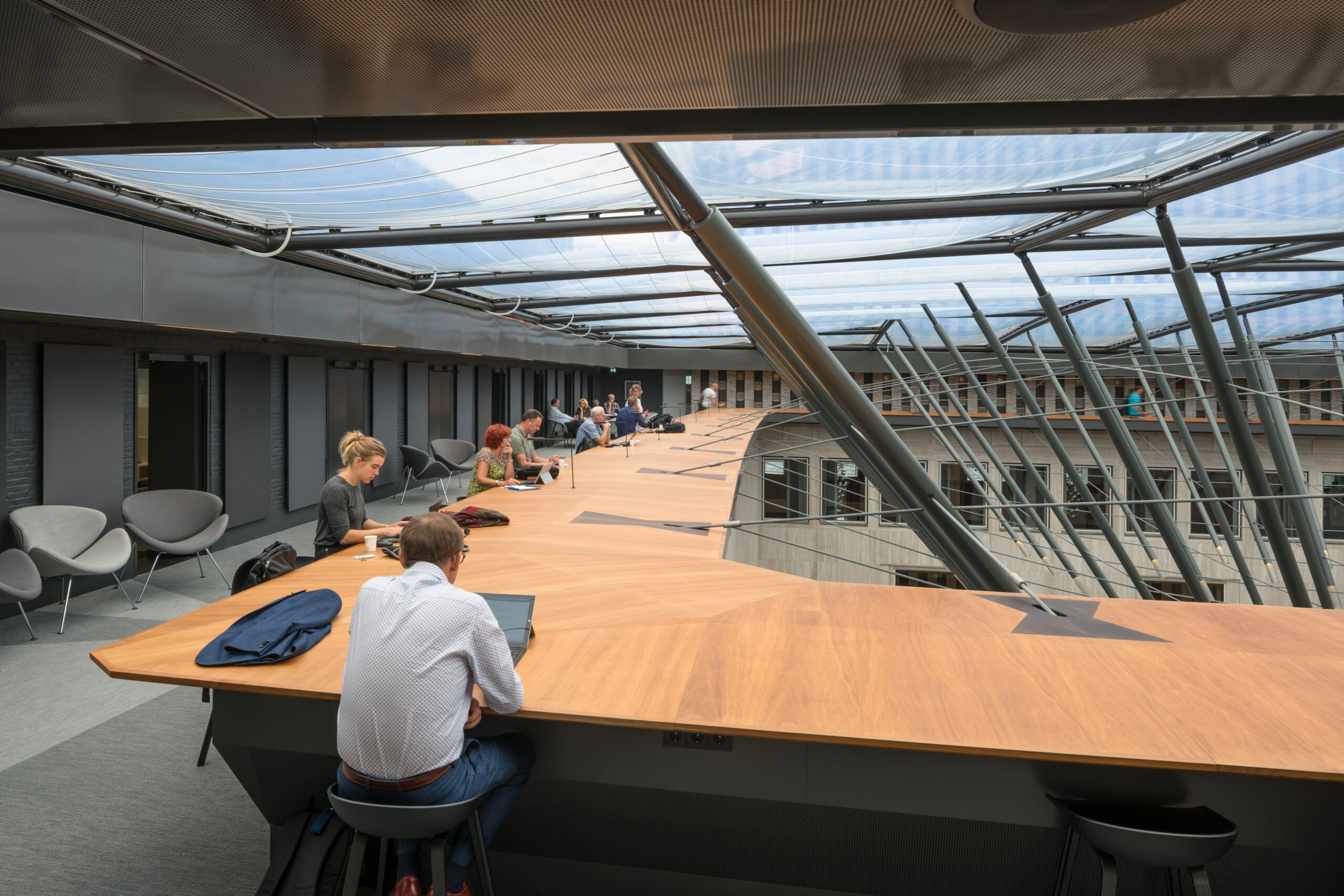 Uitgangspunt van het ontwerp van Het Gelders Huis is om ontmoetingen tussen medewerkers en bezoekers en medewerkers onderling te stimuleren. Dat gebeurt allereerst in ontvangsthal op de overkapte binnenplaats. Iedereen komt binnen via dezelfde entree en wordt ontvangen in deze grote, lichte ruimte. Ook het gebied rond de binnenplaats, zowel op begane grond als de eerste verdieping, is publiek toegankelijk. Direct aan de binnenplaats ligt de voormalige ontvangsthal die is ingericht met diverse zitgelegenheden. De ontvangsthal en de aangrenzende ontmoetingsruimte met koffiebar worden onder medewerkers erg gewaardeerd en worden intensief gebruikt voor informeel overleg en als aanlandplek. Het is een ideale plek voor ontmoetingen tussen medewerkers en bezoekers aan de erboven gelegen Raadszaal of vergaderruimtes. Een monumentale trap leidt vanuit de voormalige ontvangsthal naar de Zuidgalerij. Deze publiek toegankelijke ruimte dient als uitloop voor de Raadszaal en biedt met een enorm venster een prachtig uitzicht over de Rijn. Op zowel de Zuidgalerij als de Noordgalerij worden regelmatig borrels en tentoonstellingen georganiseerd. De galerijen, de vergaderzalen en de binnenplaats zijn te huren door bijvoorbeeld lokale instellingen en bedrijven, wat bijzondere kruisbestuivingen met zich meebrengt. Zo is de overkapte binnenplaats onder meer gebruikt voor een modeshow van de Artez Hogeschool. Ook de open werkomgeving, ontworpen door OTH architecten, stimuleert samenwerken en ontmoeten. Op elke verdieping zijn diverse ontmoetingspunten ingericht en de verbindingsbruggen tussen het nieuwbouw en het monument zorgen ervoor dat het werklandschap vloeiend in elkaar overloopt. Op de tweede verdieping is de verbindingsbrug van 7,5 meter breed zelfs ingericht met werkplekken. Bijzonder is de ‘langste werktafel’ op de derde verdieping van het monument. De tafel ligt helemaal rondom de binnenplaats en biedt een unieke werkplek met uitzicht op de ontvangsthal en de spectaculaire kapconstructie. In de nieuwbouw zorgen een atrium met trappen en een patio voor interactie tussen de verschillende verdiepingen en afdelingen. Dwars door de nieuwbouw loopt een publieke wandelroute. Deze voert door de met glas omringde patio, van waar voetgangers zicht hebben op de werkomgeving. Deze transparantie is volledig in lijn met de wens van de Provincie om de zichtbaarheid en benaderbaarheid van de organisatie te vergroten en de interactie tussen Provincie en Arnhem te stimuleren