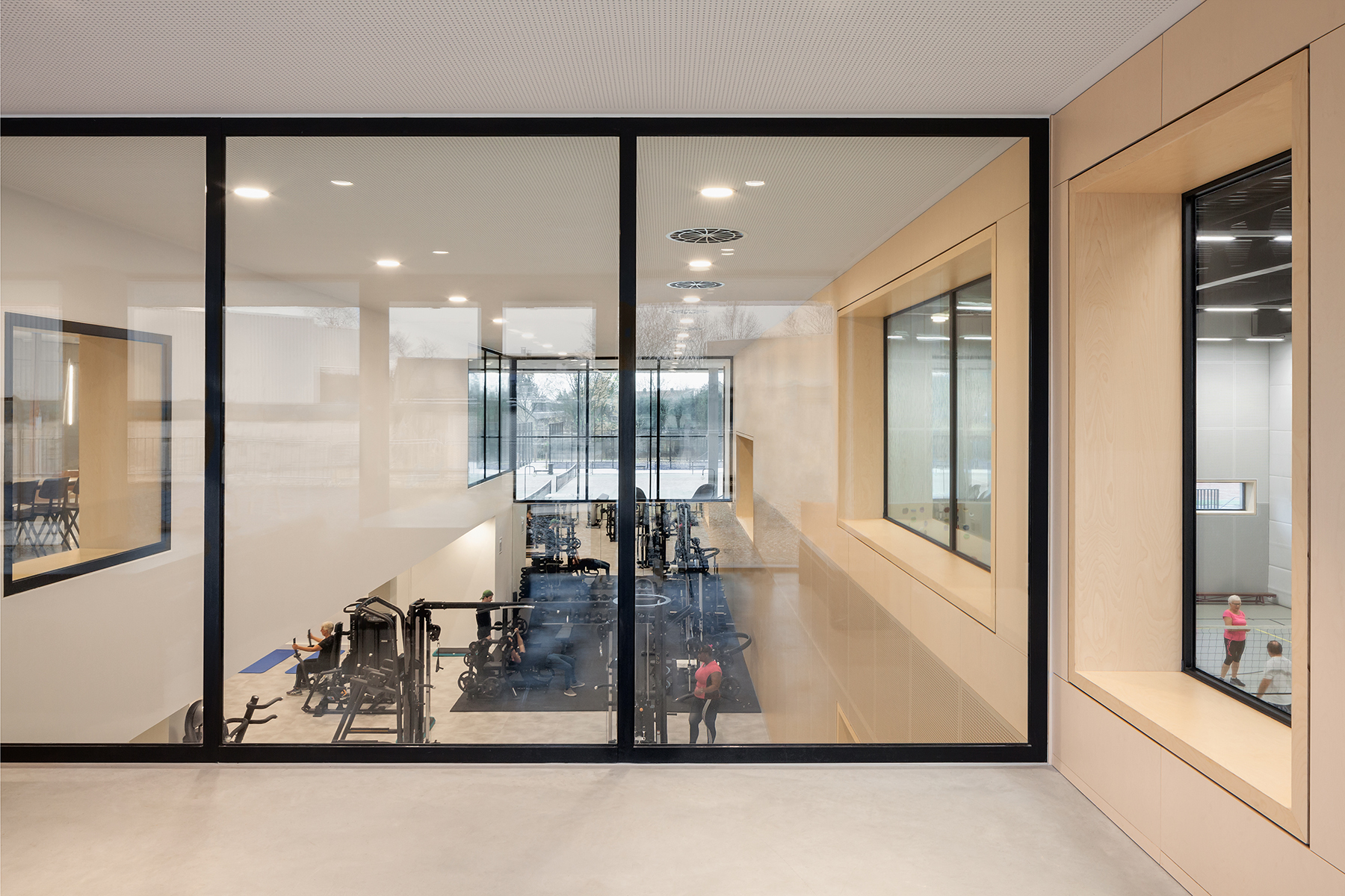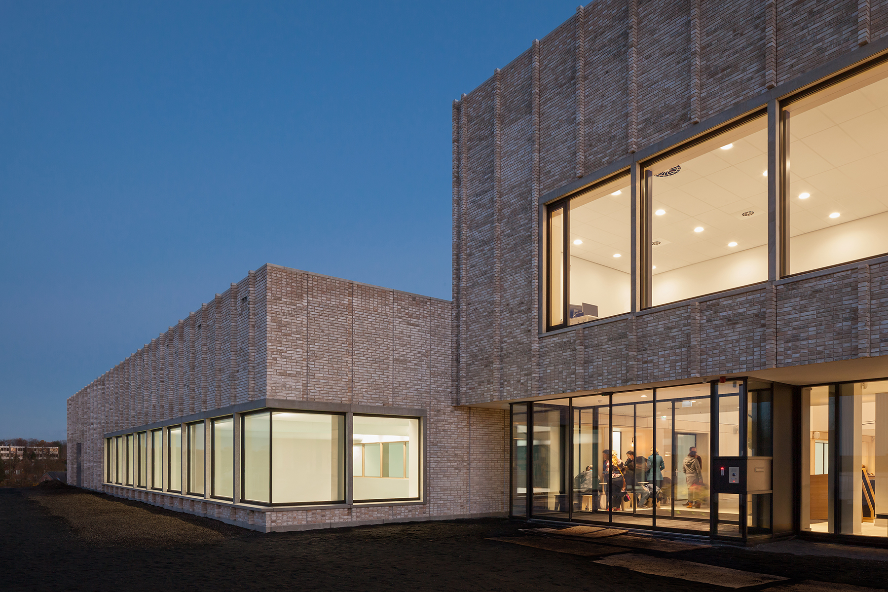 Huiskamer van Renkum In een prachtig groen gebied omgeven door kleinschalige woningbouw is MFC Doelum ontworpen als een sociaal hart voor de gemeente Renkum. Een ontmoetingsplek voor sport en cultuur, waar de kracht van het collectief in balans is met individuele expressie. Het is een plek voor iedereen: een gebouw dat je deelt, waar je elkaar en de ander ontmoet; een huiskamer voor Renkum. De centrale ontvangstzone brengt alle functies, gebruikers en bezoekers in contact met elkaar. Rondom deze zone, waarin de horeca is gevestigd, zijn alle functies georganiseerd en al bij binnenkomst goed zichtbaar. Grote vensters en zitkaders geven zicht op de sporthal en zwembad en de activiteiten in de cultuurzaal, fitness en BSO. Het centraal organiserend element is een houten meubel dat alle lagen verbindt. Het is een herkenningspunt door het hele gebouw. Landschappelijke inpassing Het MFC is zorgvuldig in het landschap ingepast. Er is optimaal gebruik gemaakt van de kwaliteiten en hoogteverschillen in het gebied. Ondersteunende functies zoals kleedkamers en bergingen worden uit het zicht onder het maaiveld geplaatst. Terrassen en tribunes ontstaan als vanzelf en bieden zicht op het sporten en de groene omgeving. Het gebouw oogt bescheiden ondanks het grote programma door opdeling in drie, ten opzichte van elkaar verschoven volumes. Zo ontstaat een gebouwensemble in harmonie met het omliggende glooiende landschap. Het middelste volume is opgetild; hier ligt de centrale ontvangstzone. Het glooiende landschap loopt via deze zone tussen de beide volumes door en verbindt de sportvelden van de hoger gelegen noordzijde met de tennisvelden van de lager gelegen zuidzijde. Menselijke maat Door een zorgvuldig gebruik van materialen, ritmiek en patronen wordt de menselijke maat teruggebracht in de grote bouwvolumes. De lichte gemêleerde baksteen is uitgelegd in verschillende verticale en horizontale patronen. Een robuuste betonnen plint draagt het gebouw, betonnen kaders markeren de gevelopeningen. Het interieur en het losse meubilair zijn vanaf het begin integraal mee ontworpen. Het consequent toepassen van een mix van natuurlijke, duurzame en onderhoudsarme materialen geeft een consistent en rustig beeld door het hele gebouw. Het gebruik van verschillende typen hout in de vloeren en wanden zorgt voor een zachte en warme uitstraling. Perforaties, plaatverdelingen en aansluitdetails zorgen voor een verfijnde gelaagdheid met aandacht voor een goede akoestiek