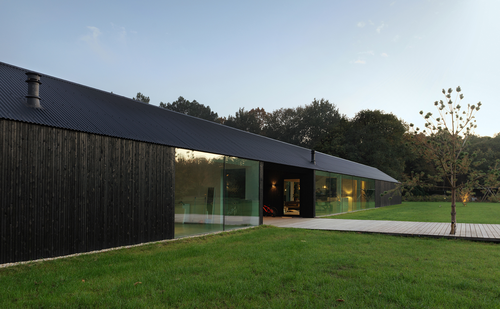 De woning bevindt zich op een fraaie locatie in het buitengebied van Schijf. Het kavel in een bosrijke omgeving heeft het bijzondere concept van de woning bepaald. De woning staat radicaal als een langwerpig en slank element van 46 meter in het landschap. Bewegen in de woning is als een wandeling en biedt steeds bijzondere perspectieven op de natuur die het huis aan alle zijdes omgeeft. De woning bestaat uit twee separate bouwdelen onder een doorlopend dak. Daardoor ontstaat een functionele scheiding tussen de woning en het gastenverblijf annex werkatelier. In het open tussengebied bevinden zich de beide entrees en ontstaat een prachtig ingekaderd perspectief op het achterliggende landschap. De elementaire vorm van de woning refereert aan de archetypische landelijke vormentaal in de omgeving maar neemt tegelijkertijd een kritische houding in ten opzichte van stereotype landelijke architectuur. Met een beperkte budget en zonder hoofdaannemer is een woning tot stand gekomen die volledig aan de bijzonder wensen van de opdrachtgever voldoet.
