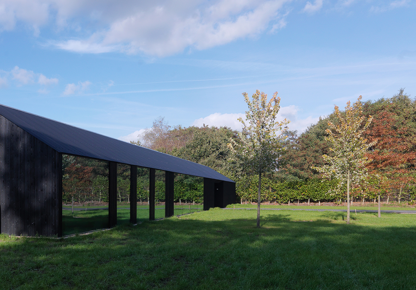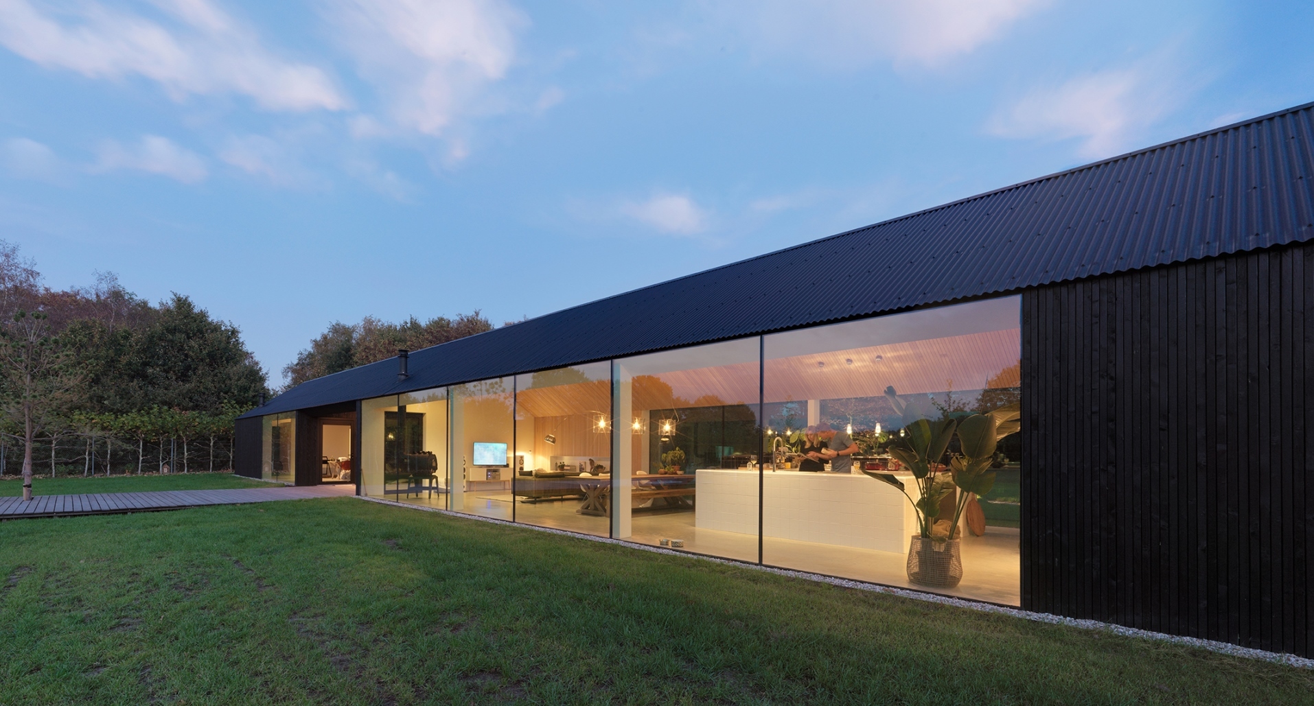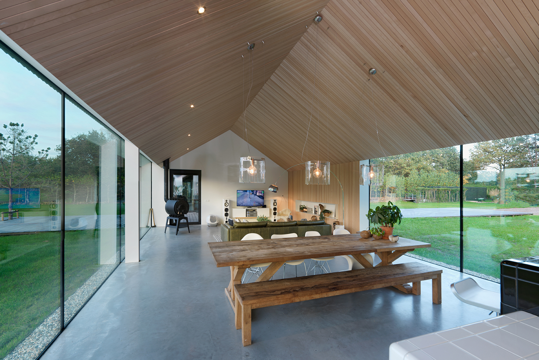 De woning reageert op geheel eigen wijze op de context door de positie van het gebouw midden op het kavel. Vanuit iedere positie in het huis is er zicht op de omgeving en wordt het landschap door de grote glasvlakken naar binnen getrokken. Ondanks de rigoureuze positie krijgt het huis iets exhibitionisch maar de afstand tot de openbare weg en de positie van de ramen en gesloten delen zorgen voor de juiste balans van openheid en privacy. De opening dwars door het huis scheidt hoofdprogramma en bijgebouw maar wordt door de bewoner beide intensief gebruikt. In het bijgebouw spelen de kinderen op een regenachtige dag of houdt de opdrachtgever workshops met klanten. Vanuit de keuken biedt het huis het mooiste perspectief op zowel de voortuin als de achtertuin.
