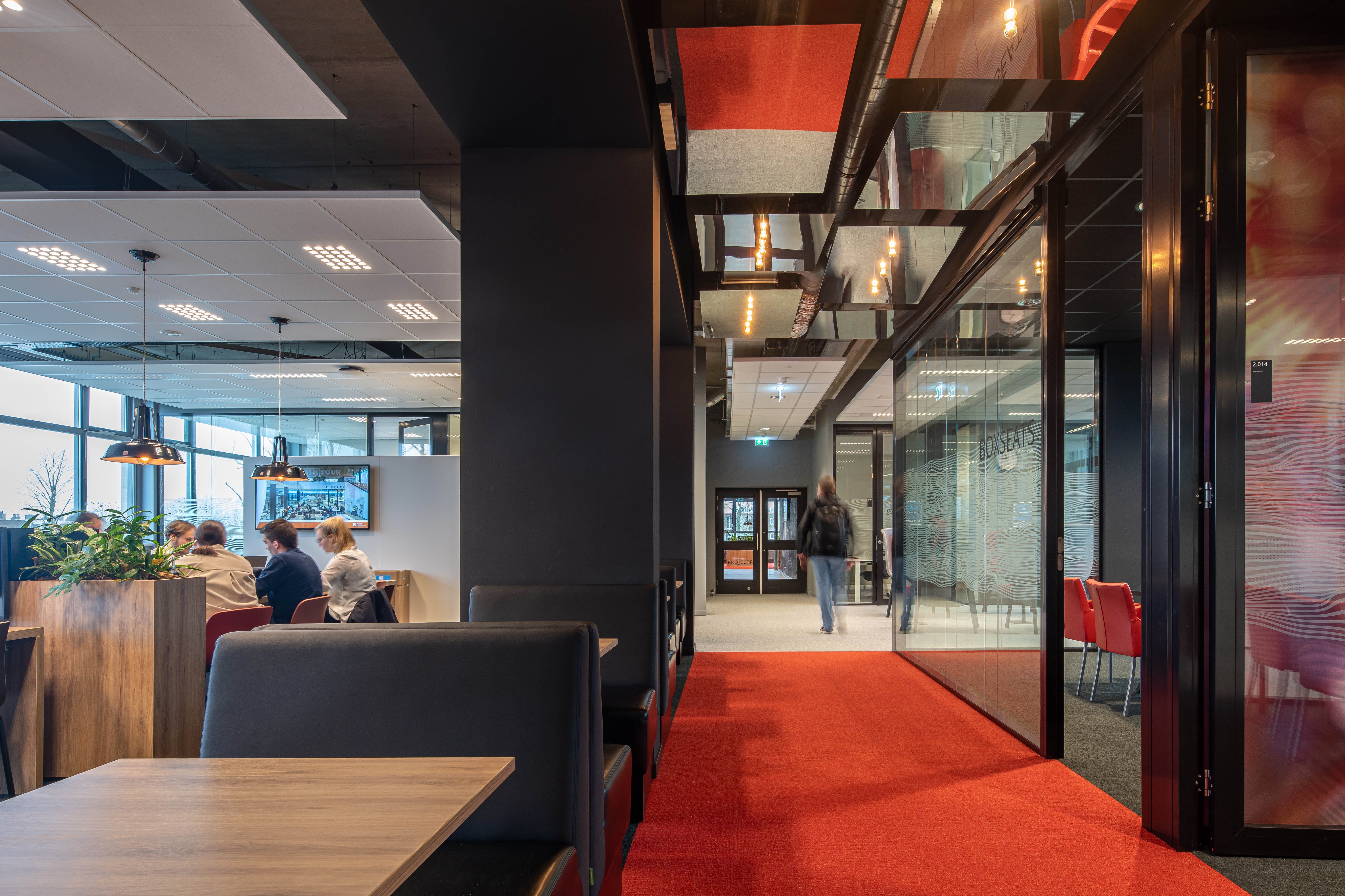 In Frontier ontwierpen we gamelabs in de voormalige collegezalen op de bovenste verdieping. Het gebouw zelf is een aaneenschakeling van zones, waar je zelf kiest waar je het liefste werkt. Docenten en studenten delen café en werkplek, de sfeer is open, informeel en ademt het allure van een internationale campus.