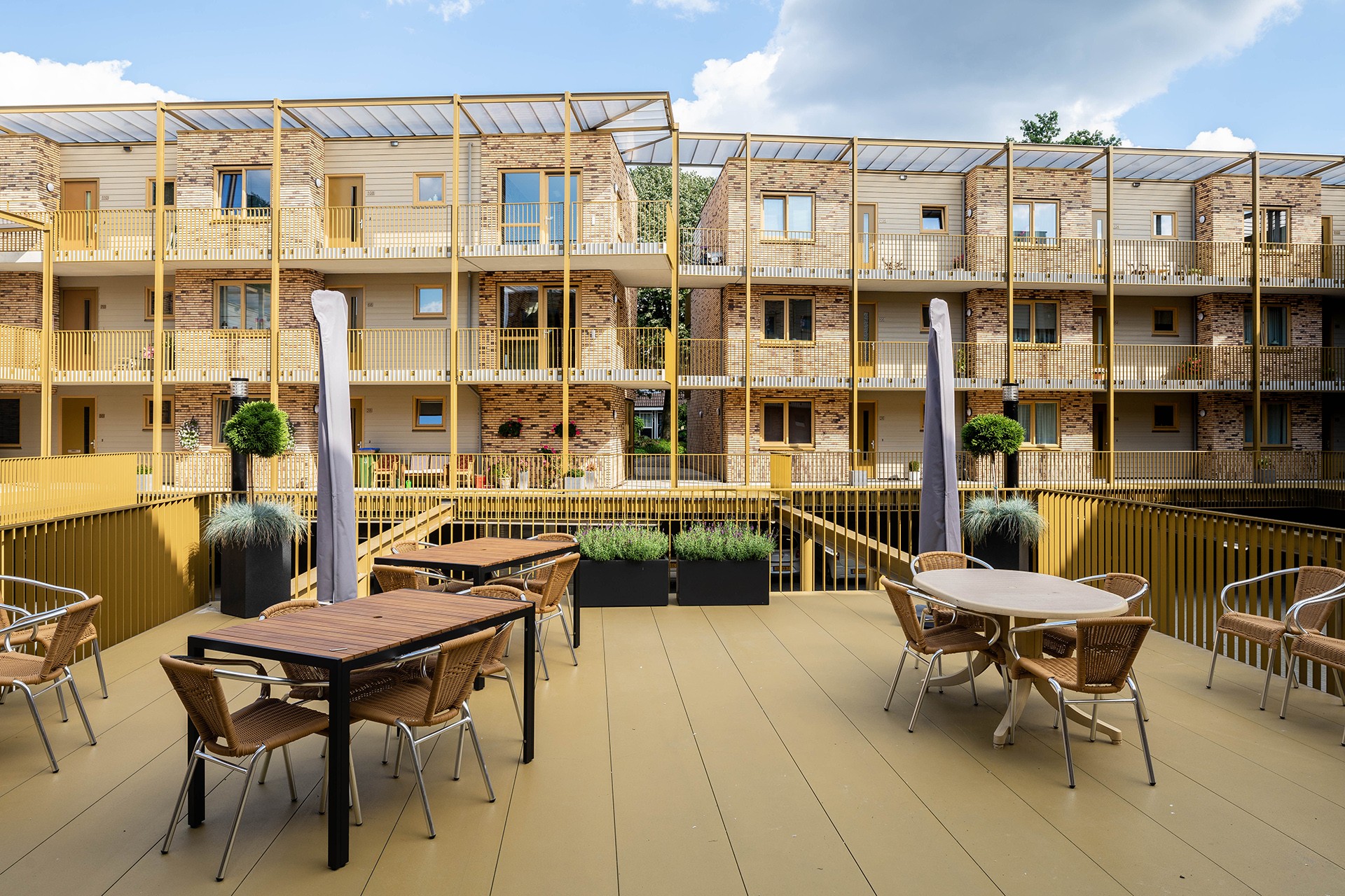 De zelfstandige driekamerappartementen zijn toegankelijk voor elektrische rolstoelen, met voldoende vrije doorgang en een draaicirkel van 2m20 in de badkamer en hoofdslaapkamer. Eén appartement, op de begane grond, aan het pleintje, wordt gehuurd door zorgpartij Vilente. Hier is een gezellige ontmoetingsruimte gemaakt, van waaruit ook meteen thuiszorg wordt verleend.