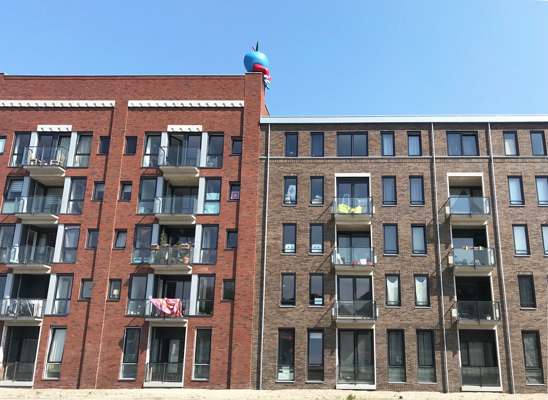 Op een paar prominente zichtlijnen heeft Piet Parra 3tal kunstwerken gemaakt; op het puntje van het dak rust de appel uit van zijn vlucht voor de zwerm spreeuwen (zo werden pakhuiswerkers genoemd) die achter hem aan zit.