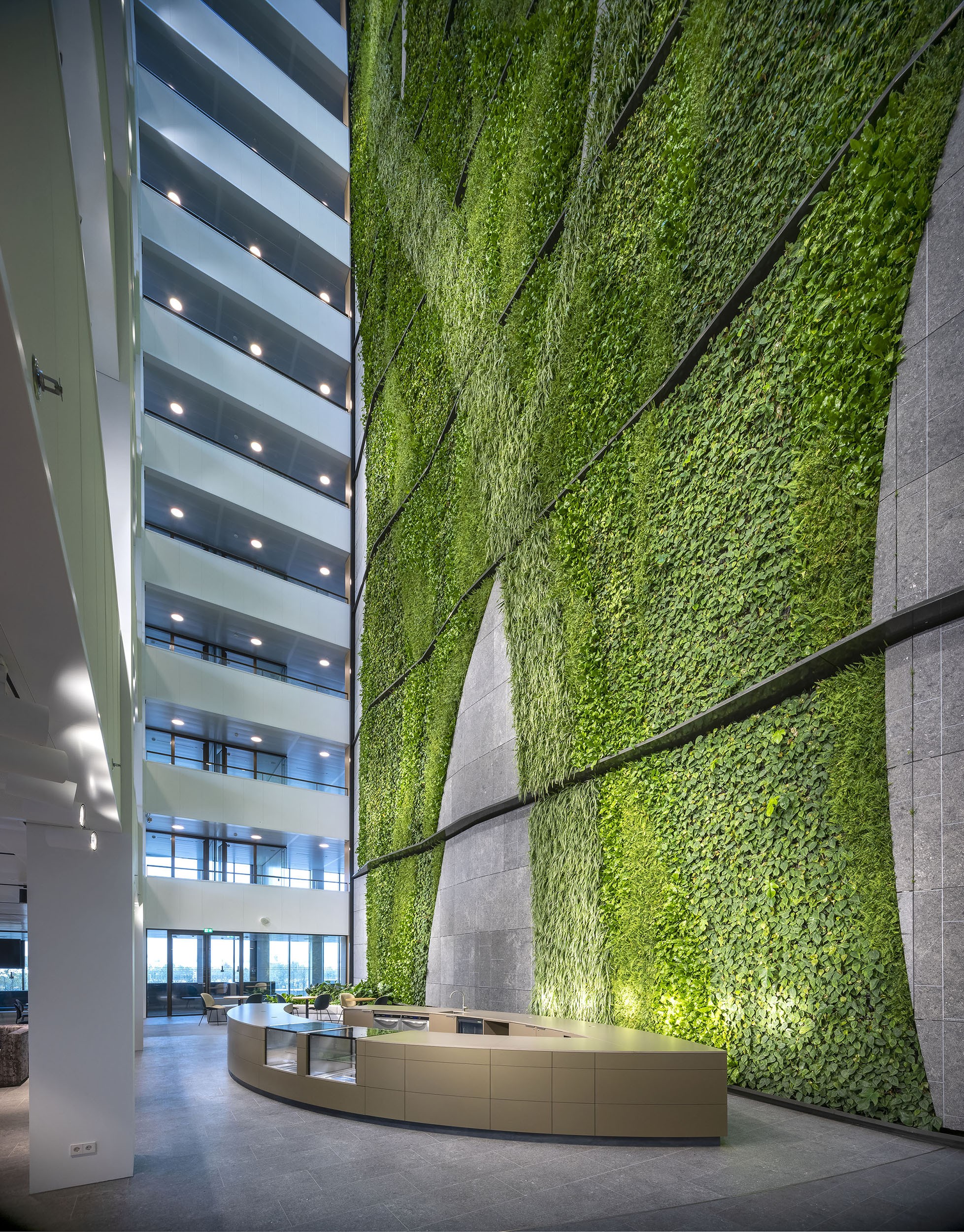 Een groene golf door het gebouw relativeert de strikte opzet van de architectuur. Het dakterras heeft een weelderige begroeiing. Het groene lint gaat door de koffiebar naar de voet van het kantooratrium. Van hieraf rijst de begroeide wand van de liftkern 60 meter omhoog. Een groene schoorsteen die een unieke kwaliteit aan het interieur geeft. Dit draagt bij aan de esthetiek, de weelderige begroeiing in het kantoor verbetert ook de werkcondities, bevochtigt de lucht, filtert het stof en vermindert CO2. Het verbetert kortom de luchtkwaliteit en zo de gezondheid van de medewerkers. Precies als je van het EMA als gezondheidsorganisatie mag verwachten.