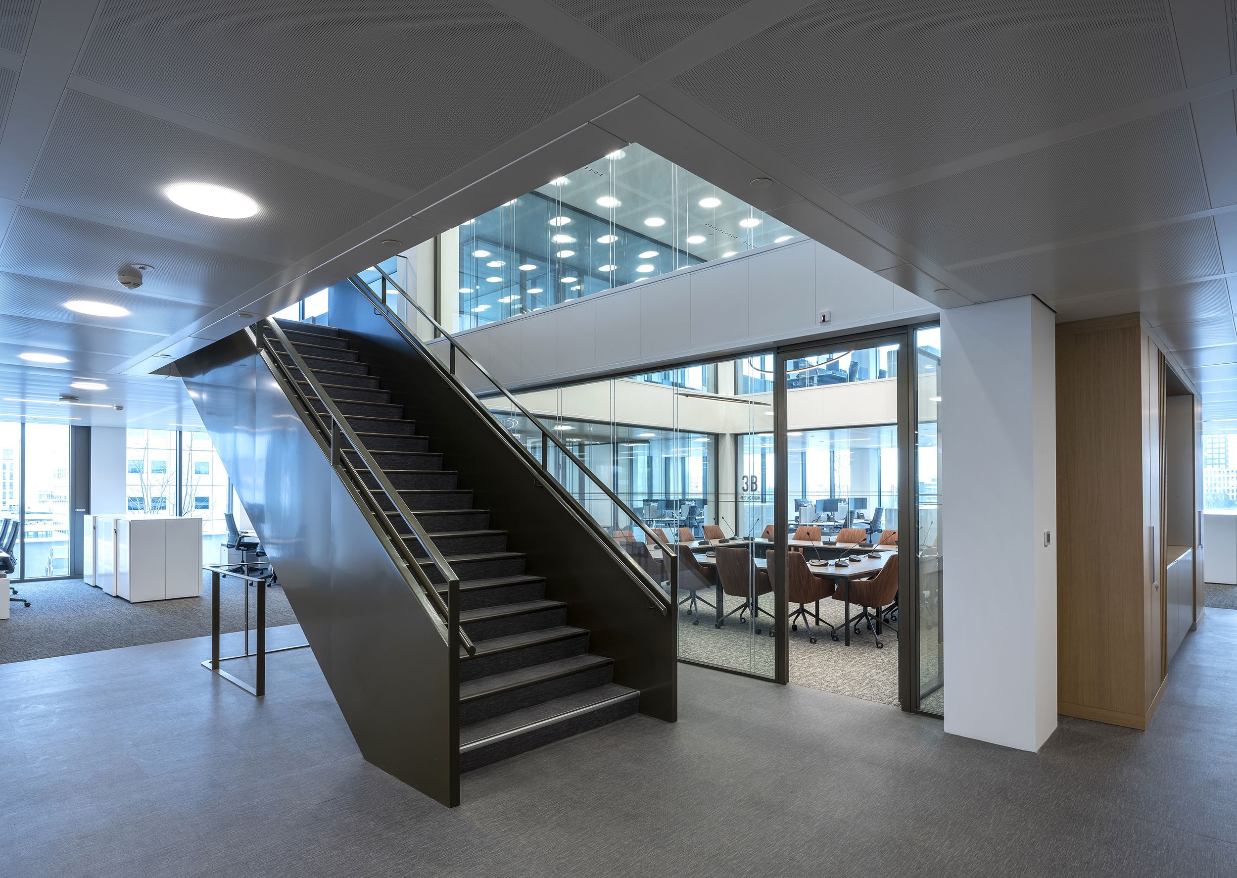 De 1300 werkplekken zijn in een open opzet direct aan de gevel geplaatst om maximaal het daglicht te benutten. In een middenzone is ruimte voor de overlegruimtes en informele overlegplekken.