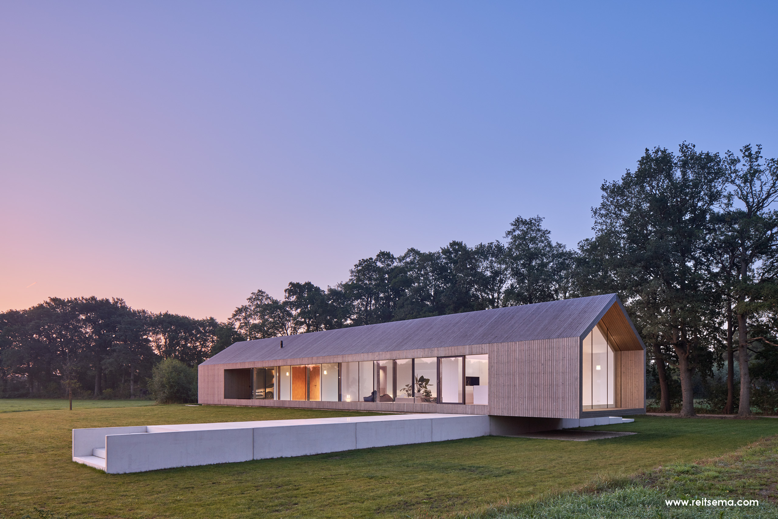 Wanneer je het weggetje afloopt naar de woning, zie je door de bocht in de verte een grote boom staan. Deze boom is als ankerpunt gebruikt voor een drie meter brede verhoogde betonnen plint. De woning is haaks op deze zichtlijn en anderhalve meter boven het maaiveld gepositioneerd, waardoor het een prachtig uitzicht biedt op het Twentse landschap.