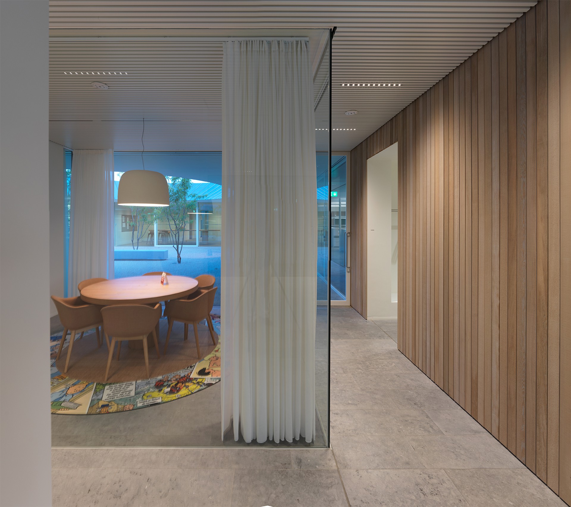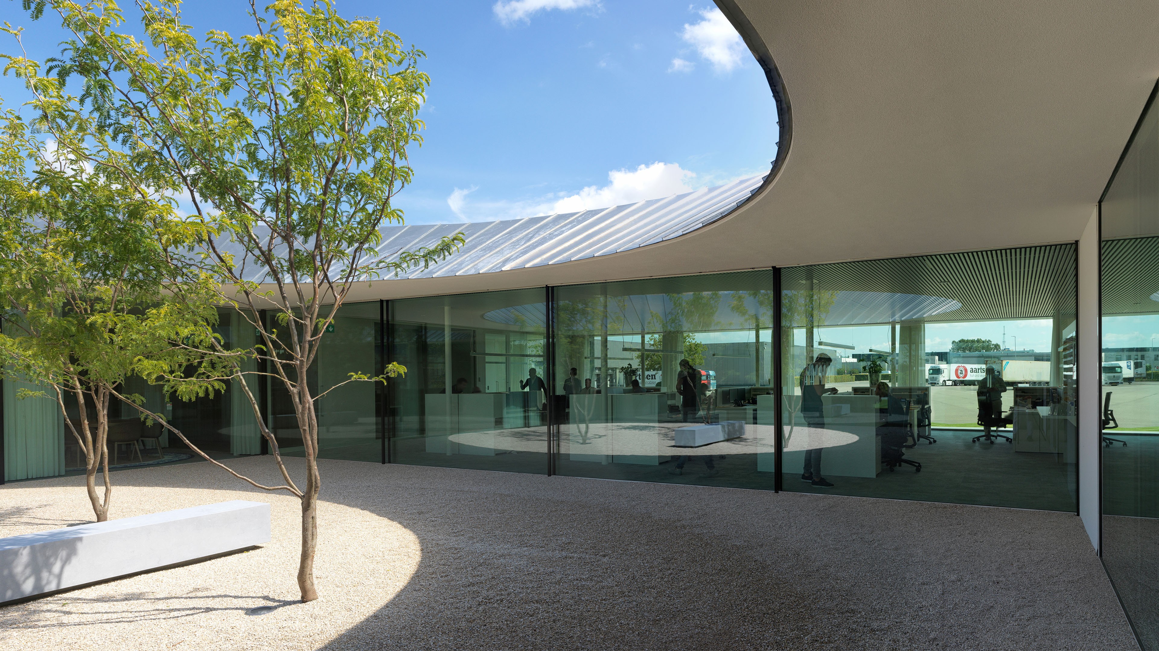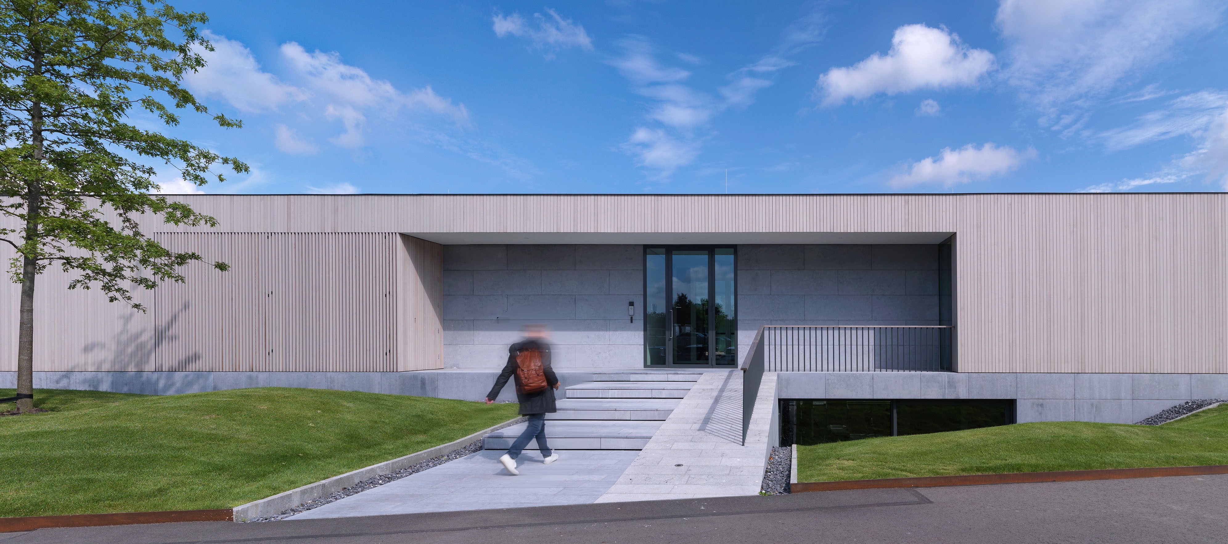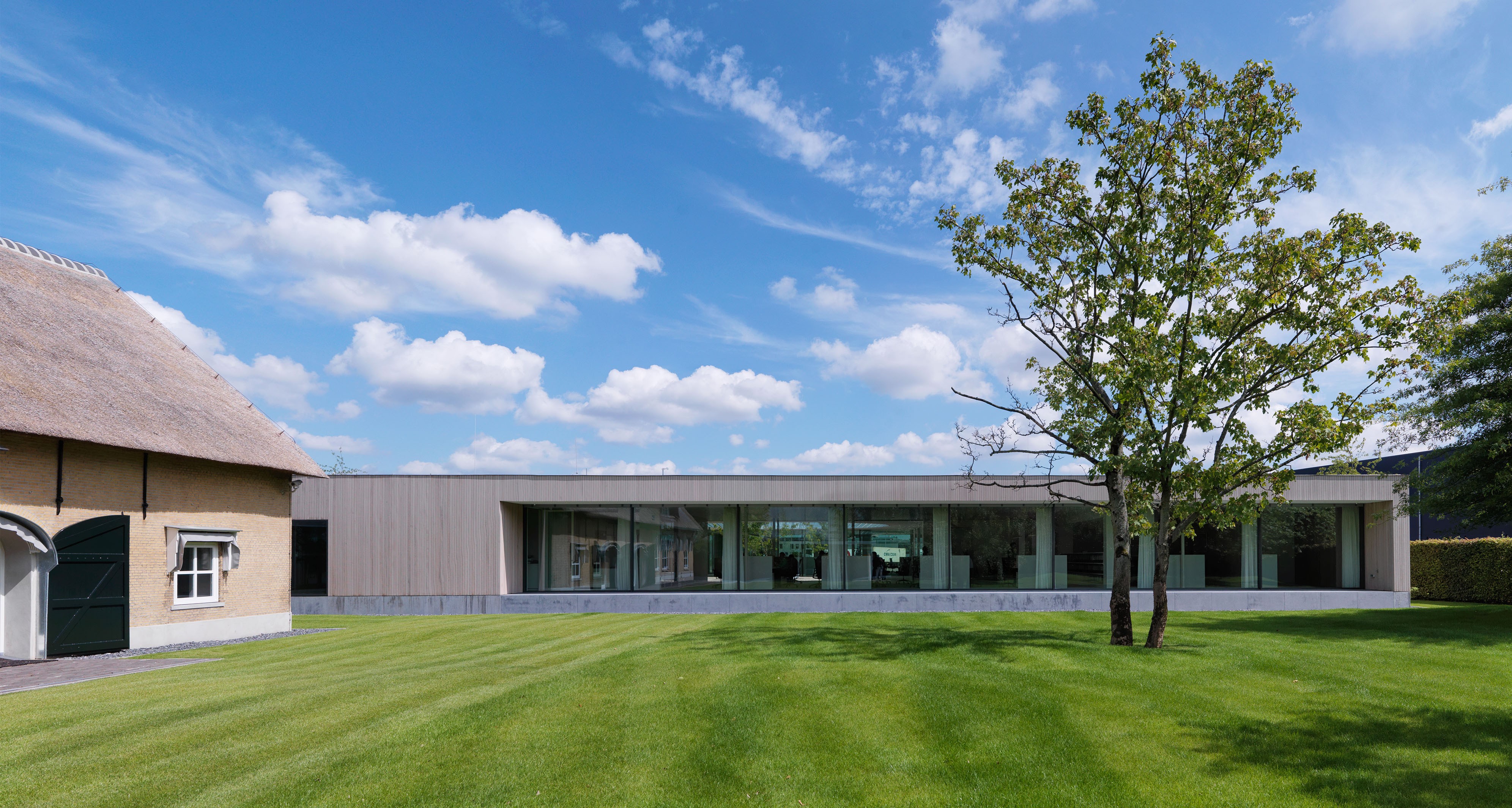 Om het nieuwe programma te huisvesten is de boerderij gerenoveerd en het bestaande paviljoen in oppervlakte ongeveer verdrievoudigd. In het hart van de nieuwbouw is een patio geïntroduceerd waardoor de kantoorvloeren aan weerszijden zijn voorzien van daglicht. De patio introduceert rust en verstilling in het kantoor en stelt de verschillende afdelingen met elkaar in verbinding. Het paviljoen is geplaatst op een natuurstenen sokkel die van buiten naar binnen doorloopt en heeft door langwerpige, diepe insnedes een krachtige verschijningsvorm. Door de gevelafwerking in houten latten ontstaat er in samenspraak met de natuursteen een hoogwaardig kantoorgebouw.