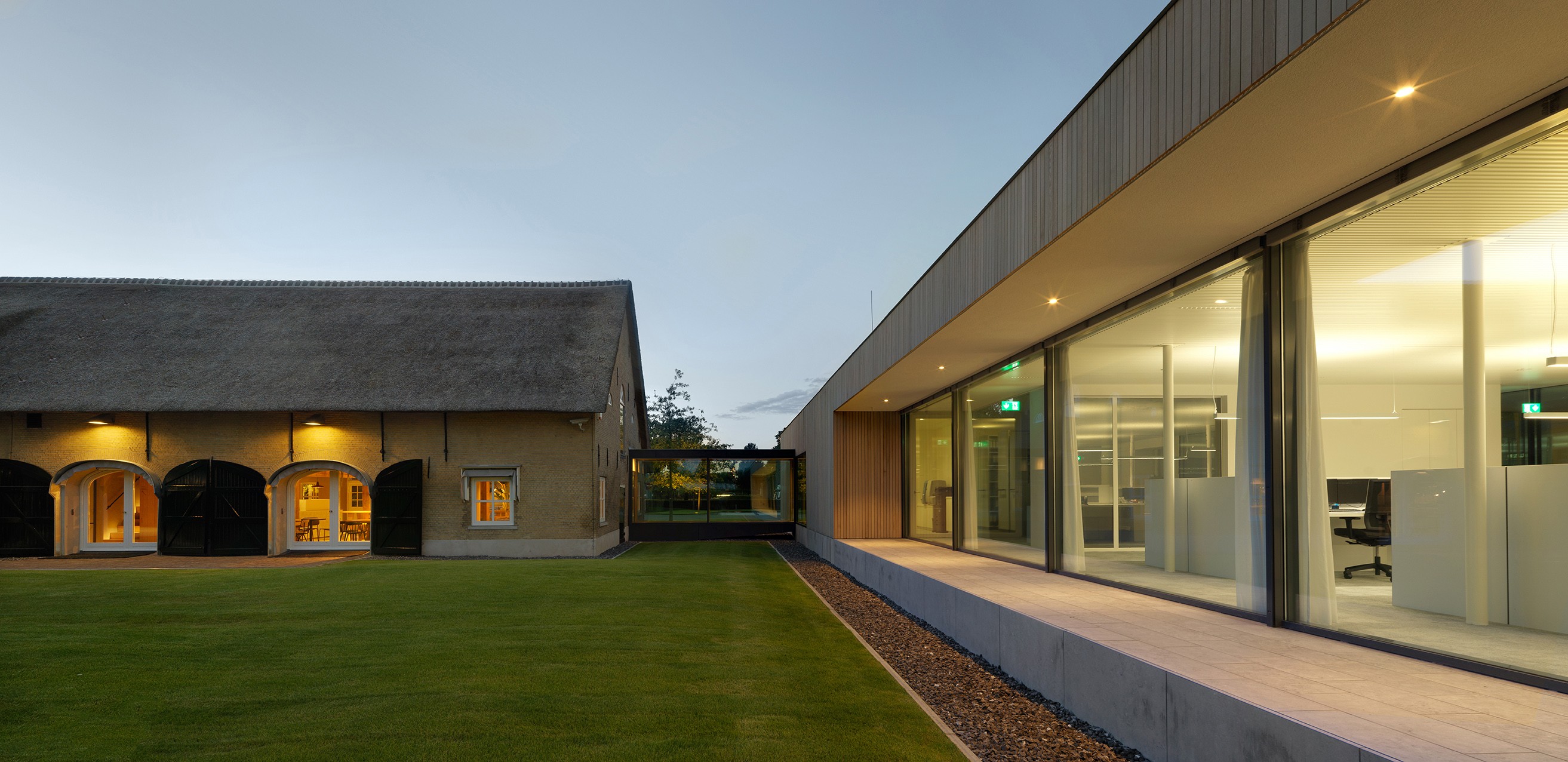 Voor de nieuwbouw is een duidelijke programmatische scheiding aangehouden. Het paviljoen huisvest de kantoorwerkplekken, overlegplekken, de entree en alles wat met de dagelijkse bedrijfsvoering te maken heeft. De boerderij is getransformeerd tot een ceremoniële ruimte waar in verschillende settings informeel overleg plaats kan vinden, waar de medewerkers pauze houden en waar bedrijfsgerelateerde evenementen kunnen worden georganiseerd.