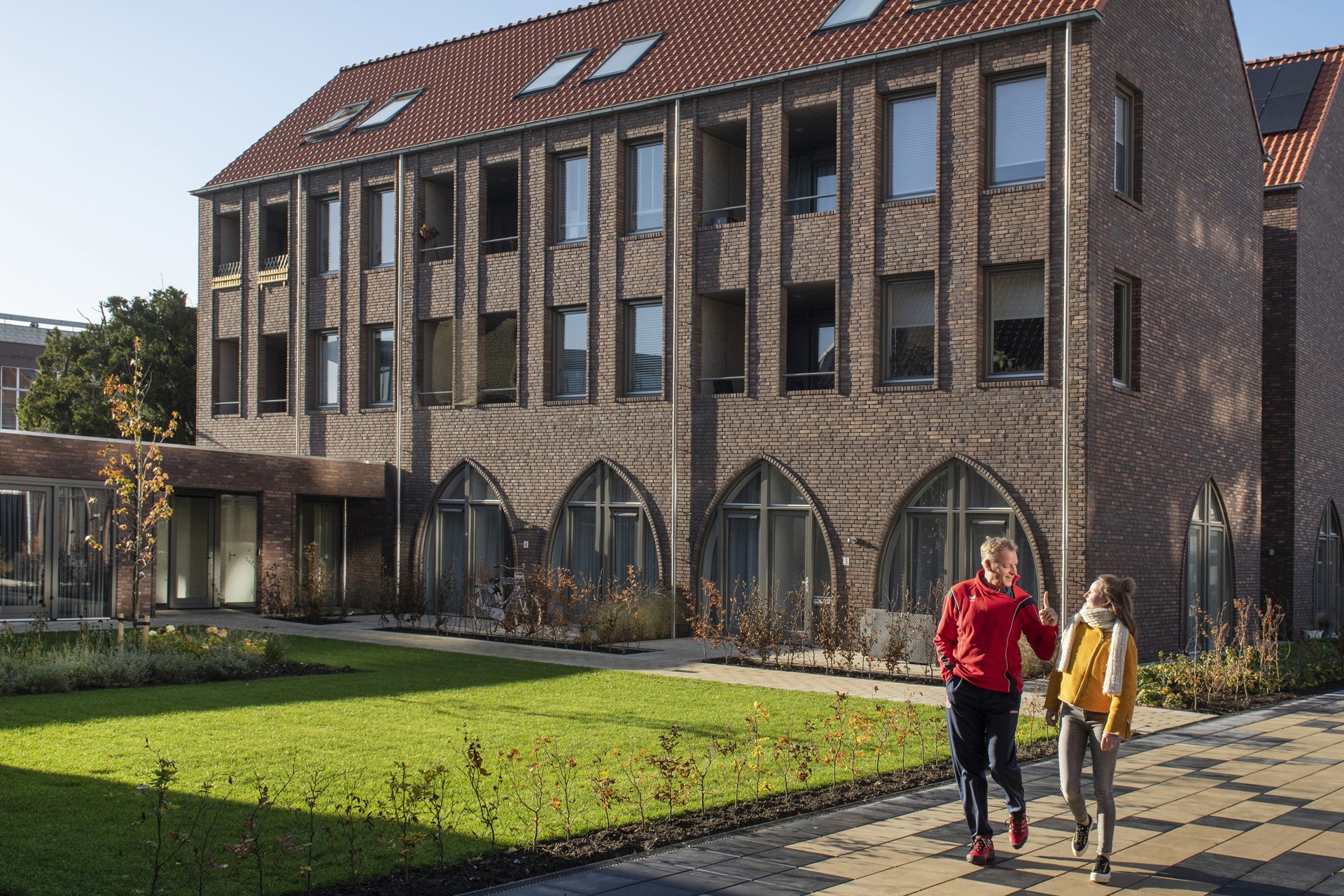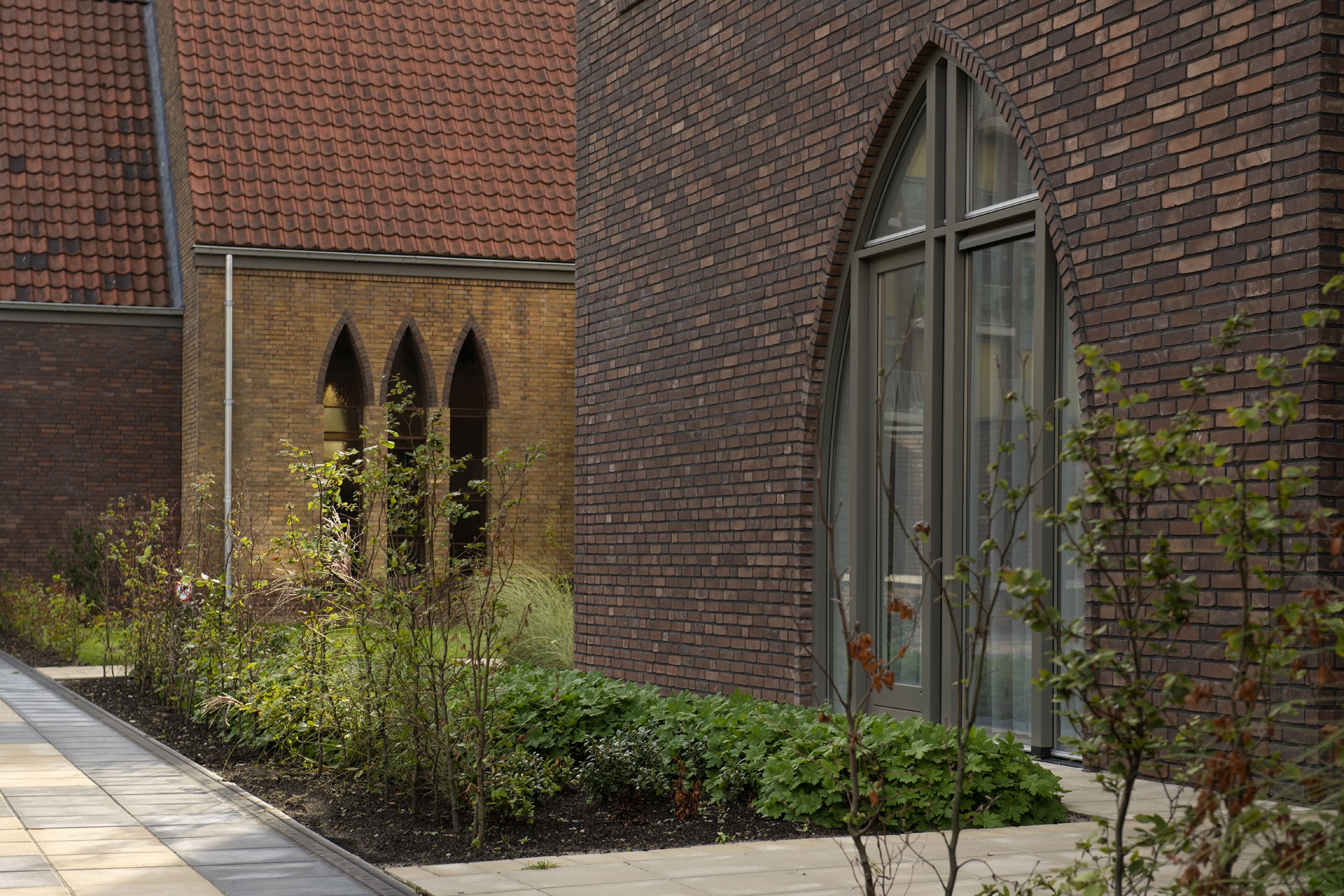 De woningen en een deel van de tuinmuren zijn nieuw en sluiten in vorm, detail en materiaalgebruik zorgvuldig aan op het gerestaureerde deel van het klooster. De spitsboogramen, geïnspireerd op die in het oorspronkelijke gebouw, geven eigenheid aan de woningen.