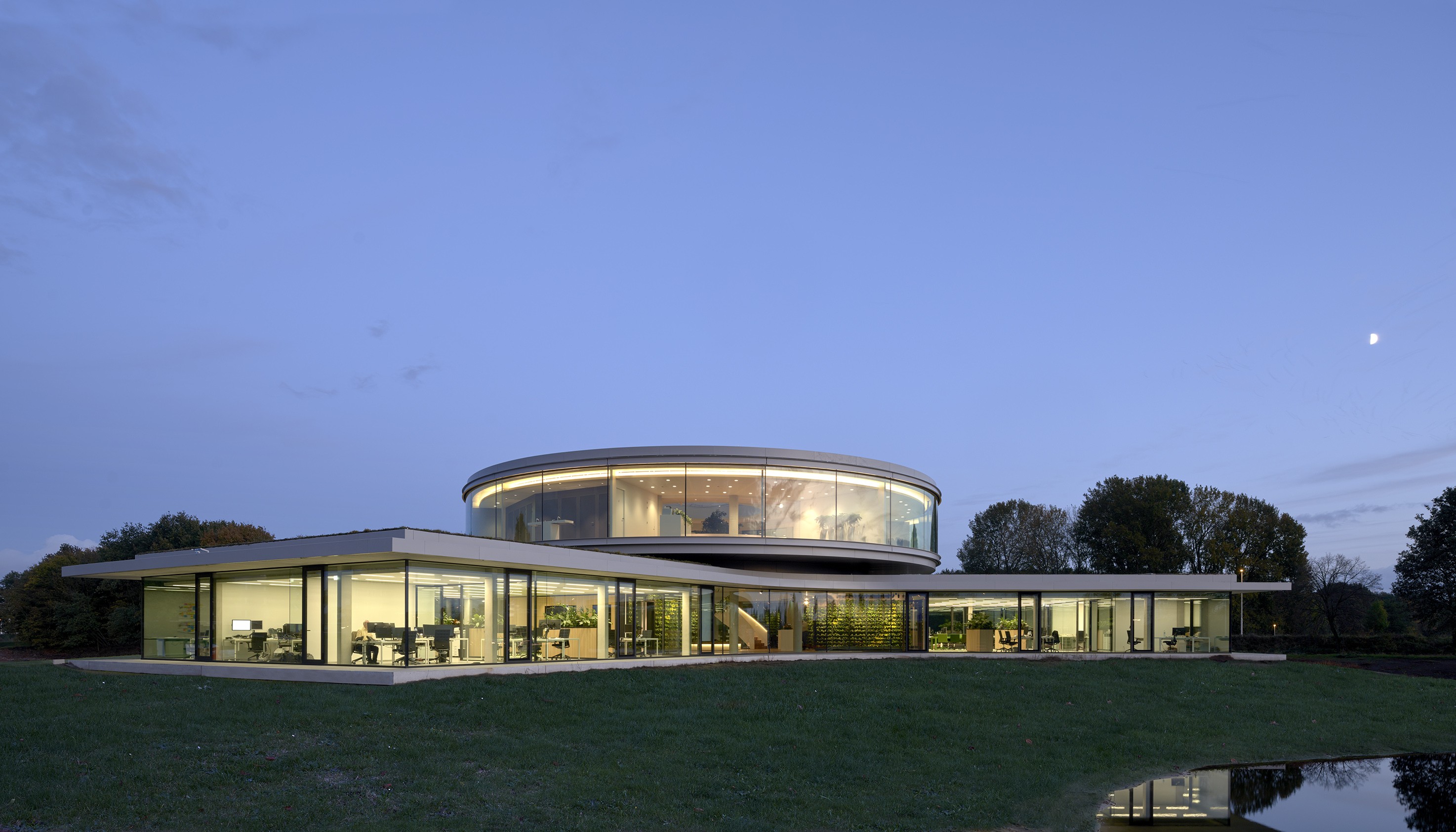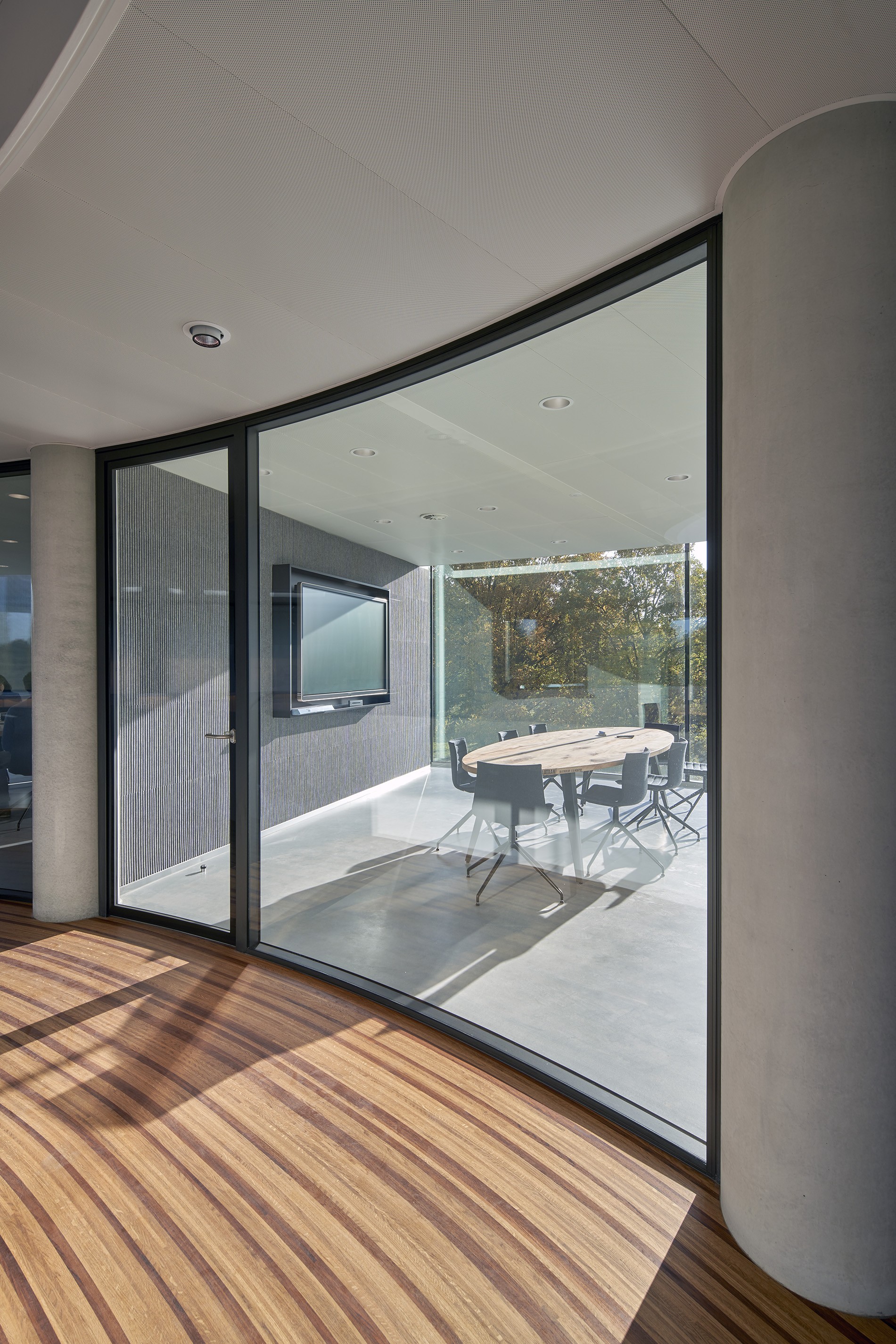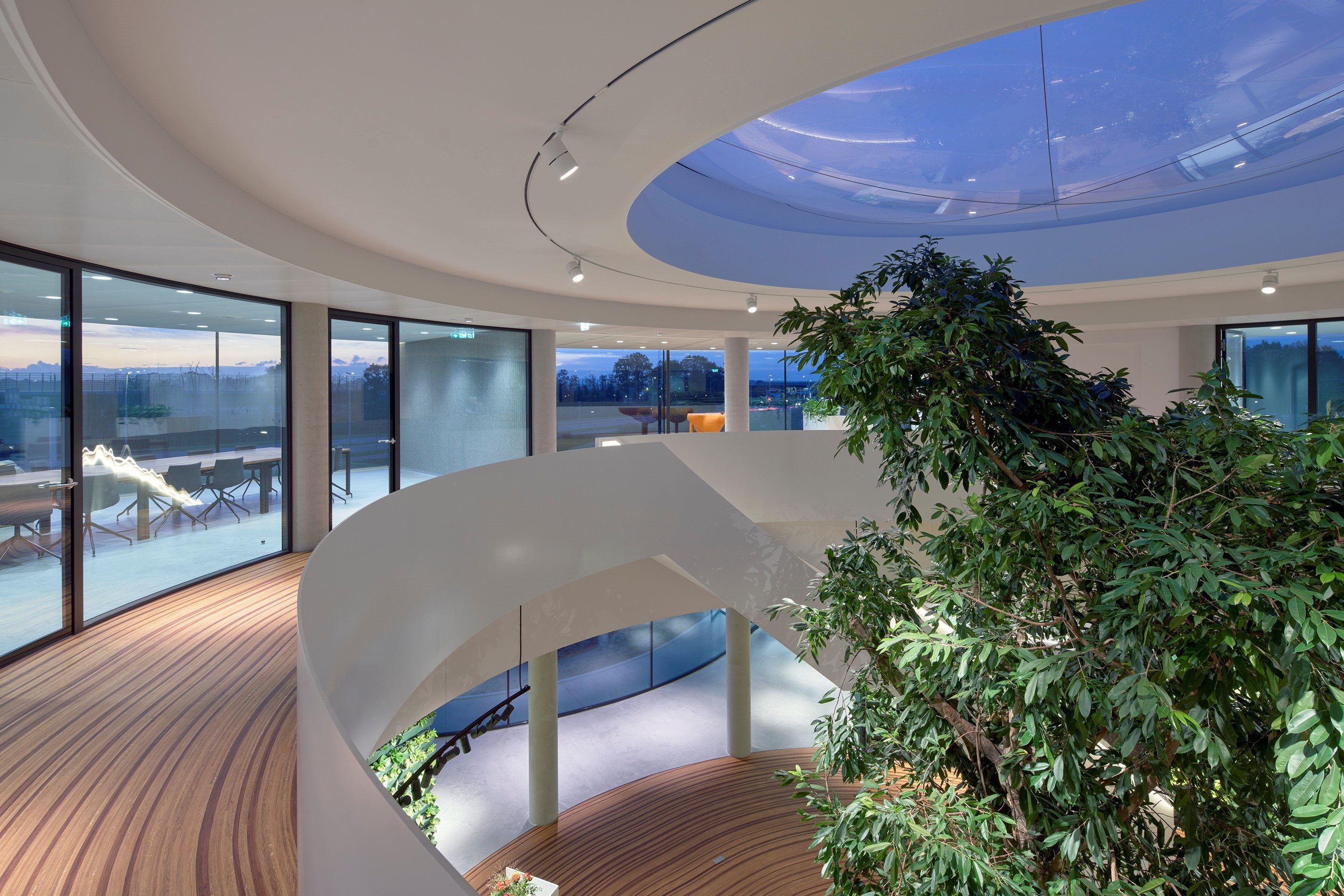 Boven de dakvloer van de begane grond zweeft een ringvormig verdieping met daarin de vergaderruimten. Deze verdieping is voorzien van gebogen ronde glaspanelen. Vanaf hier heb je een weids uitzicht over de zorgvuldig ontworpen landschappelijke tuin. De drie dakvlakken van de begane grond zijn elk voorzien van een ander type klimaat adaptief groendak dat bijdraagt aan het vergroten van de biodiversiteit van het landgoed. Het dak van de 1e verdieping is bedekt met zonnepanelen.