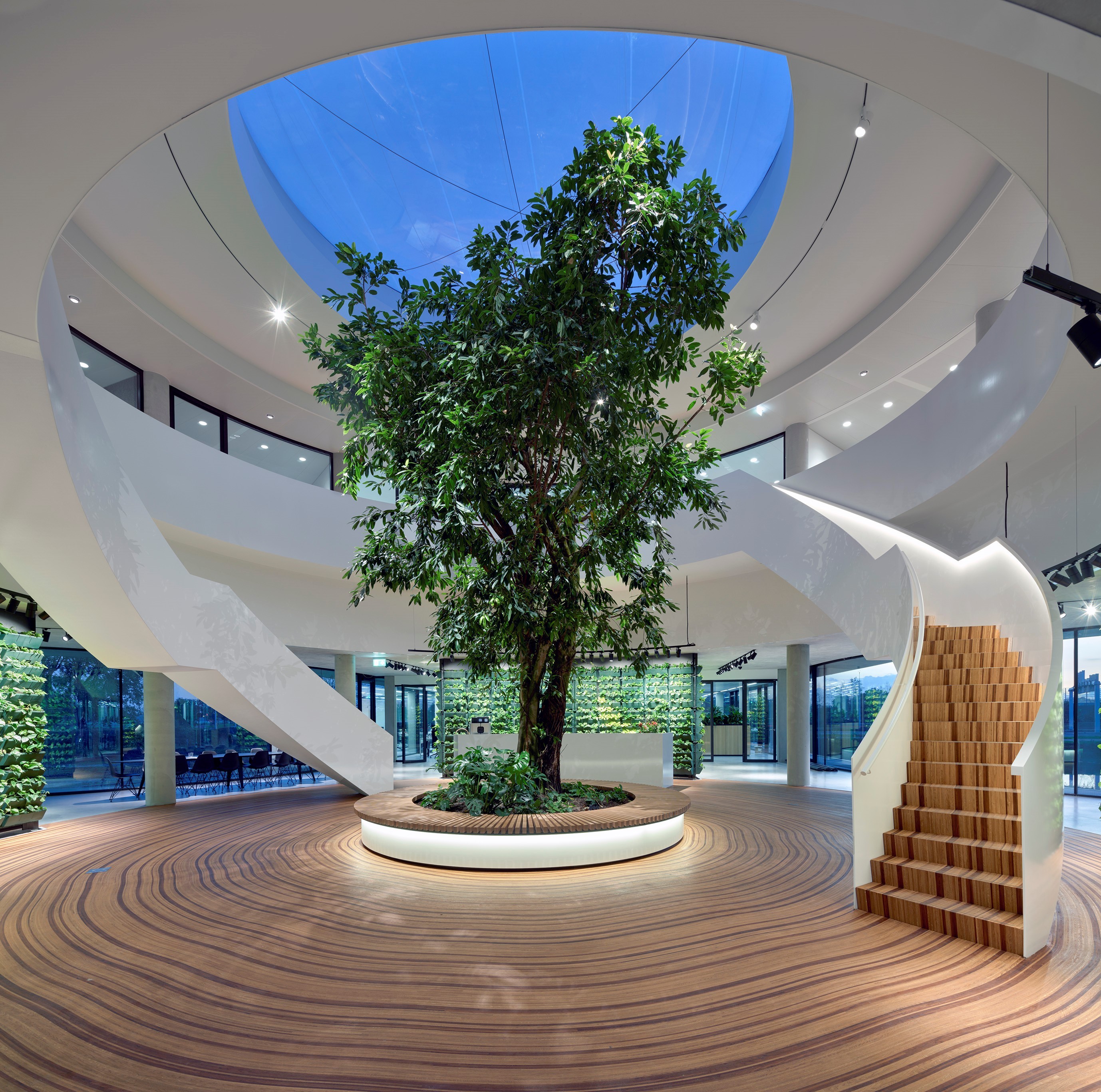 Rijk begroeide klimaat adaptieve groendaken tonen de expertise van de Krinkels Groep en dragen bij aan de biodiversiteit van het landgoed. Weelderige groenwanden en de monumentale boom die centraal staat in het met licht overgoten atrium zetten dit vakmanschap verder door in het interieur. De indrukwekkende sculpturale met hout beklede trappen en exclusieve meubels van inlandse houtsoorten refereren aan de activiteiten van de Krinkels Groep.