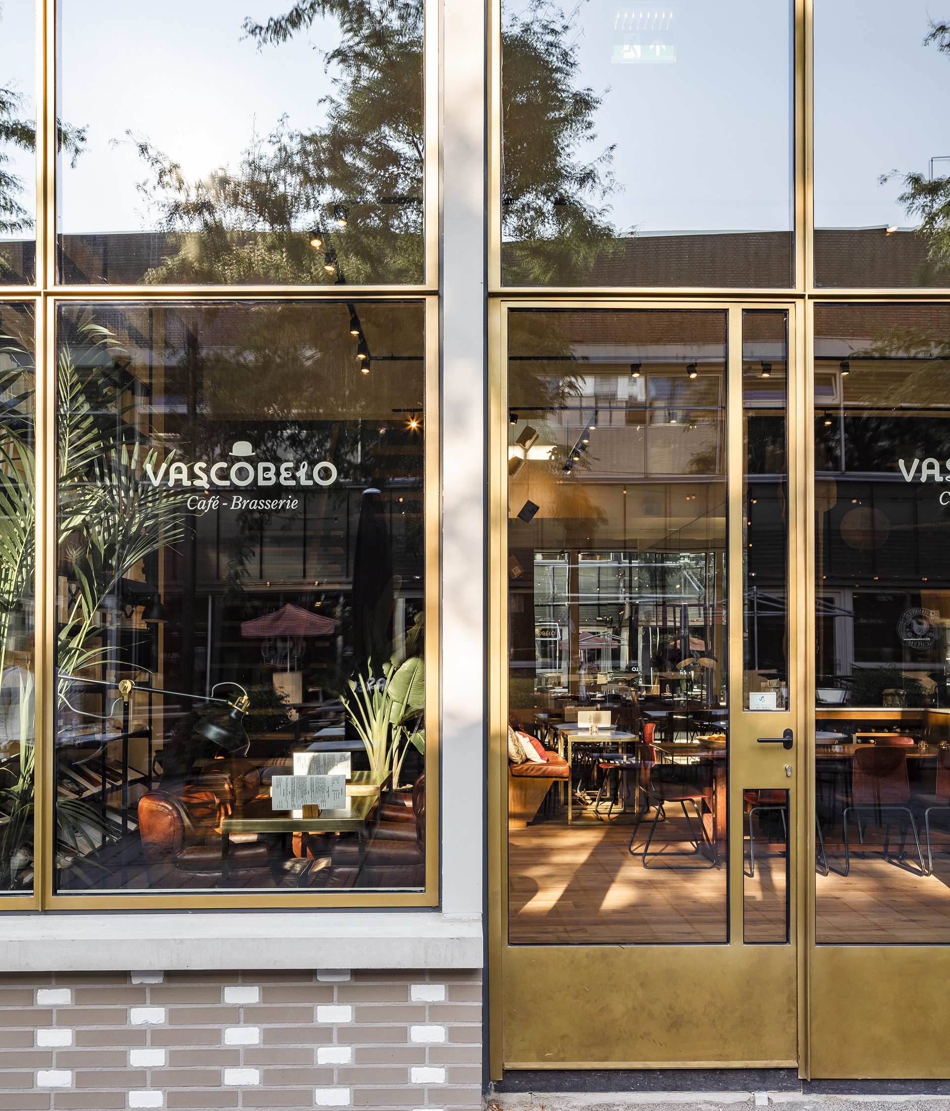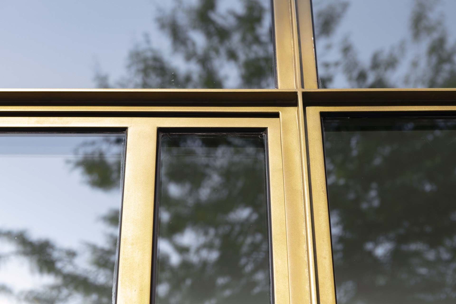 Het beton en de grijze baksteen sluit aan op de bestaande gevel. De nieuwe stalen kozijnen hebben ranke profielen, gelijk aan de oude. De profielen zijn bewerkt met koudgespoten messing, dat behandeld is met zuren, waarmee het een mooie patina glans krijgt. Het combineert goed met het beton en baksteen.