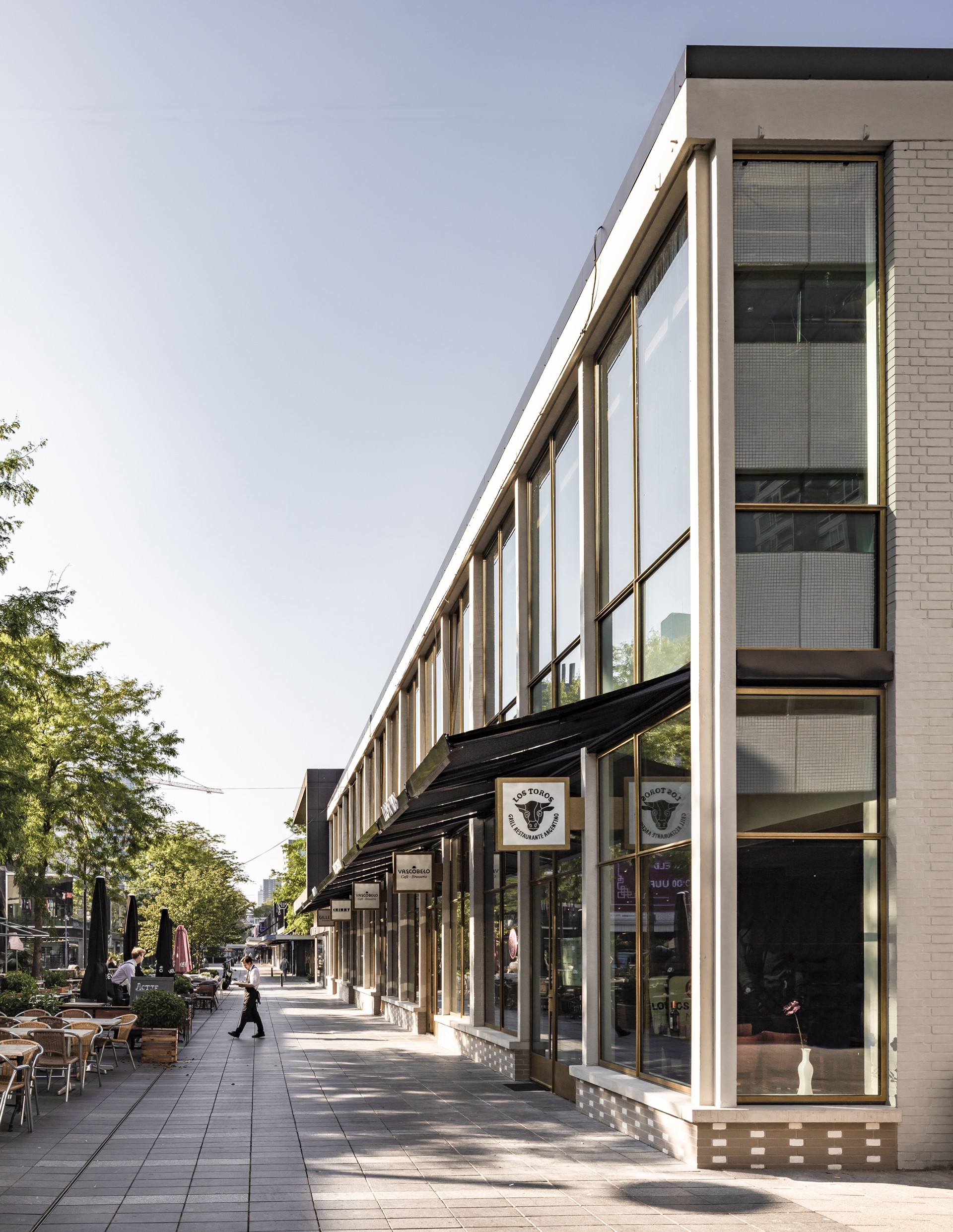 In het nieuwe ontwerp versterken we de al aanwezige typische kwaliteiten uit de jaren ’50 middels het gevelreliëf, steen en beton in een nieuwe architectuur. Met het verwijderen van de luifel is een nieuwe gevel te voorschijn gekomen. Het tweelaagse volume past goed bij de overkant, dat ook twee lagen heeft en geen luifel. Samen met de openbare ruimte vormen de twee volumes een logisch stedenbouwkundig ensemble. De stenen penanten tonen een prettig reliëf, de bijzondere bakstenen plint oogt vanzelfsprekend en de messingkozijnen schitteren in de zon. Er is nieuw leven geblazen in een vergeten stukje stad.