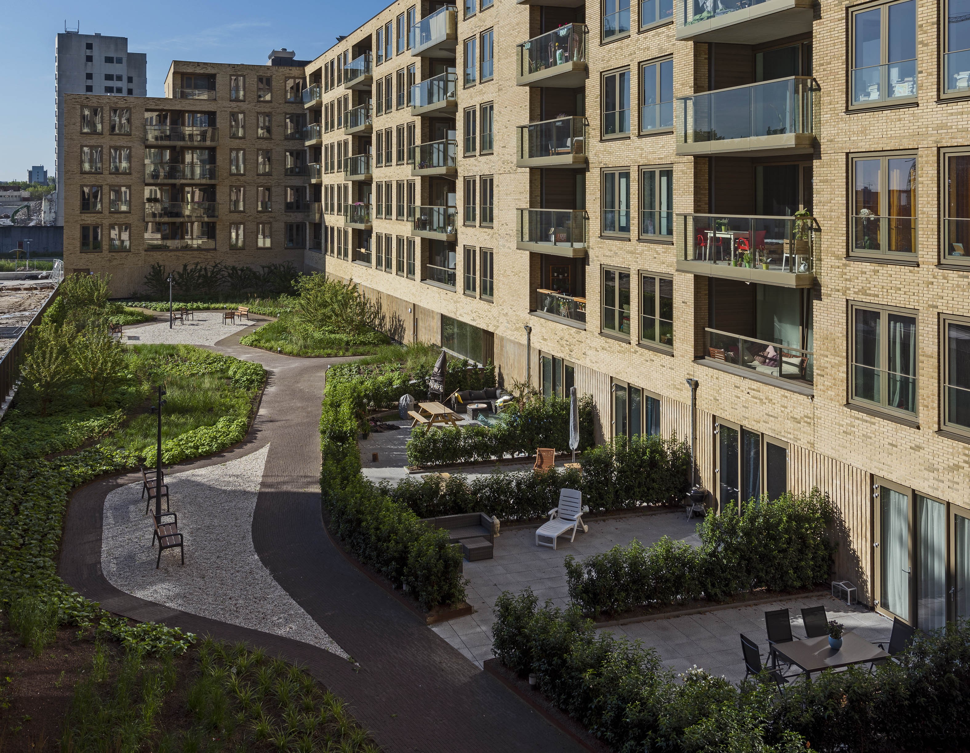 Ondanks de grote schaal van het complex verziet de plint van het gebouw in een zorgvuldige overgang naar het omliggende openbaar gebied door het inzetten van "stadswoningen" met een eigen voordeur aan de straat en een voorziening op de markante kop.