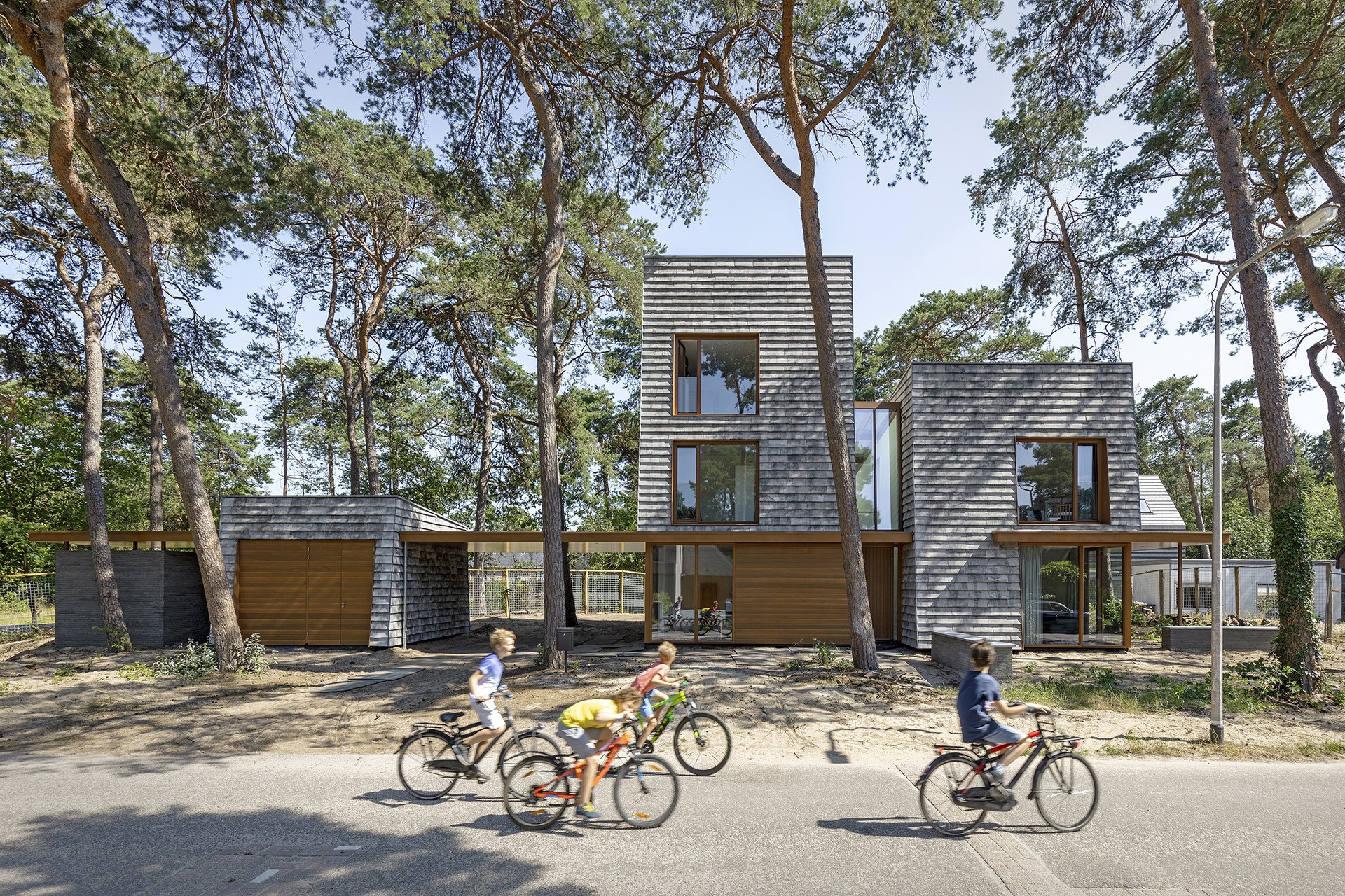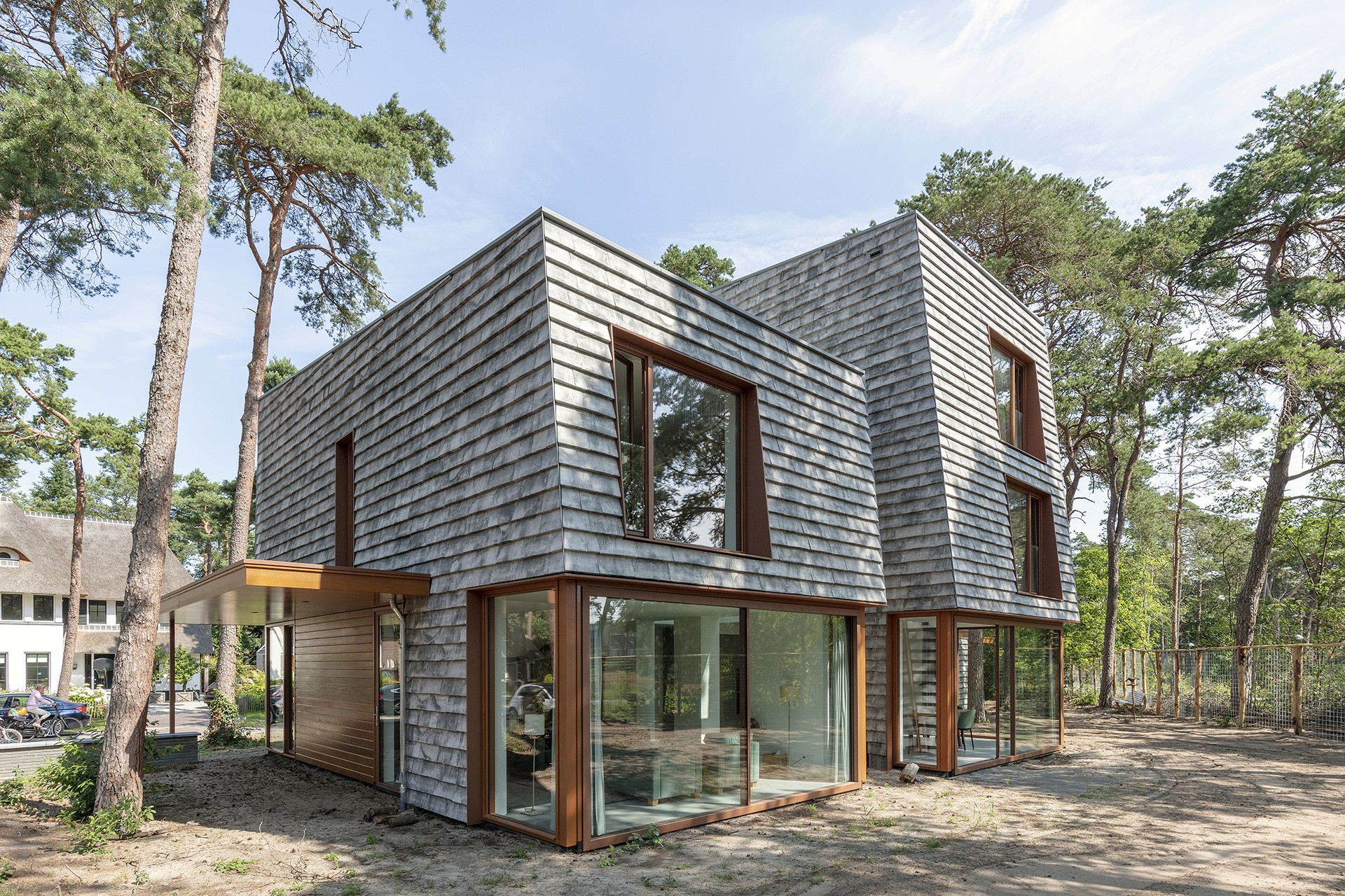 Grenzend aan de Utrechtse Heuvelrug ligt woonwijk Kerckebosch. De woning is gesitueerd op een hoekkavel, langs de rand van het deelplan Hoge Dennen. Het deelplan kenmerkt zich door de voor Zeist karakteristiek bosachtige omgeving en grenst aan een nieuw gecreëerd open heide gebied. Het beeldkwaliteitsplan schrijft woningen voor met een moderne uitstraling en een steile kap. Om de woning optimaal te positioneren op het kavel zijn de bomen op de kavel in kaart gebracht. Er is getracht zoveel mogelijk bomen te handhaven en te integreren in het ontwerp. Om het zicht richting de tuin te maximaliseren en een zo groot mogelijke achtertuin te creëren is het volume langs de hoofdas van de weg gesitueerd, zo dicht mogelijk op de rooilijn.