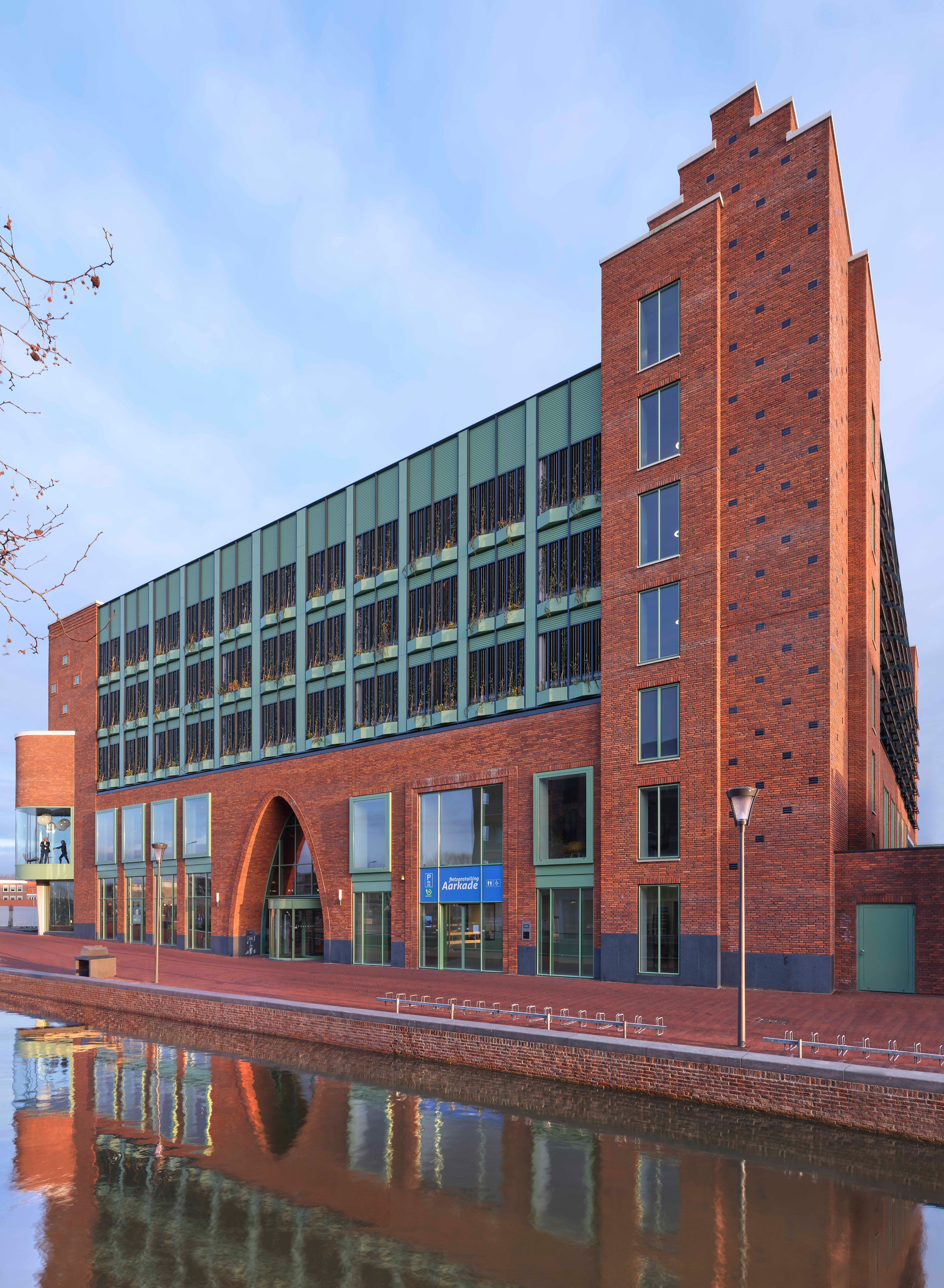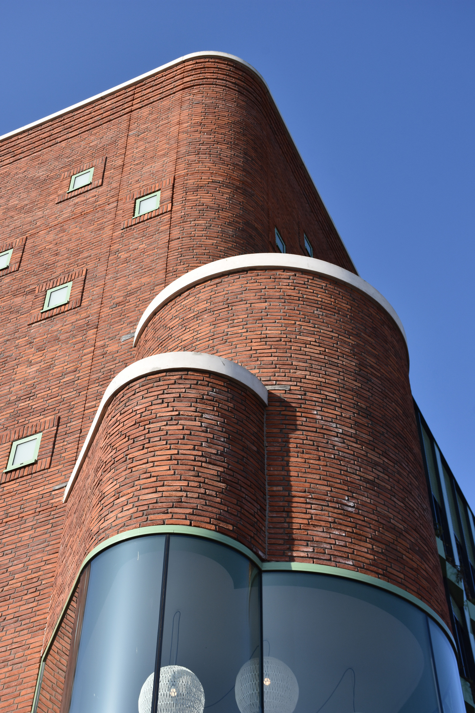 De bibliotheek met parkeergarage is de nieuwe ontmoetingsplek in het transformerende stadscentrum. In schaal beduidend groter dan de omgeving, maar dankzij de warme oranje baksteen, de verticale ritmering en de rijkheid van details wordt de aansluiting gemaakt.