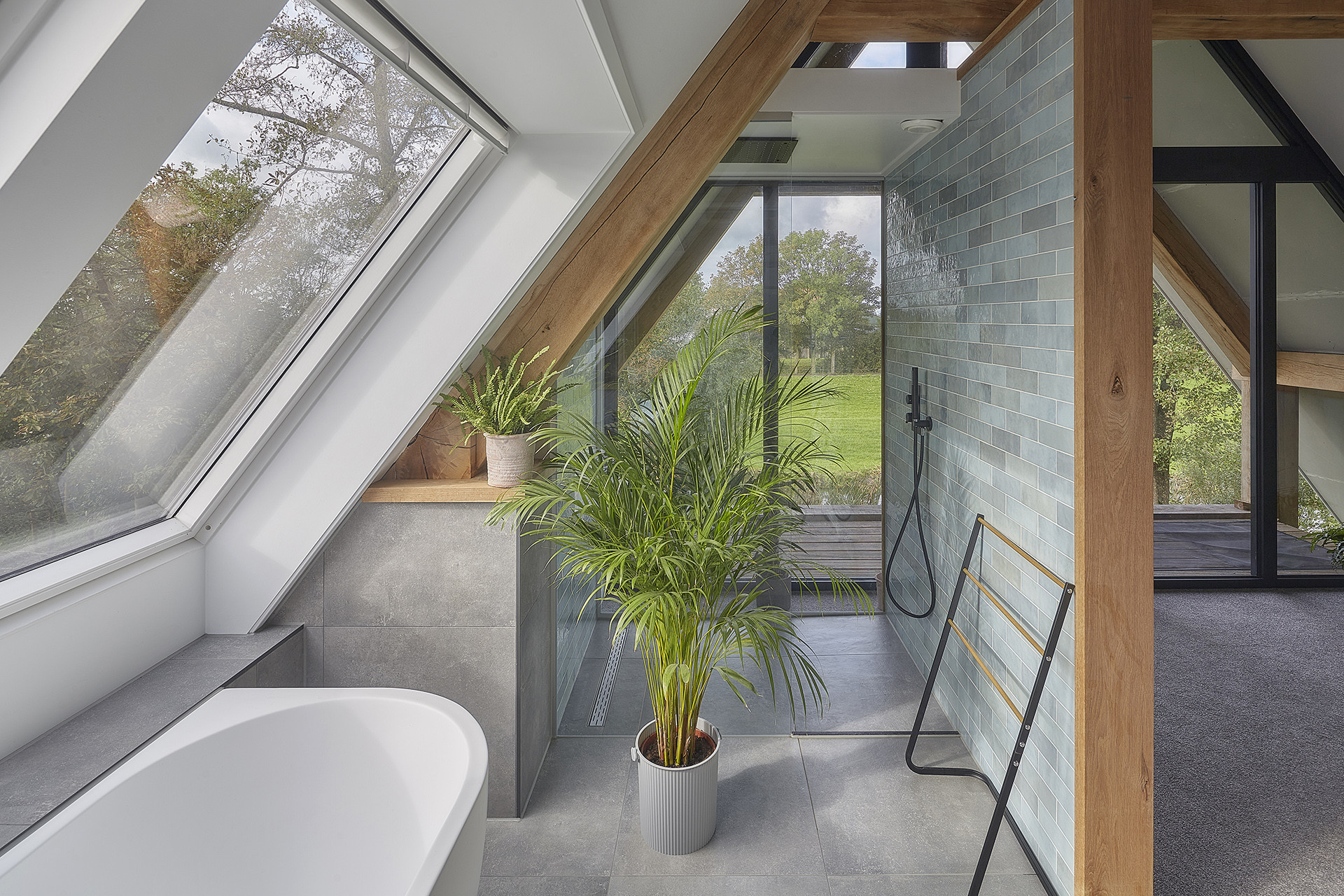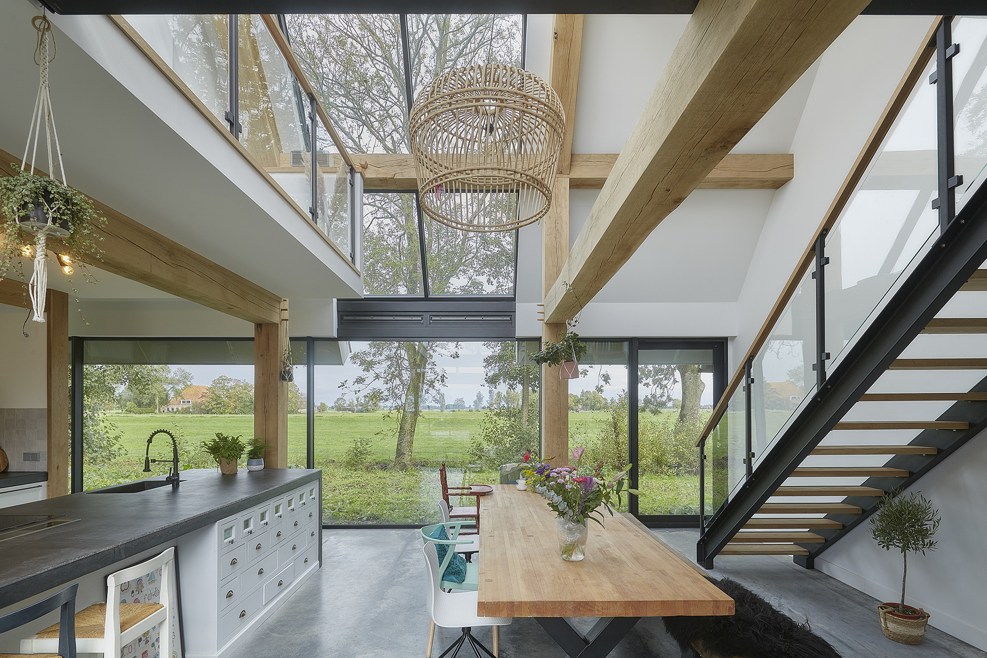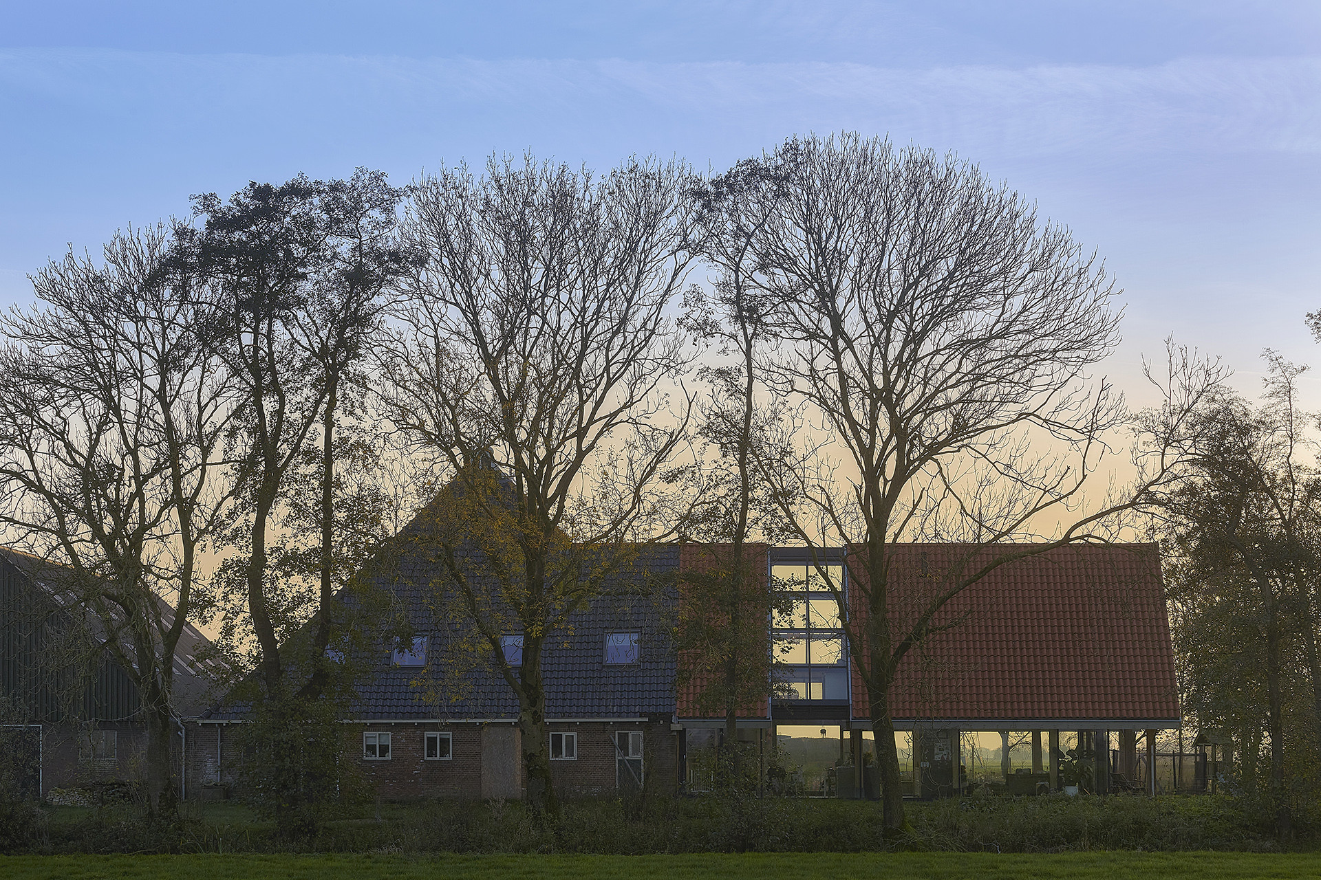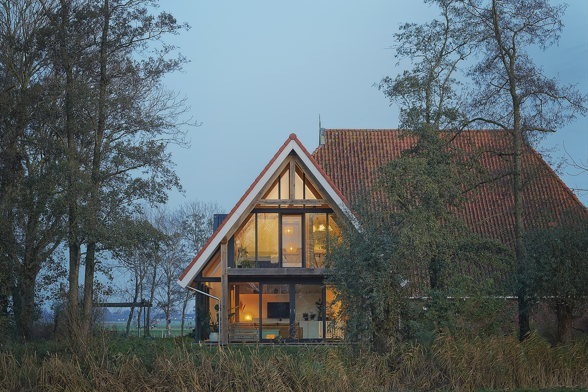 De nieuwe woonruimte is op dezelfde wijze geplaatst als de voormalige kop en hals maar dan in de vorm van een éénduidige kap die, door de glazen buitenwanden, lijkt te zweven in de lucht. De glazen buitenwanden halen het omringende landschap zoveel mogelijk naar binnen zodat de elementen van de natuur vanuit de woning bijna voelbaar zijn. Vanaf een afstandje wekt het de indruk dat de landerijen zich onverminderd doorzetten onder de kap. Een lichtstrook deelt de gehele kap op en versterkt dit effect. De kap wordt gedragen door eiken houten “bynten” die verwijzen naar het oorspronkelijke “byntwerk” van de boerderij.