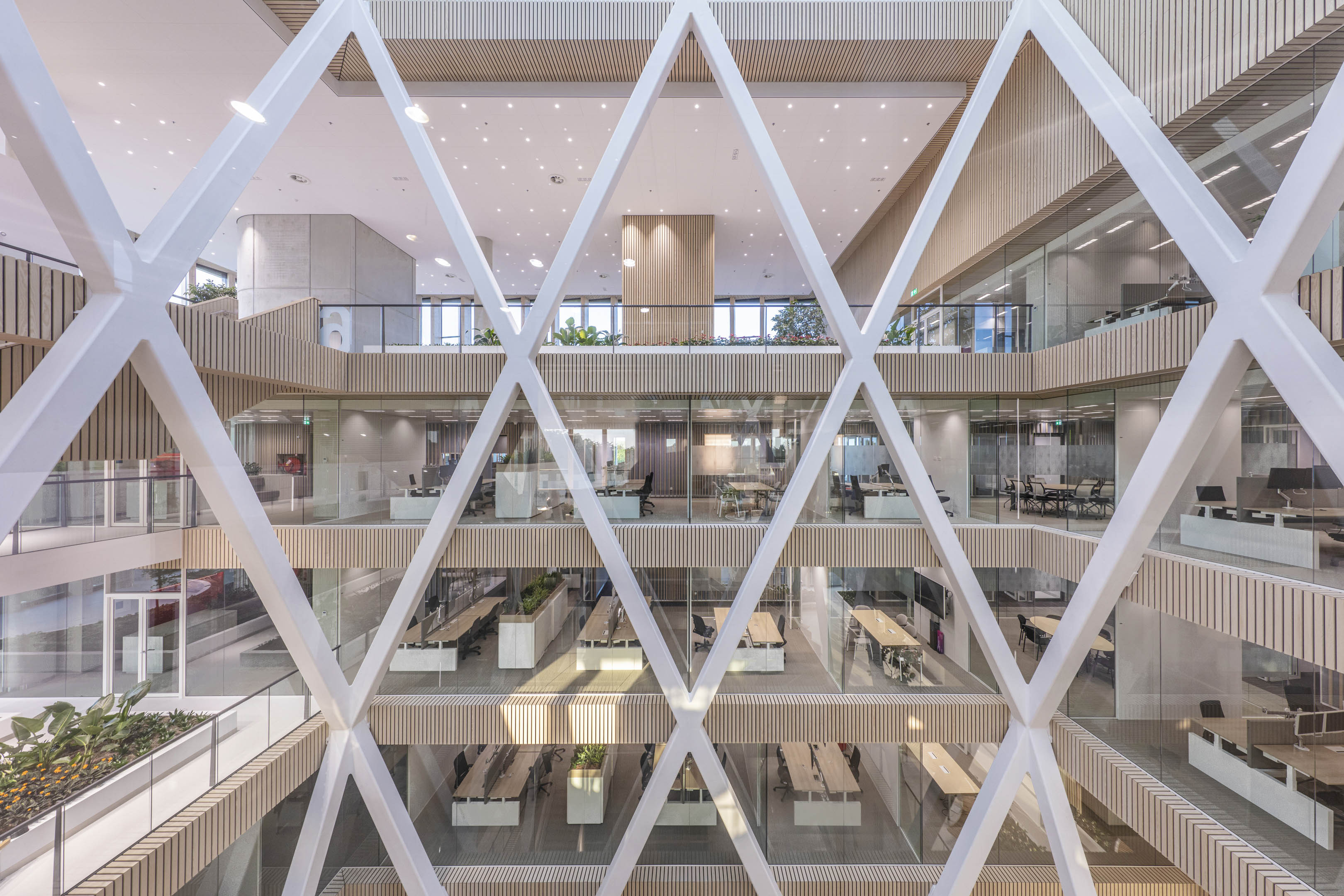 De allure van het gebouw zit in de eenvoud. ‘The Green Landmark’ is acht lagen hoog en zichtbaar vanuit de weide omtrek. Functie en vorm komen samen in een tijdloos en duurzaam icoon. De X-frames in het atrium -die het gebouw dragen- geven het kantoor een imposante uitstraling met een ‘wow’-gevoel.