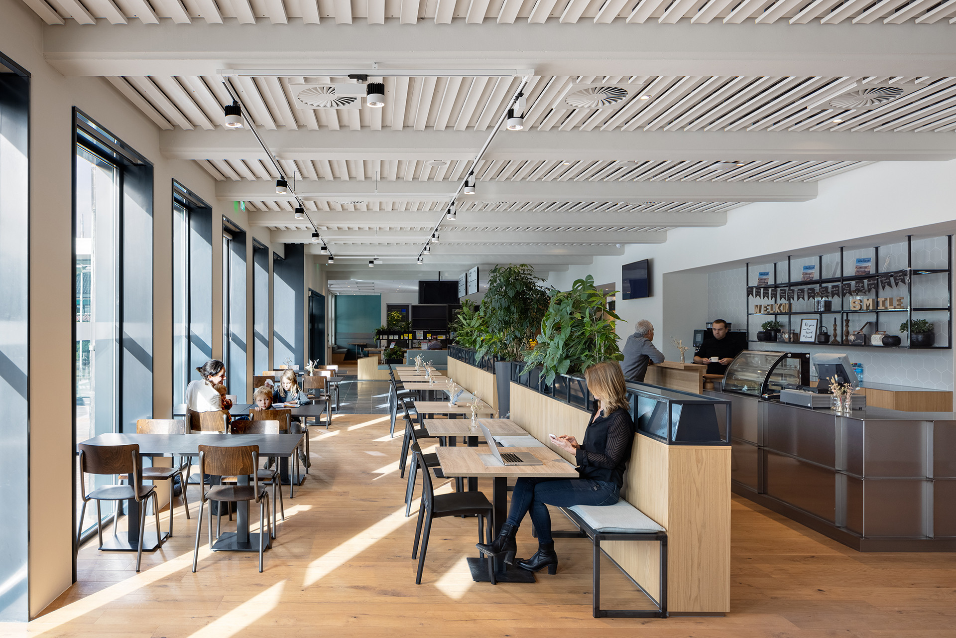 De begane grond is vrij gemaakt voor publieke en maatschappelijke functies met het werkcafé als hart; de plek waar ambtenaren en burgers elkaar ontmoeten bij een kop koffie, met zicht in de transparante raadzaal. Natuurlijke ontmoeting en samenwerking worden gefaciliteerd in de combinatie met de bibliotheek, leerwerkbedrijf Smile, de politiepost en een (ook voor derden toegankelijk) vergadercentrum op de eerste verdieping. Op de eerste en tweede verdieping is de flexibele werkomgeving voor de medewerkers, waar iedereen - ook het college - werkt volgens het Activiteit Gerelateerd Werken. De raad- en trouwzaal op de begane grond kan door een transparante vouwwand helemaal bij het werkcafé worden getrokken, en de speciaal ontworpen raadstafel kan zelfs worden omgevormd tot los meubilair, inzetbaar in het werkcafé. De verbinding en transparantie die de gemeente Alblasserdam voorstaat wordt hier nadrukkelijk uitgedragen.