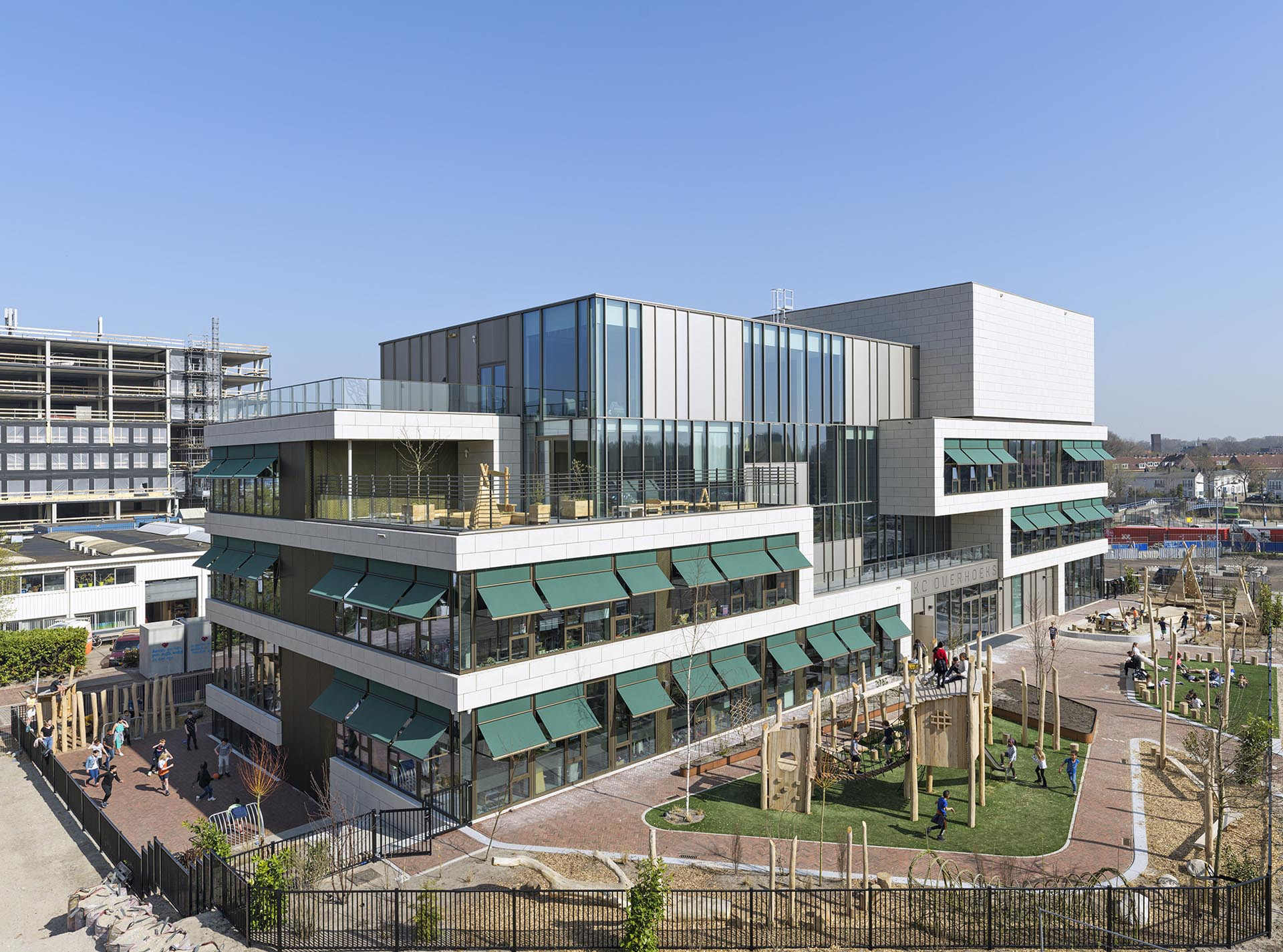 De International Primary Curriculum visie op thematisch onderwijs ambieert, kinderen in veilige leeromgevingen uit te dagen hun talenten te ontdekken, nieuwsgierig te zijn en op onderzoek uit te gaan. Steeds minder draait het om lineaire kennisoverdracht, maar juist om informele kennis opdoen zowel binnen als buiten de school. Een alles-in-één school met kinderdag-, voorschoolse- en naschoolse opvang concretiseert deze visie en stemt de doorlopende leerlijn af op de ontwikkeling van het kind in een kleine gebalanceerde wereld. Een levendig hart reikt, vanwege het compacte kavel, over meerdere verdiepingen omhoog en stimuleert ontmoeting. Tegelijkertijd biedt het geborgenheid in de verschillende rond de cascadetrap geschakelde ruimtes. In de buitengevel onthult dit hart zich in de karakteristieke, uitnodigende, plastiek die hoger op openbloeit in dakterrassen voor de verschillende gebruikers van het gebouw. De meandertrap maakt, met de blik naar binnen en dan weer naar buiten, in een zee van licht contact met de eigen binnenwereld, het speelplein en de hele stad.