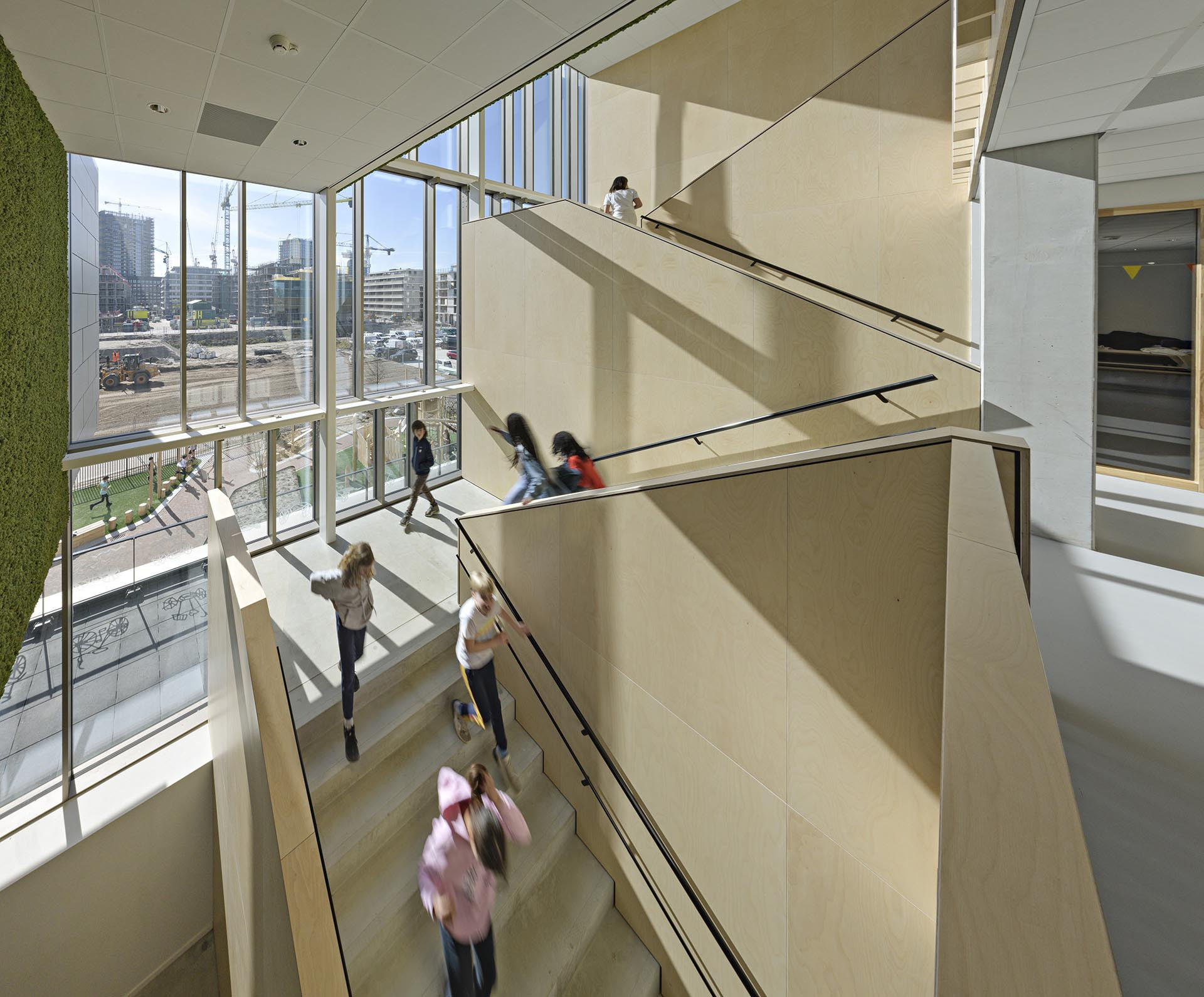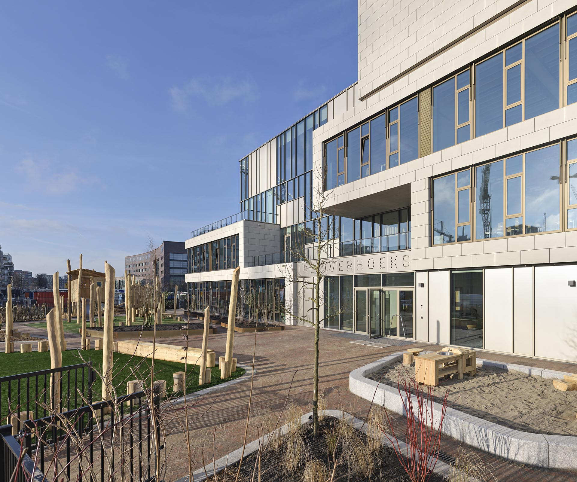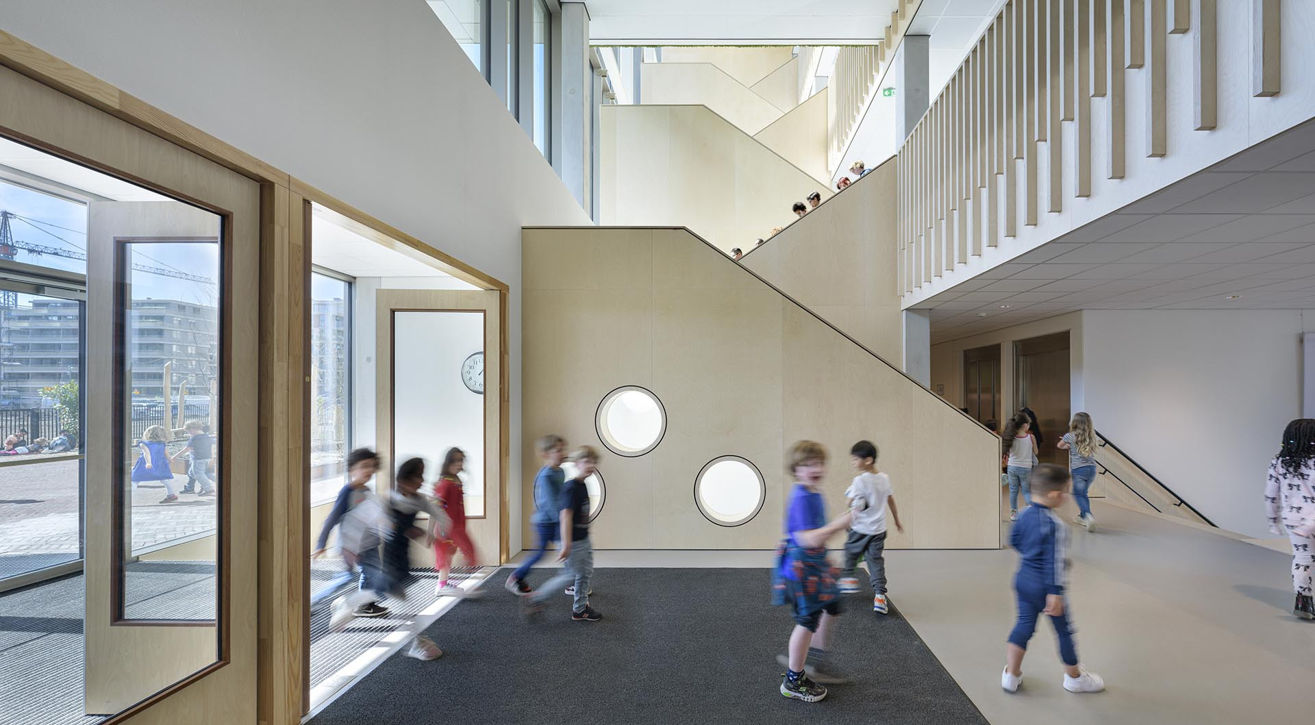 Bij de nieuwbouw van IKC Overhoeks stond verbinden en een gezond en veilig pedagogische klimaat centraal. Samen met het toekomstig buurtplein vormt het IKC de nieuwe verbinder in de hoog stedelijke wijk Overhoeks aan het IJ. De opengewerkte getrapte pleinwand versterkt de relatie met zijn context en nodigt uit tot ontmoeting en samenwerking.