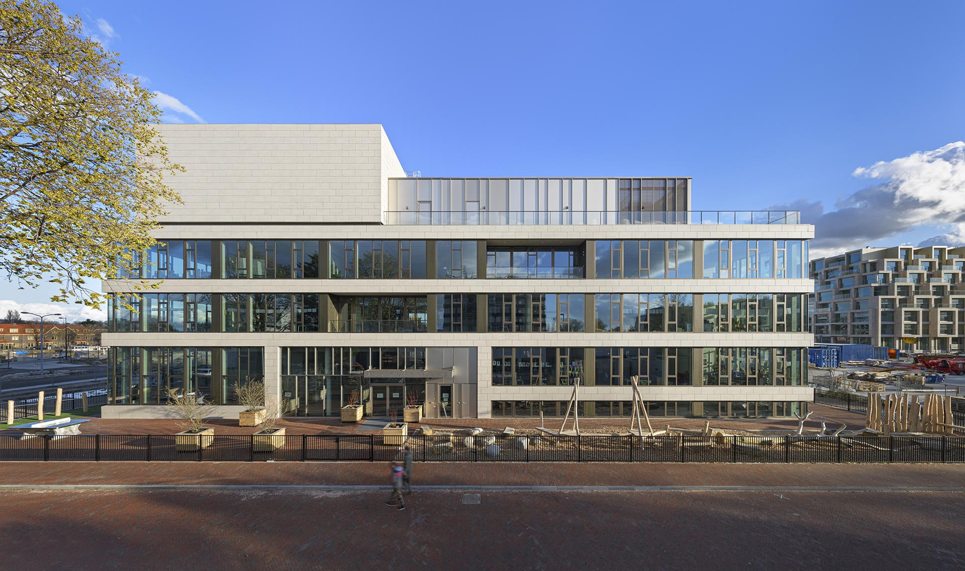Binnen de strakke stedenbouwkundige envelop ontwikkelt de volumetrie van de school zich naar boven toe steeds iets vrijer, als was het een figuur uitgehakt uit een blok. Doordat binnen naar buiten schijnt, kan je de organisatie vanaf het schoolplein al aanwijzen. In vaktaal: ‘Een Raumplan dat zich onthult’. Zo van buiten naar binnen en vice versa een gebouw ontwerpend, wijst het uiterlijk zich bijna vanzelf. Lange smalle (zonwerende) bandramen in champagne/brons geanodiseerde frames ‘lopen’ tussen zandkleurige keramische horizontalen die het gebouw ‘body’ geven. Afgewisseld met opener vliesgevels ter plaatse van verkeers- en algemene ruimten. Op de hoeken van het gebouw gaan massa en transparantie scherp door de bocht! Is detail en perfectie, samen met gebruikswaarde, niet onontbeerlijk om een dierbare oldtimer te kunnen worden?