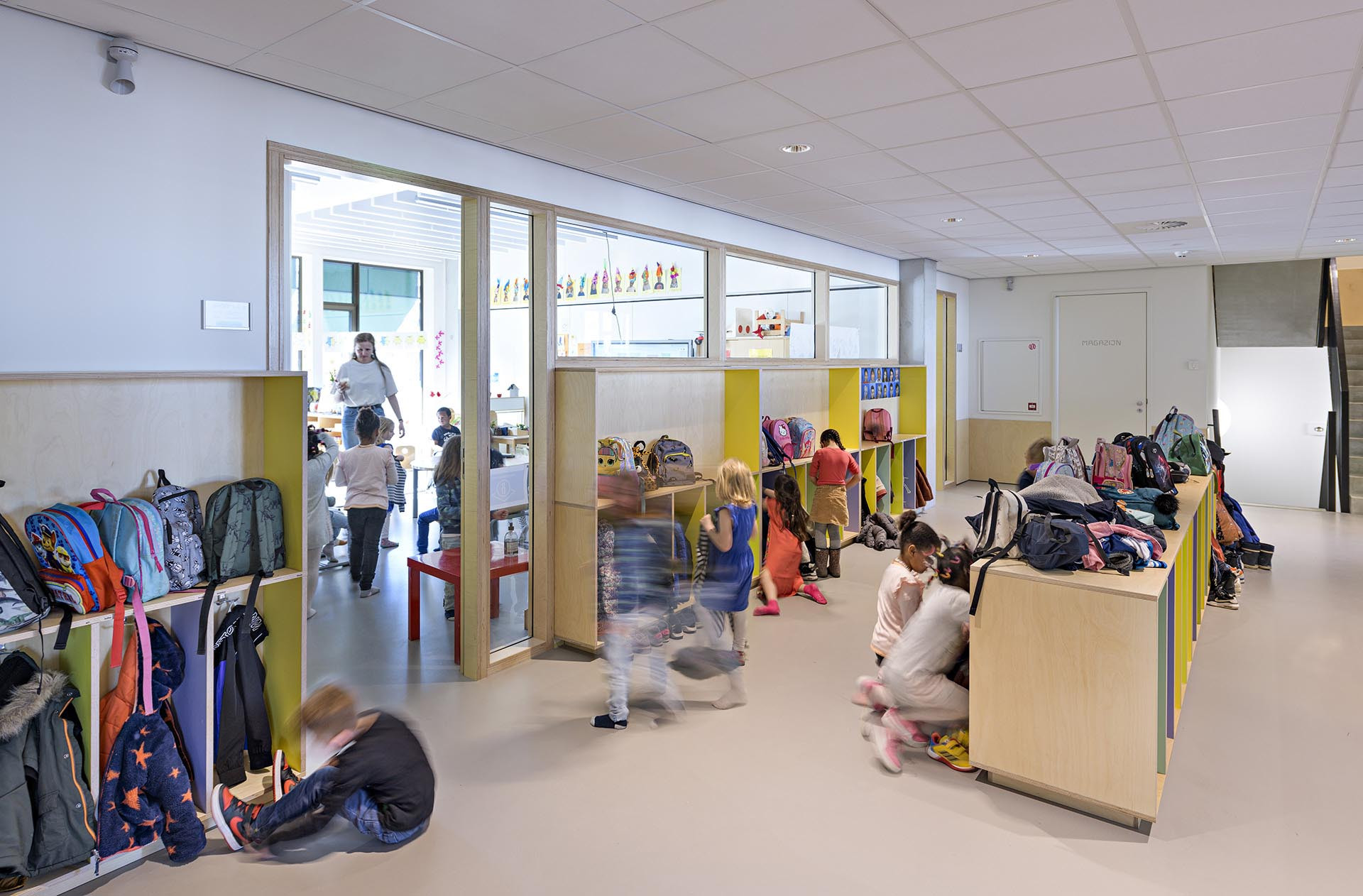 De heldere gebouwopzet met overzichtelijke plattegrond heeft een doordachte zonering en clustering van ruimtes. Dat maakt dat kinderen en bezoekers zich welkom voelen en de routing in het gebouw vanzelf spreekt. Het transparante gebouw biedt bij de lesruimten wel de benodigde kleinschaligheid afgestemd op de leeftijd van het kind.