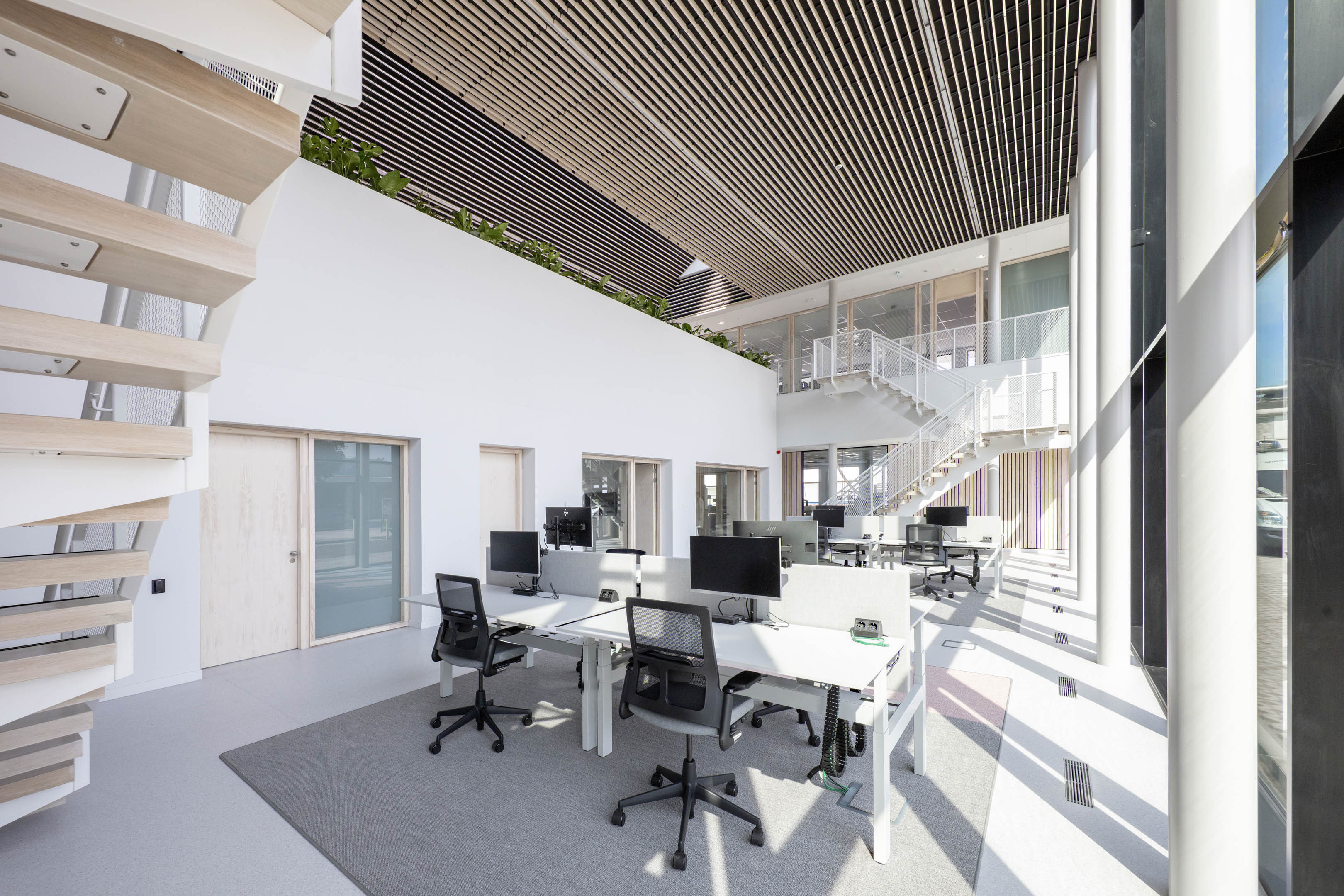 Binnen komen Arpa-, Trespa- en Westag materialen terug in de afwerking van meubels, deuren en wanden. Samen met Trespa ontwikkelden we daarvoor zelfs nieuwe patronen. Bovendien komt het huidpatroon van de buitengevel binnen terug in gerecycled vilt binnen. In de muren komen geïntegreerde magnetische whiteboards van Homapal. En in een deel van het meubilair zijn draadloze opladers van Formica verwerkt.