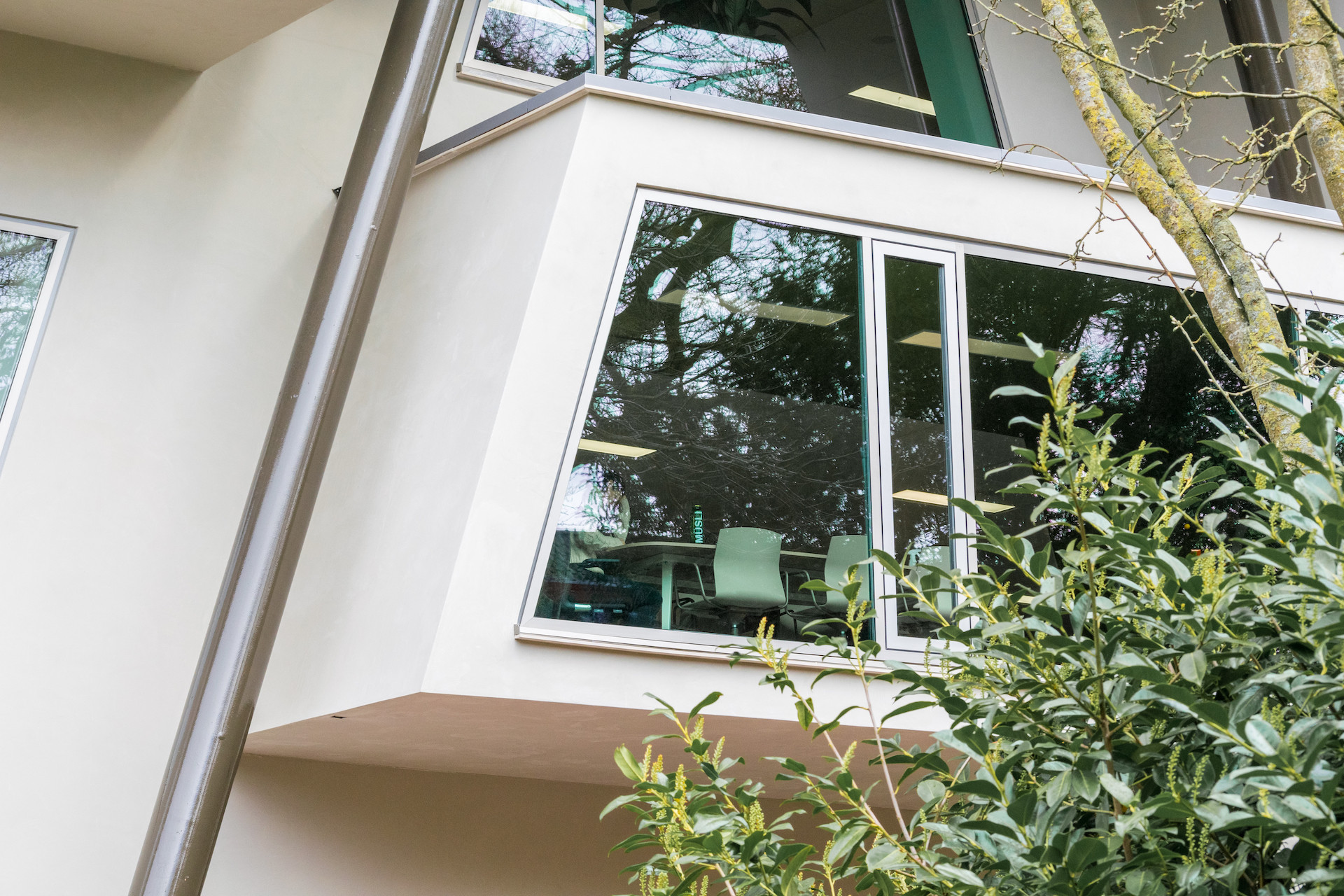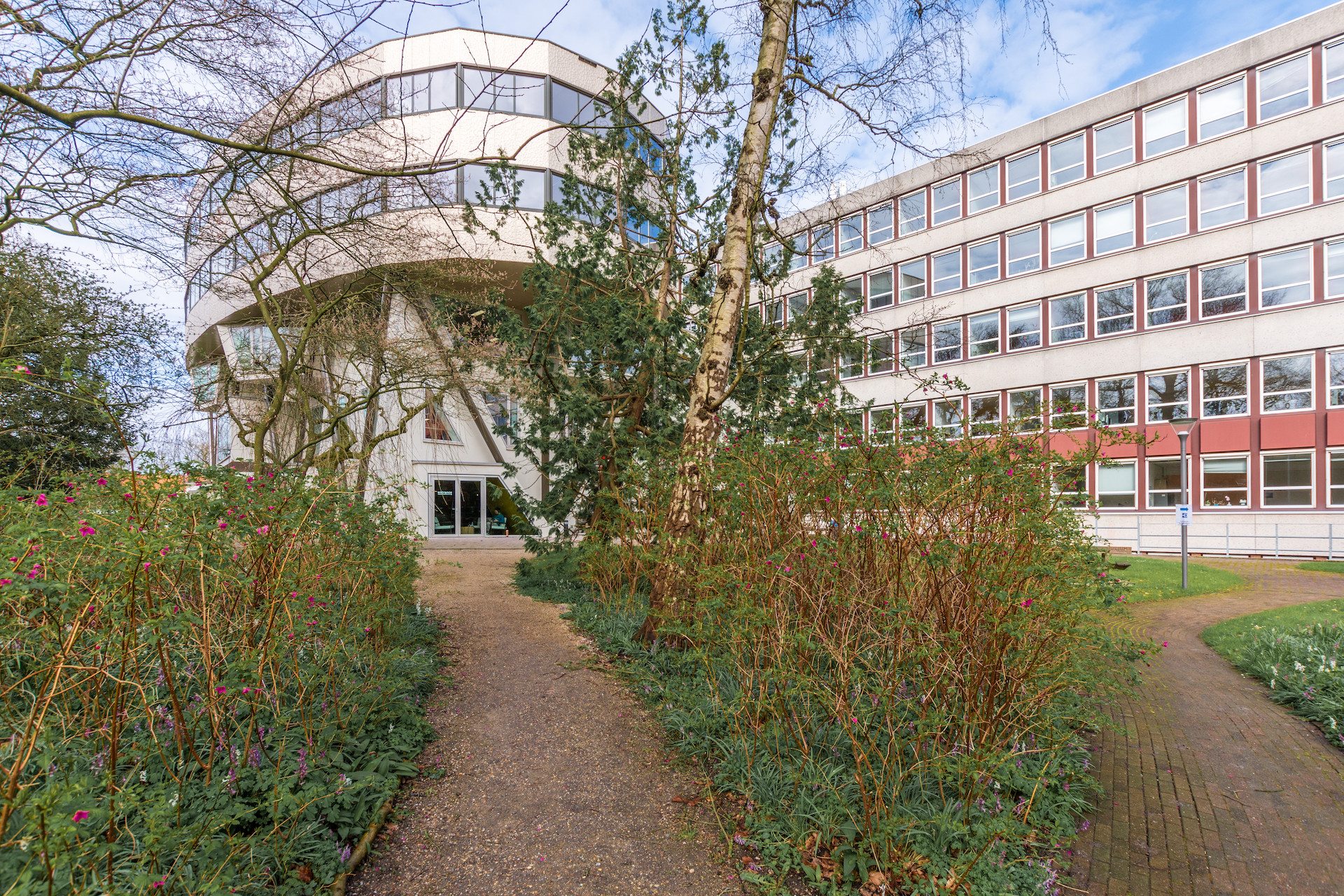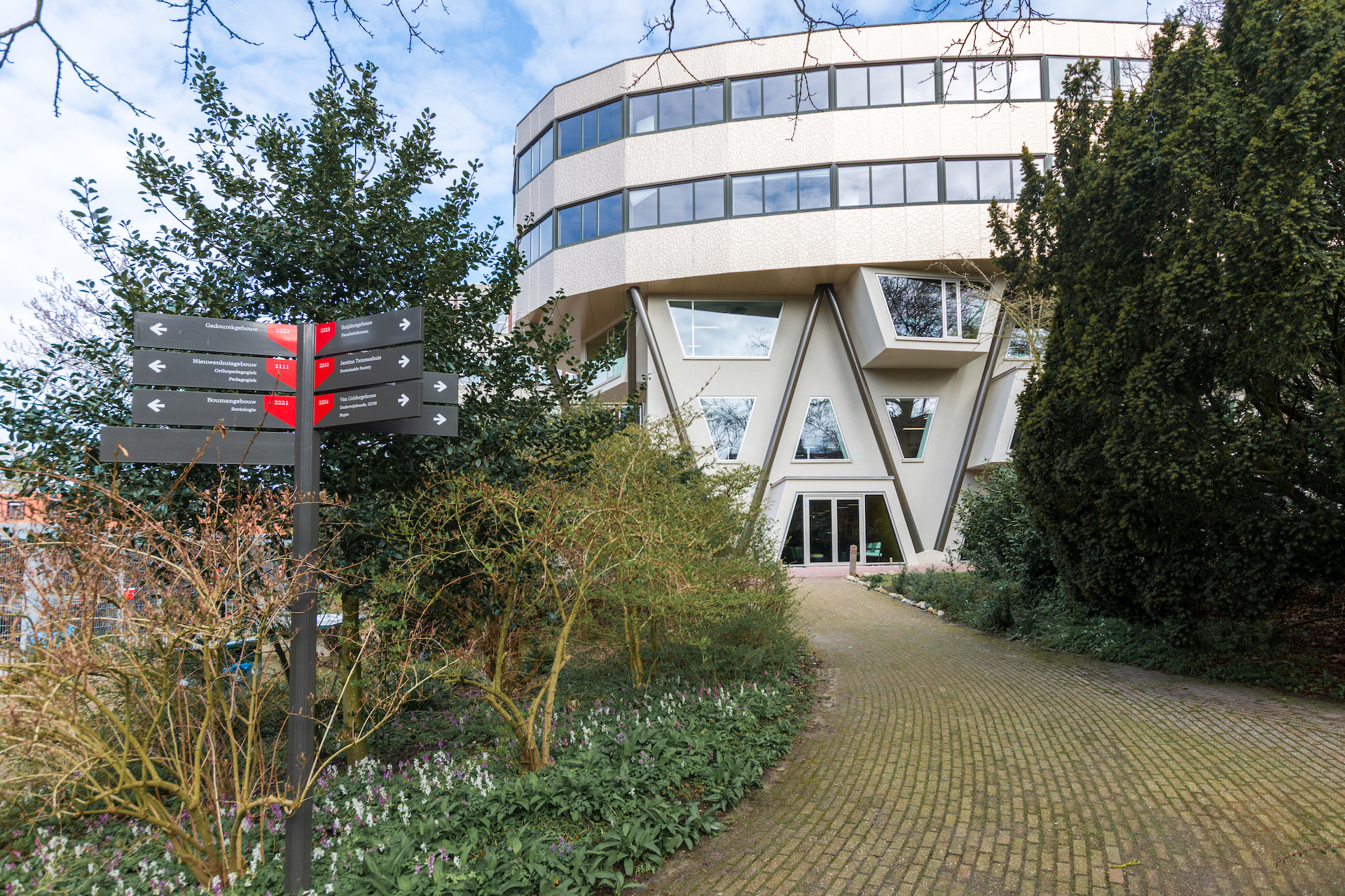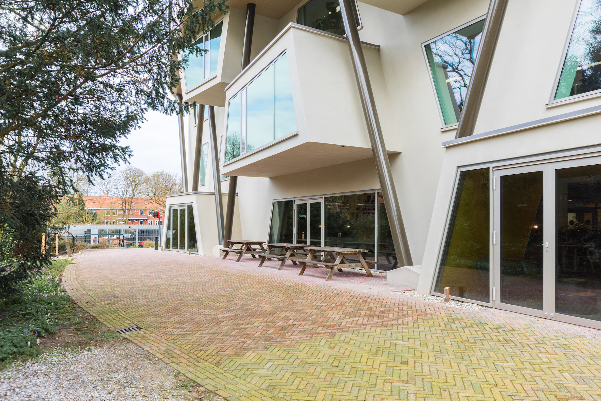 De achterzijde van het Heymansgebouw is in de jaren 90 verbouwd door het toevoegen van een gouden ovalen vorm als een brug met een beeldbepalende constructie over de oude collegezaal.