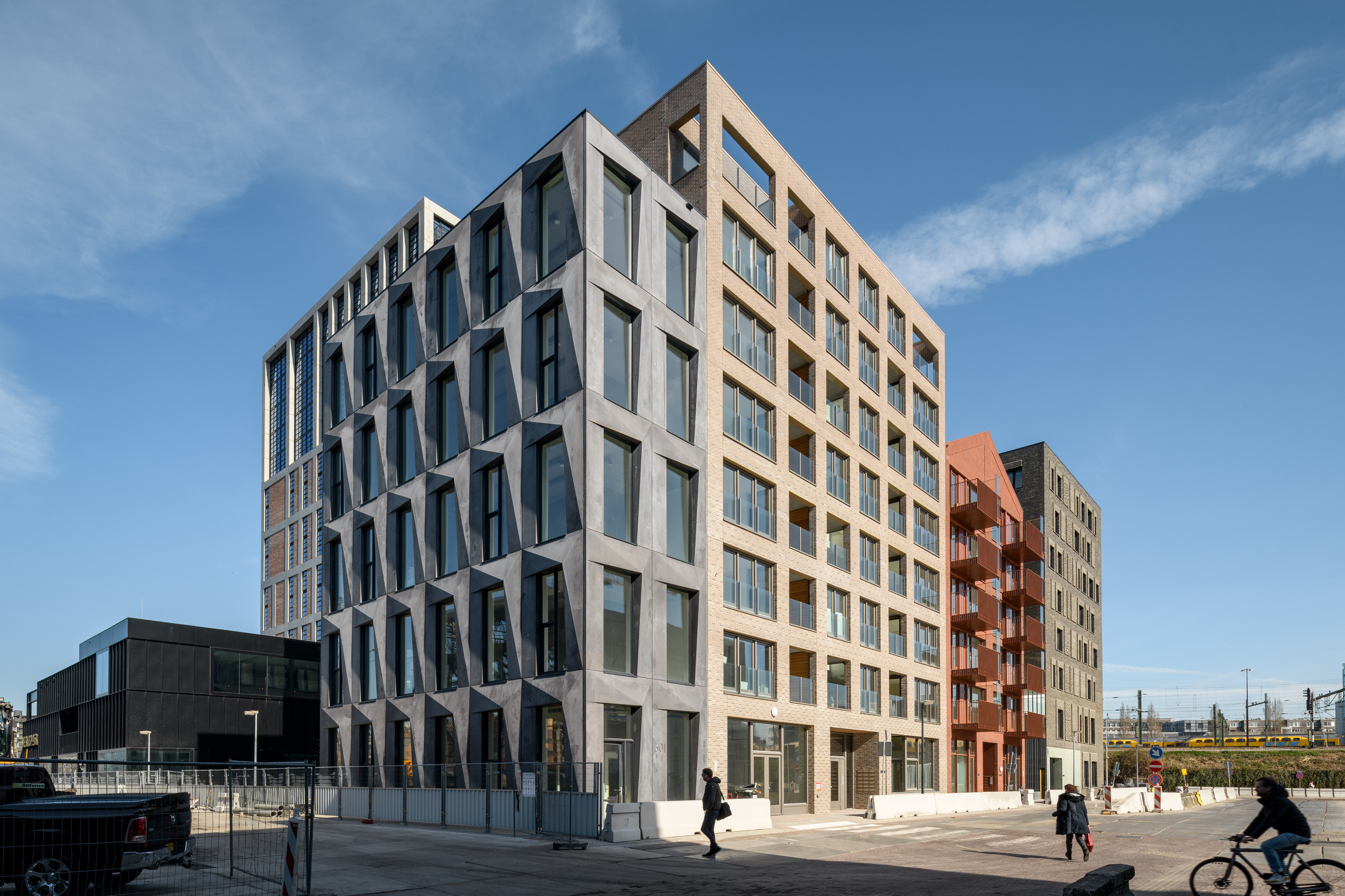 Met de karakteristieke robuuste gevel van kantoorgebouw ‘The Modular’, bestaand uit prefab betonnen gevelelementen, refereert Bureau Fraai aan het ‘rijke’ industriële verleden van het eiland en de bollende zeilen van de vele VOC-schepen die in de 17e eeuw op deze locatie werden gebouwd.