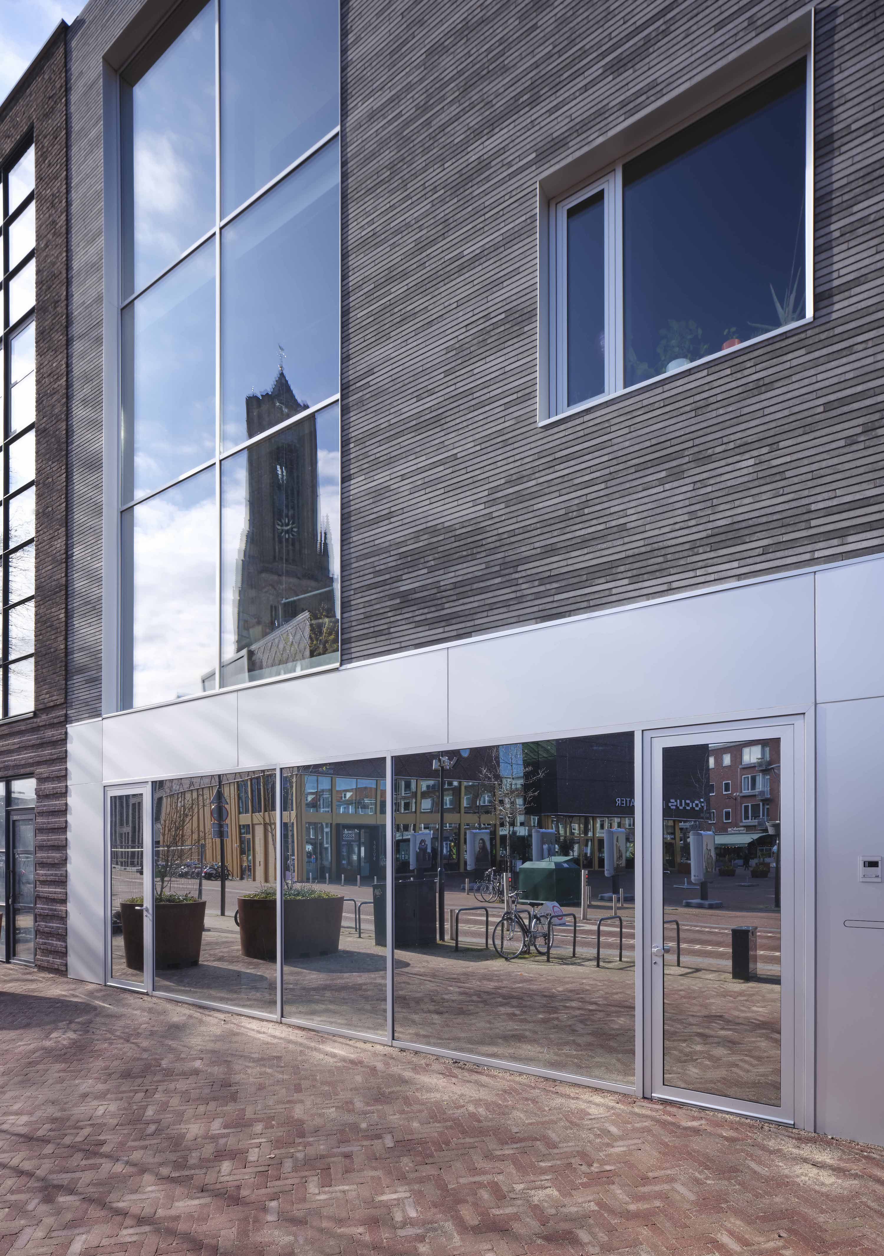 Het ontwerp van de woning is een stevig blok met twee gezichten. De voorgevel aan het Audrey Hepburnplein gaat op in het gezamenlijke bouwblok, die verdeeld is in een metalen plint en een bovenbouw van metselwerk.