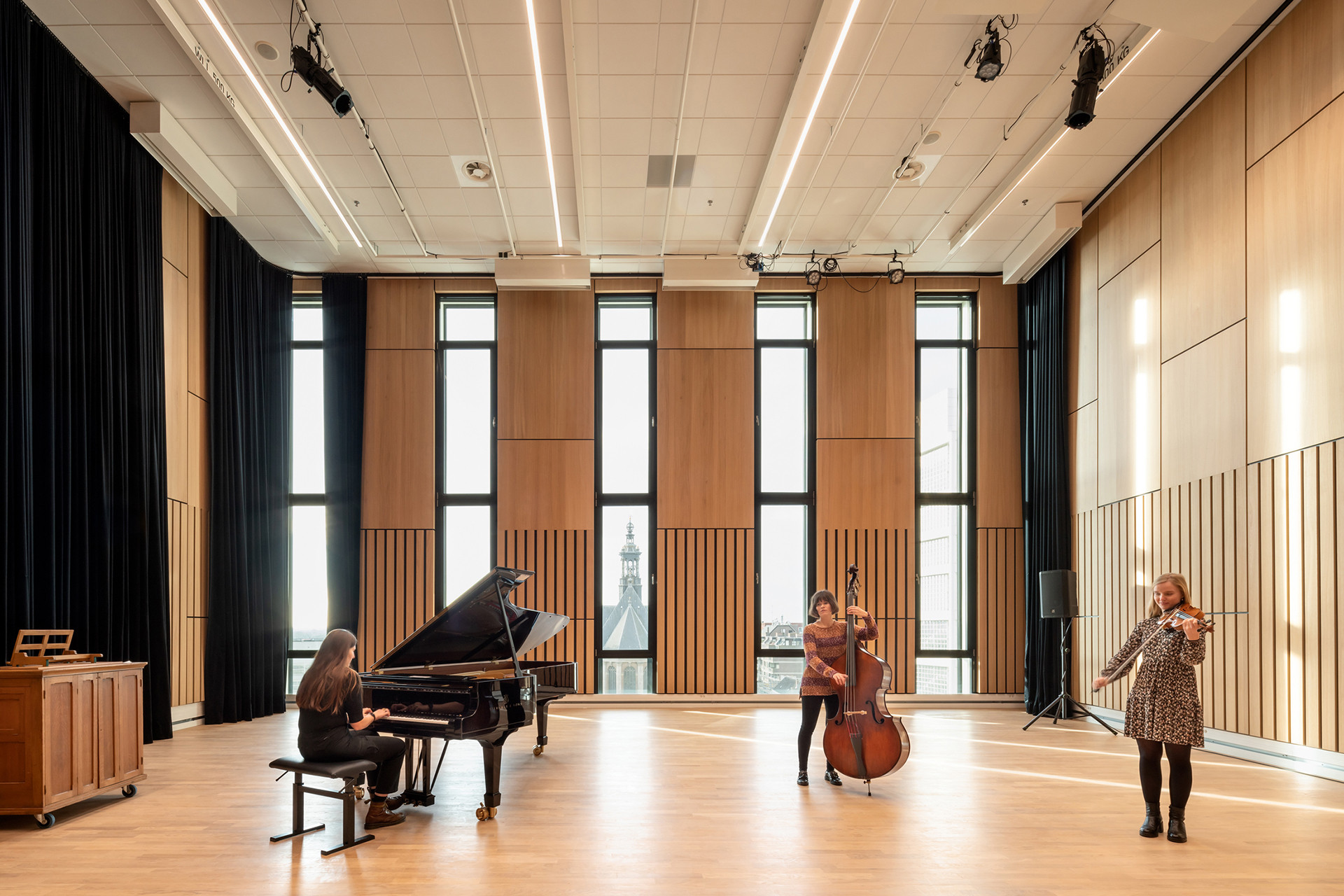 Amare is het nieuwe huis voor het Nederlands Dans Theater (NDT), het Residentieorkest, het Koninklijk Conservatorium en Stichting Amare. De combinatie van professionele artiesten en studenten samen in één gebouw is uniek. Onderweg naar een van de 165 muziekstudio’s passeren de studenten van het Koninklijk Conservatorium de Concertzaal, de Amare Studio of het Danstheater waar ze de professionals van het Residentieorkest of het Nederlands Dans Theater (NDT) kunnen zien oefenen of optreden. Doordat de verschillende domeinen dicht bij elkaar zijn geplaatst, ontstaat een creatieve synergie die voelbaar is in het hele gebouw, én daarbuiten.