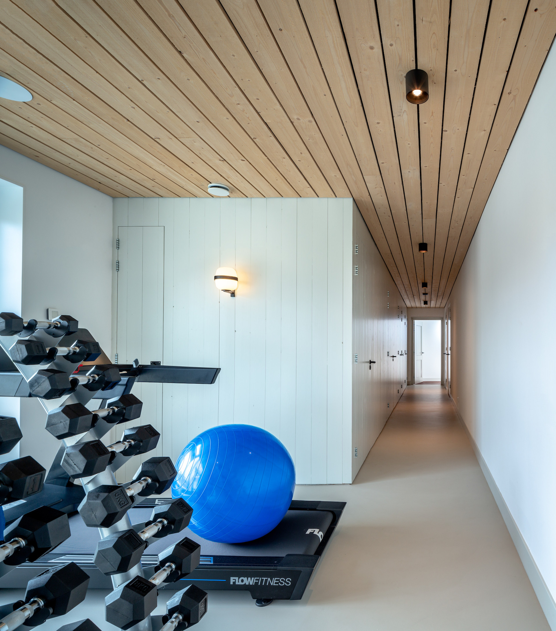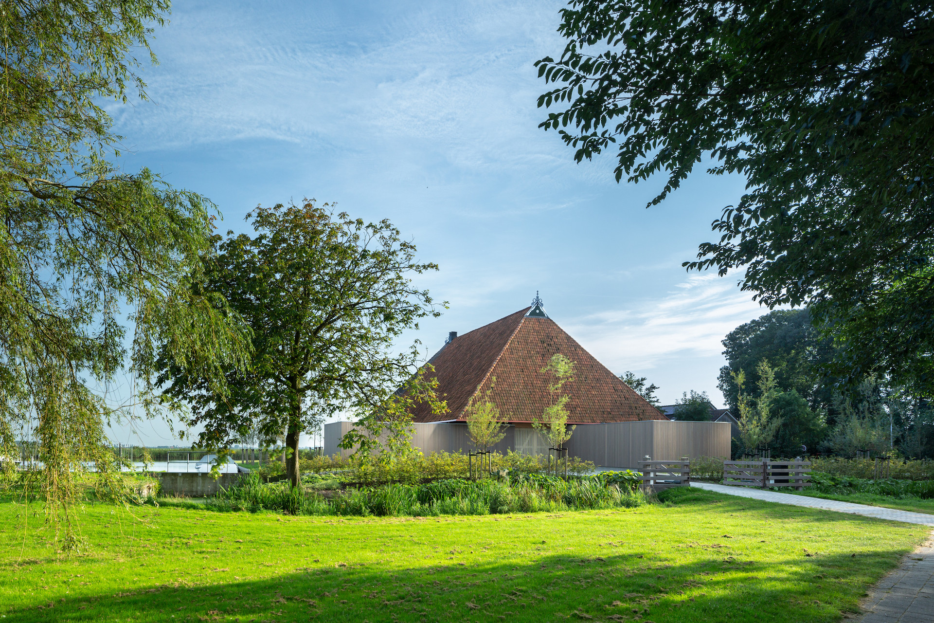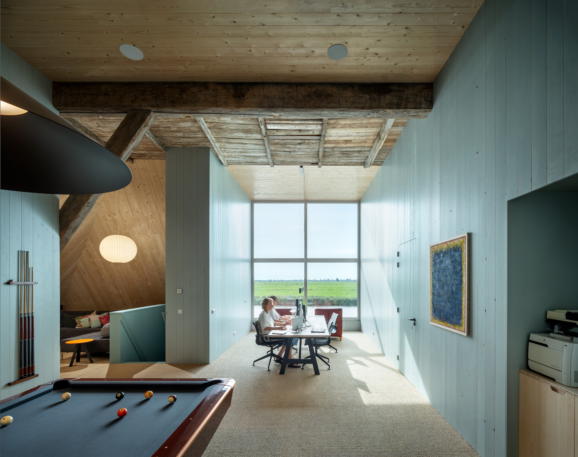 Het bestaande woongedeelte van de stelp, dat zoveel mogelijk intact is gelaten, was niet groot genoeg voor het totale programma. Daarom is het bedrijfsgedeelte van de boerderij radicaal leeg gestript, tot en met de gevels. Het idee was: nieuwe functie, nieuwe eisen, nieuwe architectuur. De indrukwekkende kap met de binten bleef wel staan als onmisbare drager van de identiteit van een Friese boerderij.