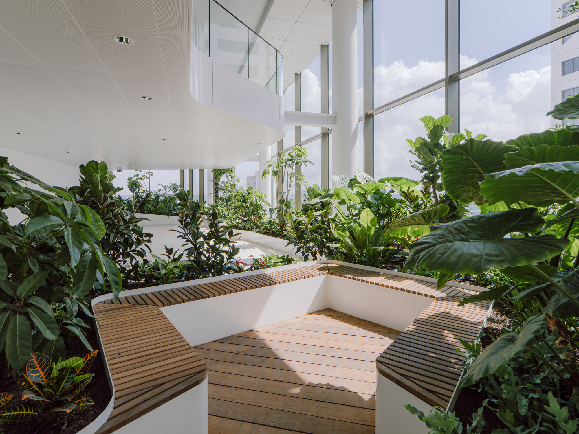 Een subtropische binnentuin op 45 meter hoogte zet de conventies van typische werkplekken opzij, alsof je op de Azoren bent. Hier kunnen werknemers ontspannen of vergaderen, midden tussen het groen, en daarna terugkeren naar hun eigen werkplek. Central Park is een groen gebaar naar de stad en bevordert de gezondheid in de kantooromgeving.