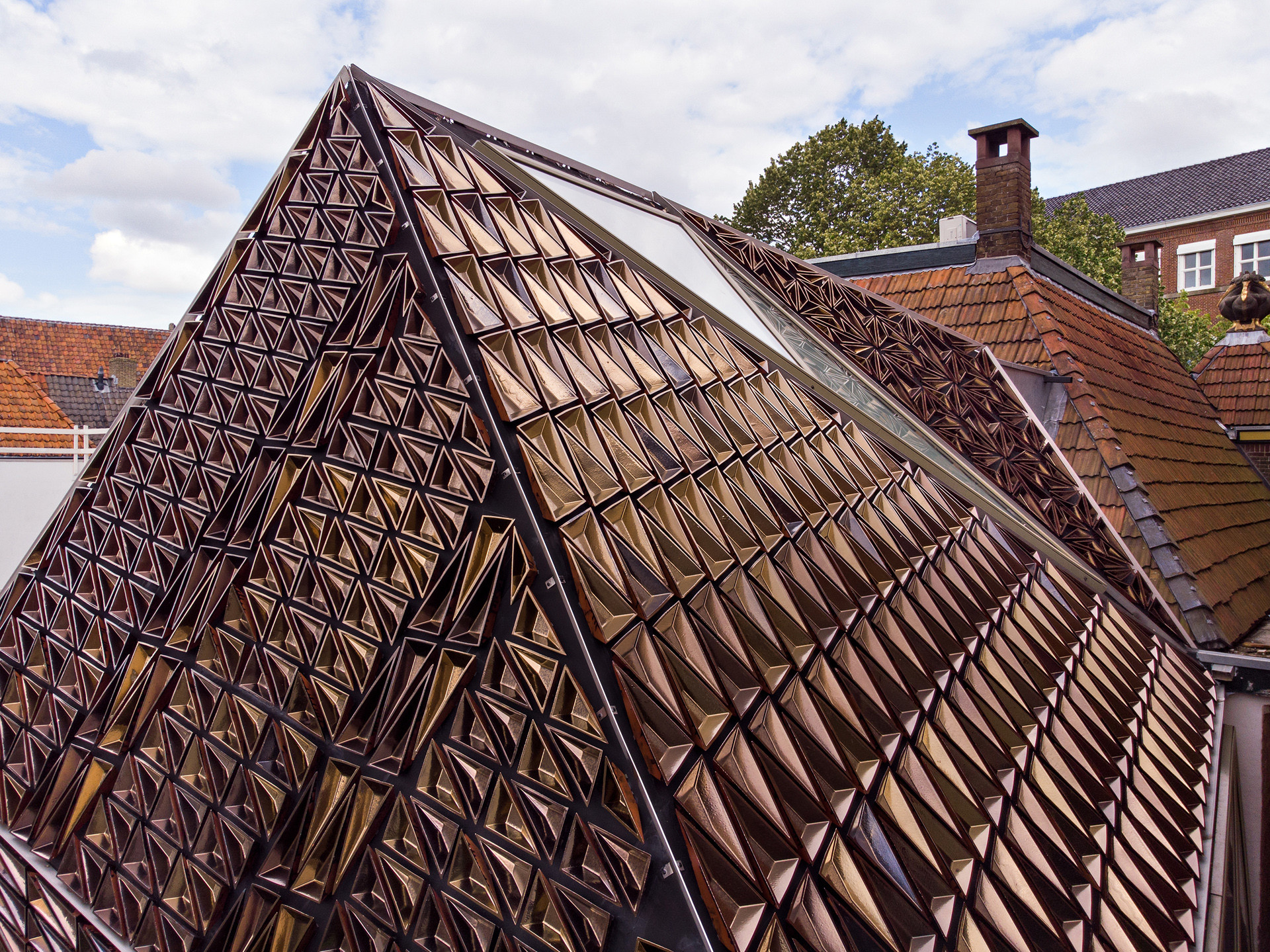 De driehoeken refereren aan het veelhoekige dak van het monument. Het nieuwe volume helt aan alle kanten enigszins over waardoor het vanaf de straat, voor de oplettende passant, nét zichtbaar is. Het mág gezien worden.