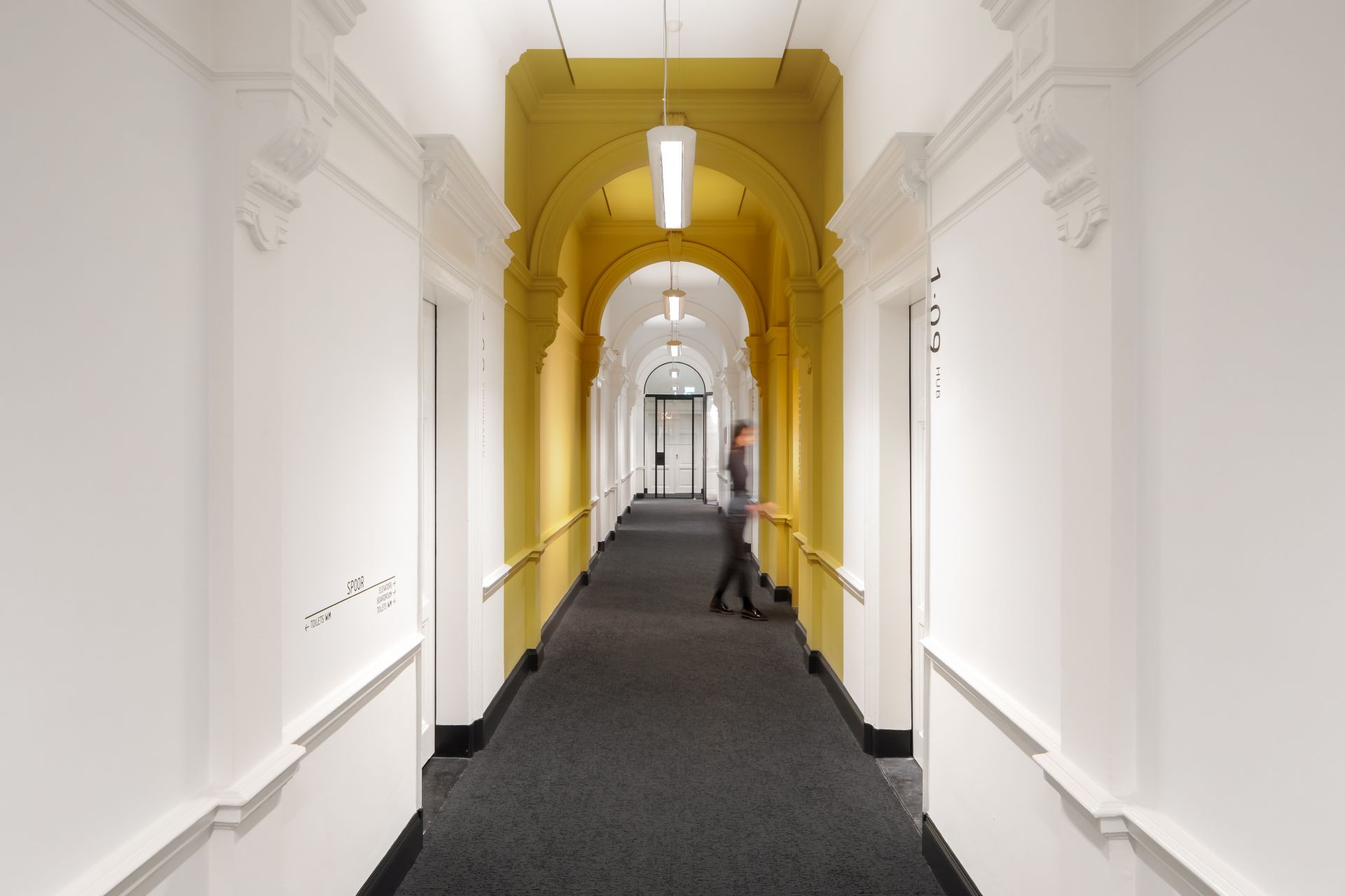De transformatie van de bovenste verdieping tot een open vloer met de originele houten dakspanten in het zicht is illustratief voor uitgesproken keuzes: architectuur die recht doet aan het rijksmonument, maar ook aan de bewoner welke haar liefde voor het erfgoed beantwoordt ziet in een hedendaagse klantervaring en comfortabele werkomgeving die de dynamiek van de organisatie ondersteunt.