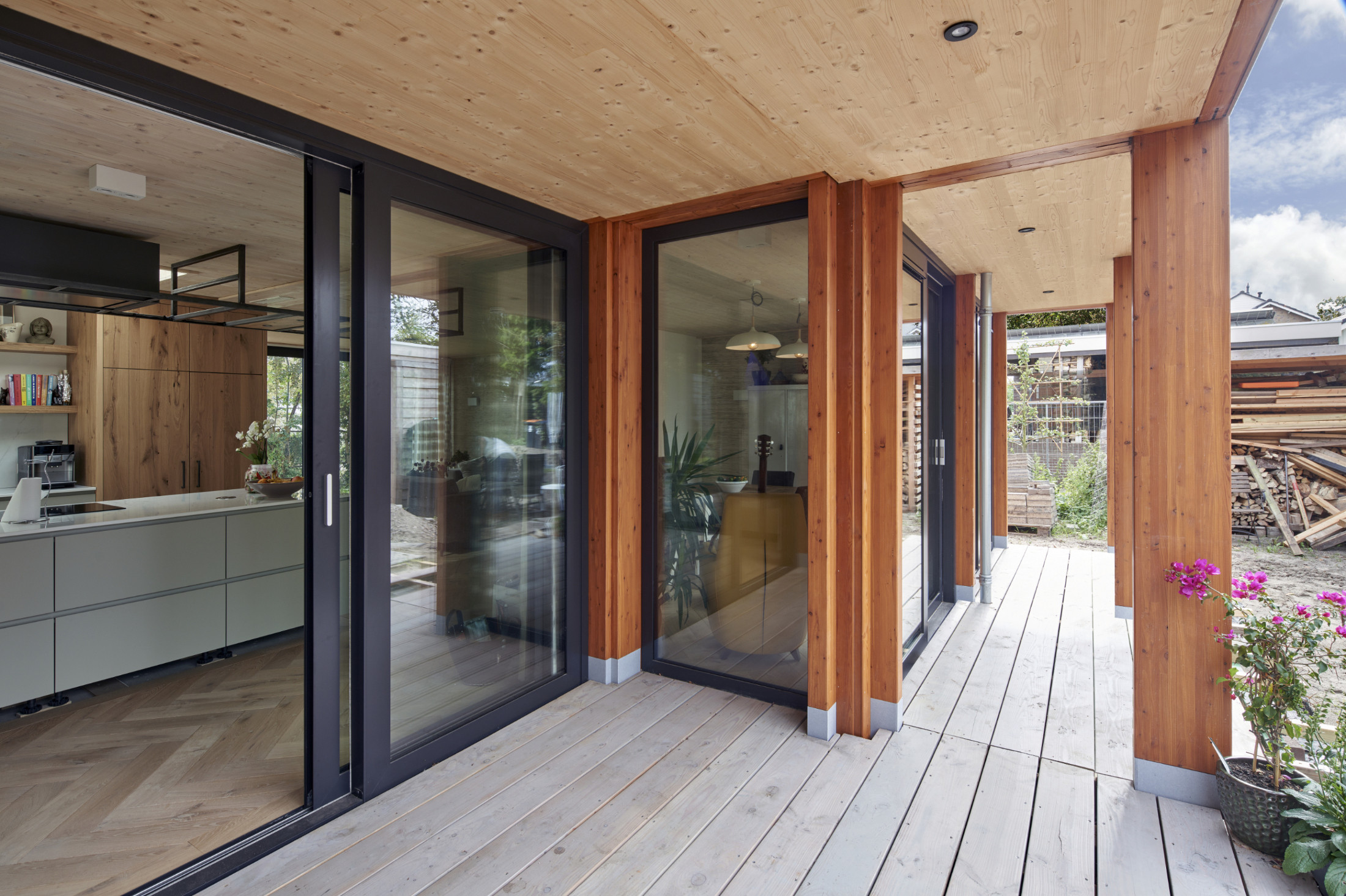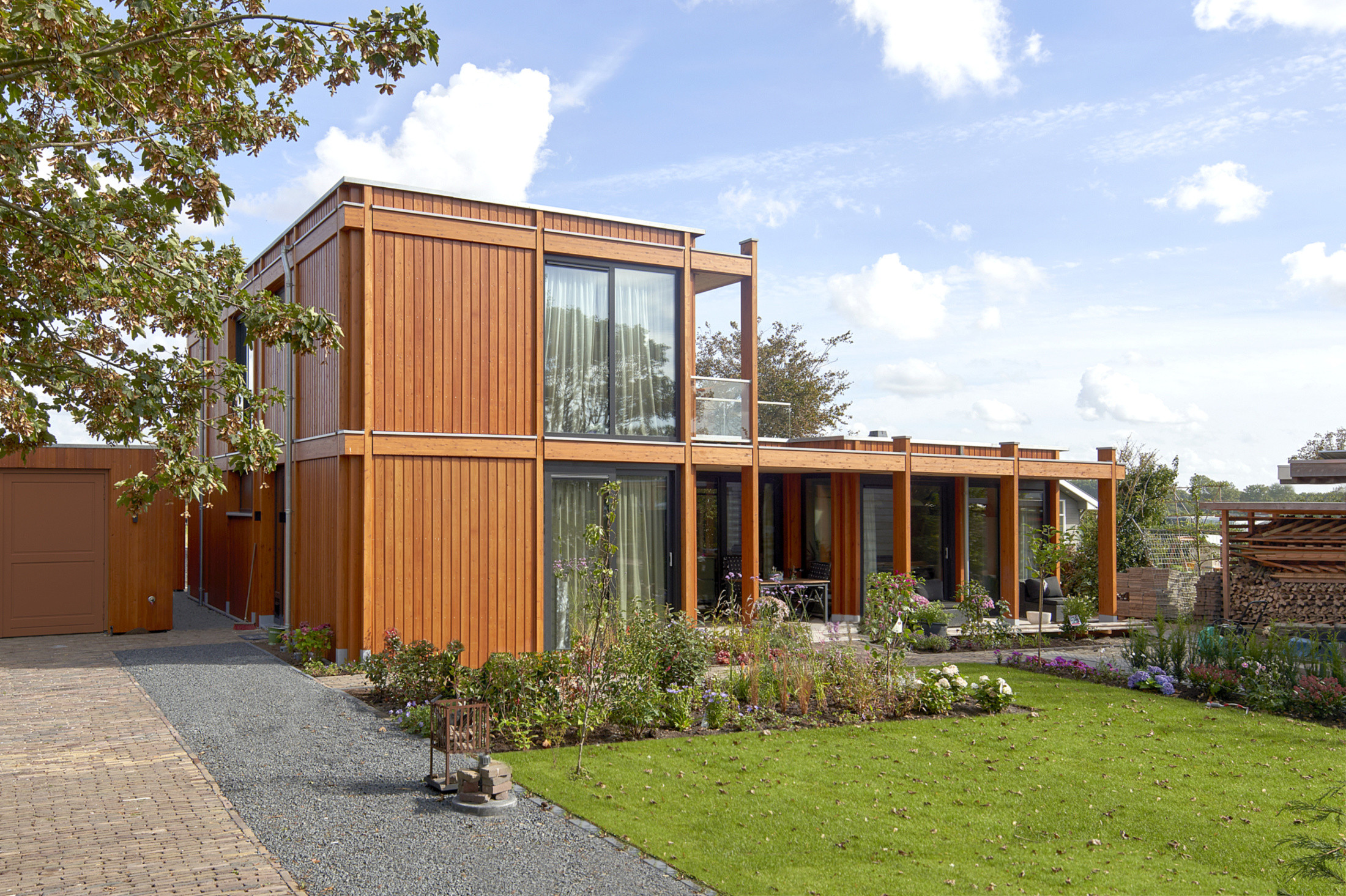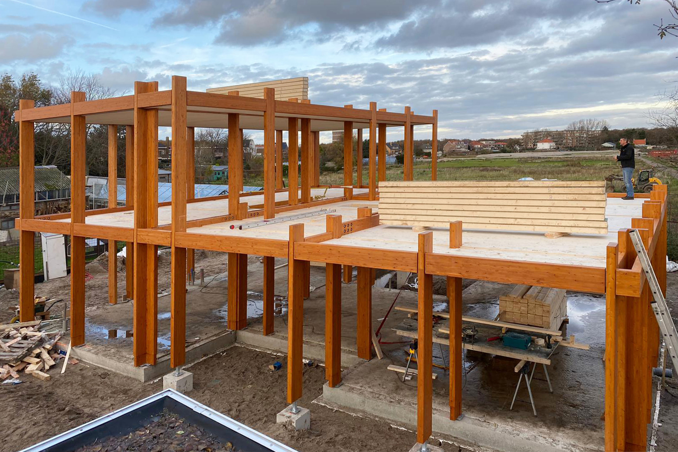 Vlakbij de Zuid-Hollandse duinen is een bijzondere woning gerealiseerd die bestaat uit een zichtbare structuur van gelamineerde houten kolommen, liggers en vloeren.