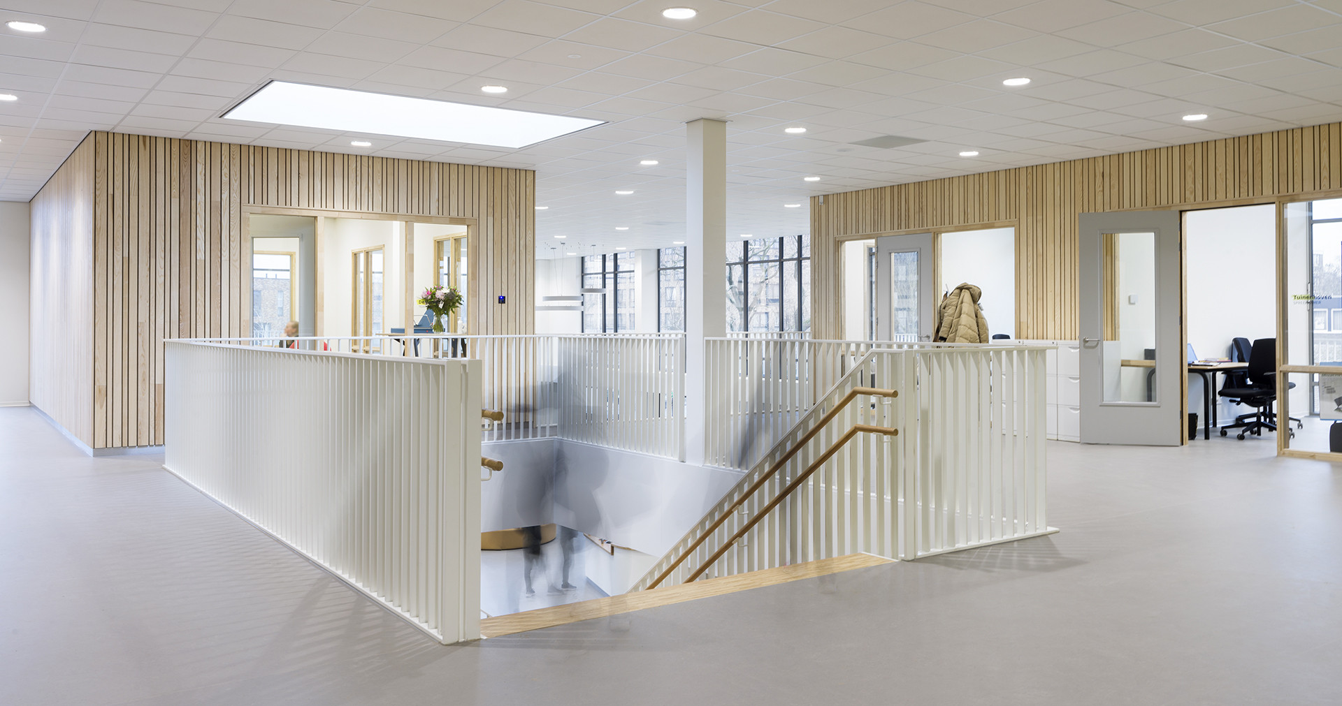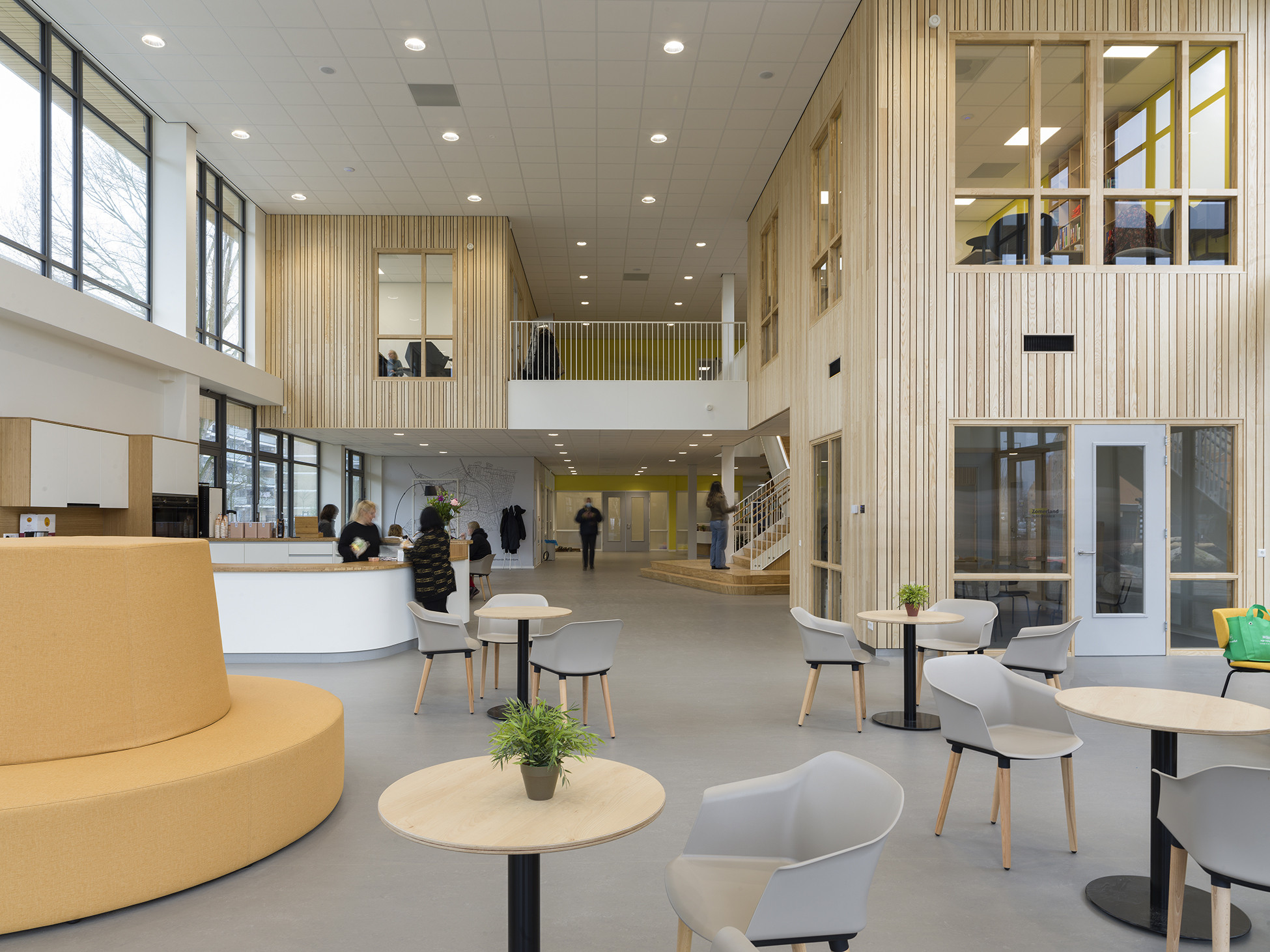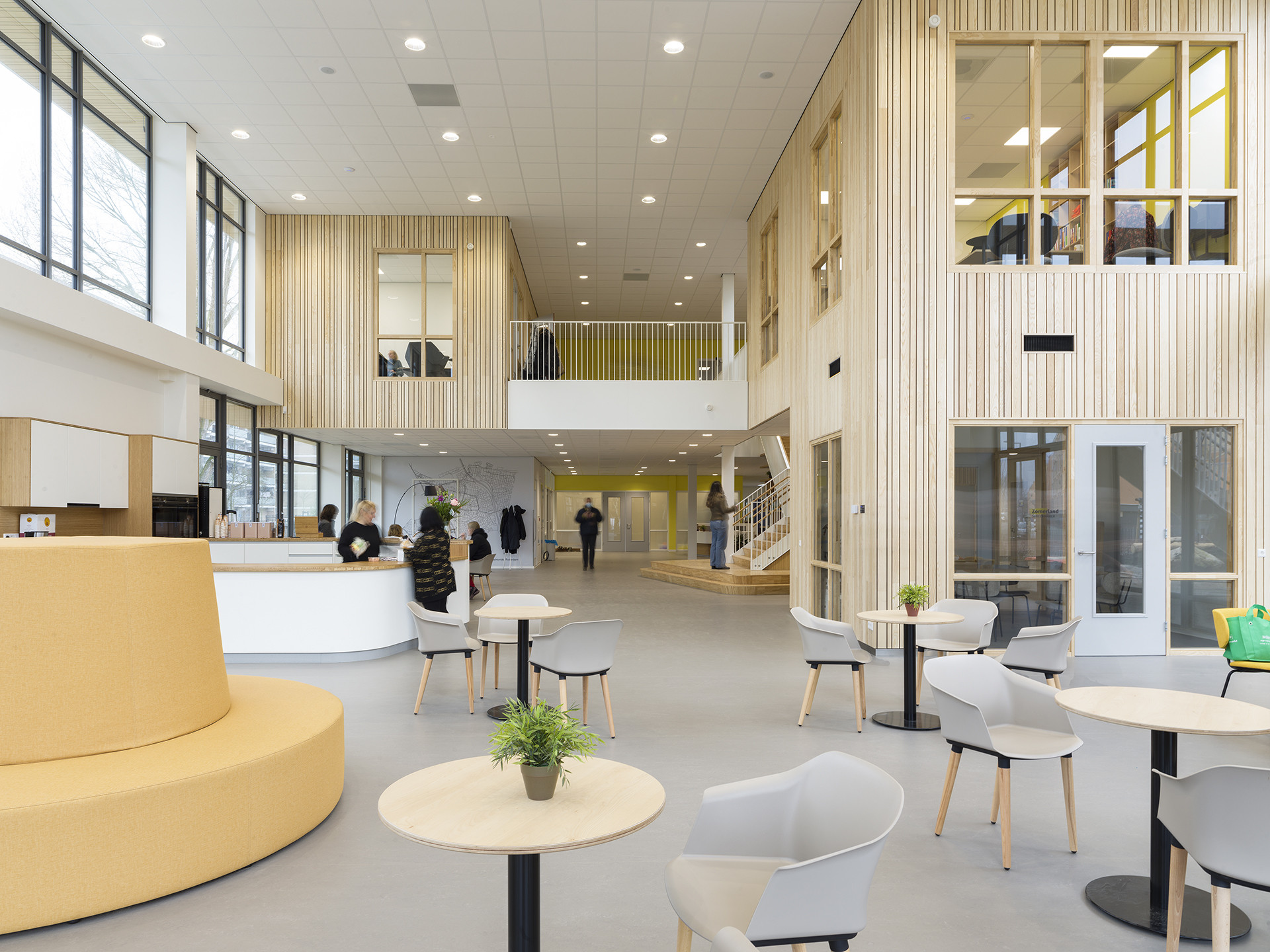 Het concept is consequent doorgevoerd van de wijk tot en met de inrichting. De maat en de rechte lijnen van het gebouw sluiten aan bij de bebouwing in de omgeving. Binnen is het ontwerp verrassend afwisselend. Meerdere meubels zijn onderdeel van de architectuur, zoals de boekenwand die in de houten trap is geïntegreerd. Het houtgebruik ademt de sfeer van ontspanning, en zorgt tegelijk voor een prettige akoestiek. Het onderstreept de huiselijkheid die hier heerst. Die valt bij binnenkomst gelijk op: bezoekers worden ontvangen aan de balie. De ruimte loopt door in de open keuken met bar en zitjes in de dubbelhoge aula. Vanuit hier heb je uitzicht op de verschillende buitenruimtes, de terrassen en gaanderijen.