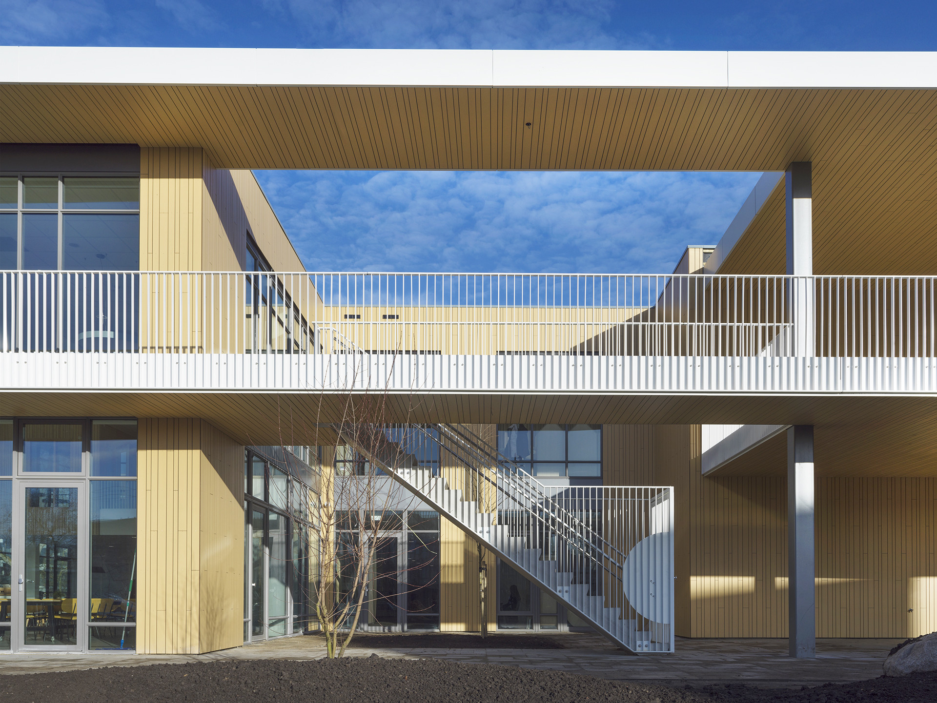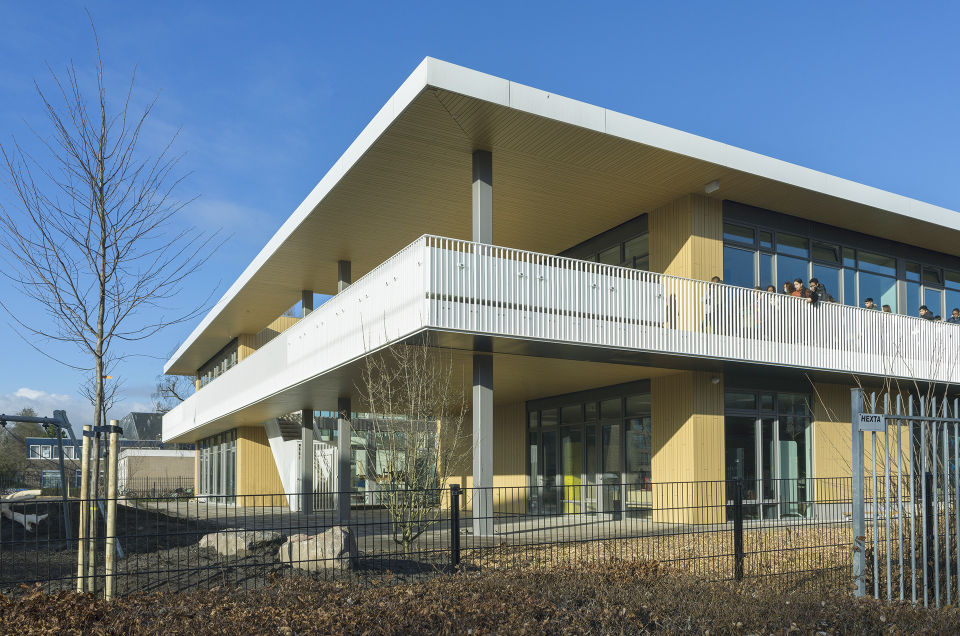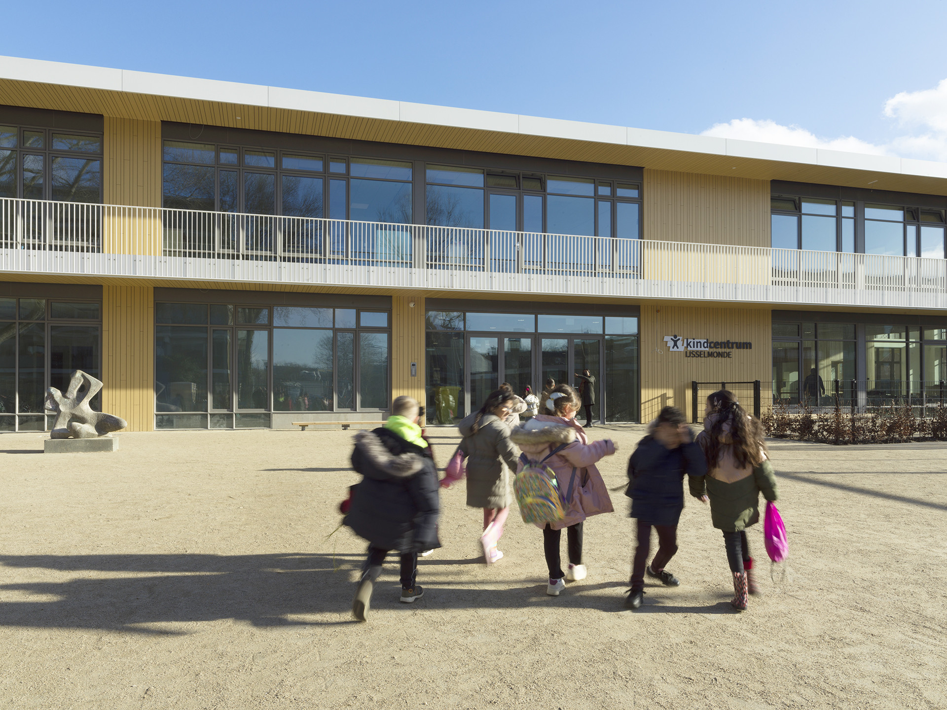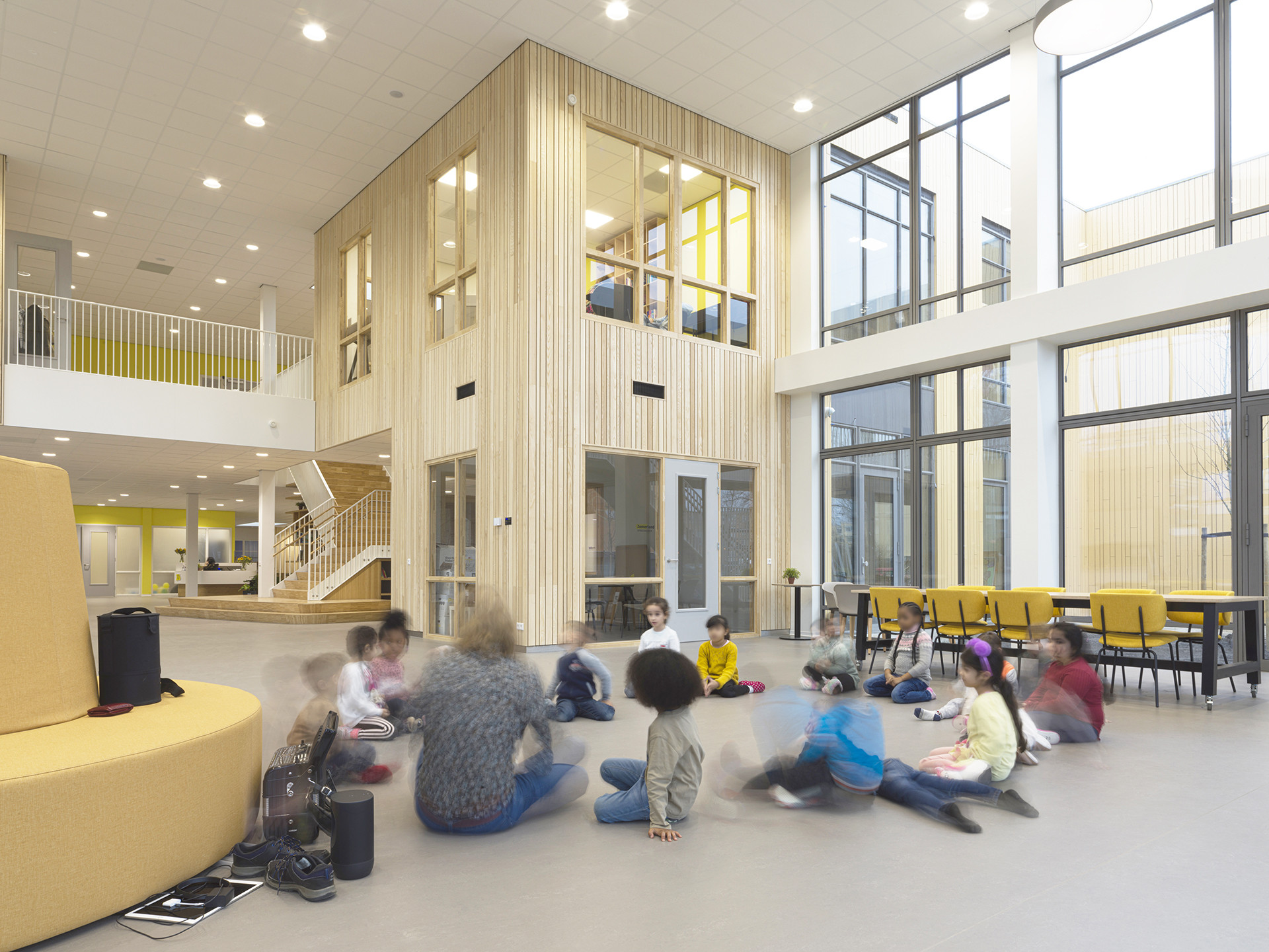 Die toegankelijkheid spreekt al van verre. Door de hoge glazen gevels kijk je vanuit de wijk zo naar binnen. Hier is van zeven tot zeven reuring. Ouders brengen hun peuters naar de speelzaal, de basisschool stroomt vol, er is voor- en naschoolse opvang. Het Centrum voor Jeugd en Gezin huist er; de fysiotherapeut, diëtist en logopedist houden er spreekuur. De schoolbibliotheek is open, er zijn muzieklessen in de aula, en sportlessen op de buitenterrassen. Je ziet dat hier wat gebeurt! Zo maakt het gebouw gelijk verbinding met de buurt.