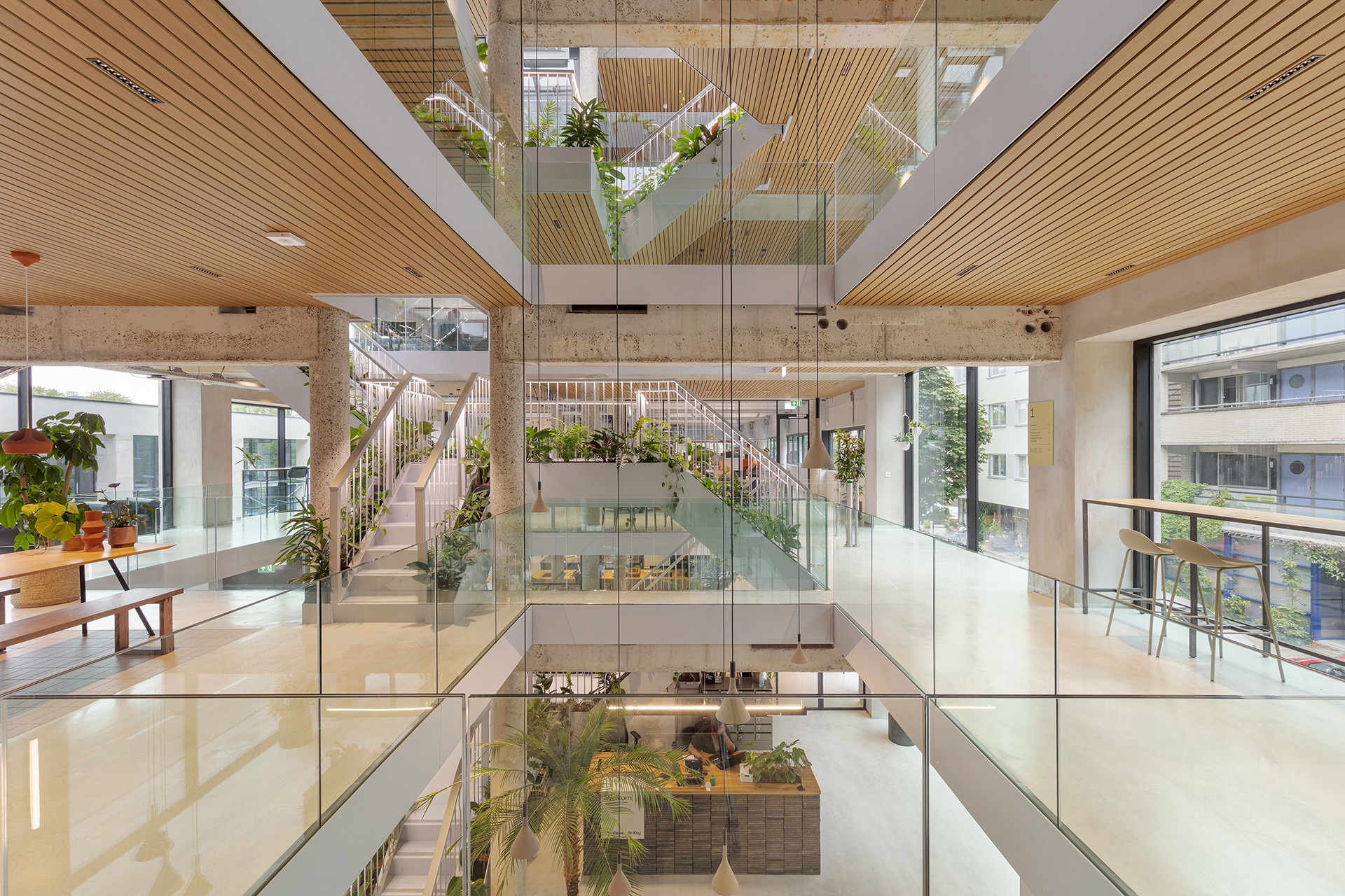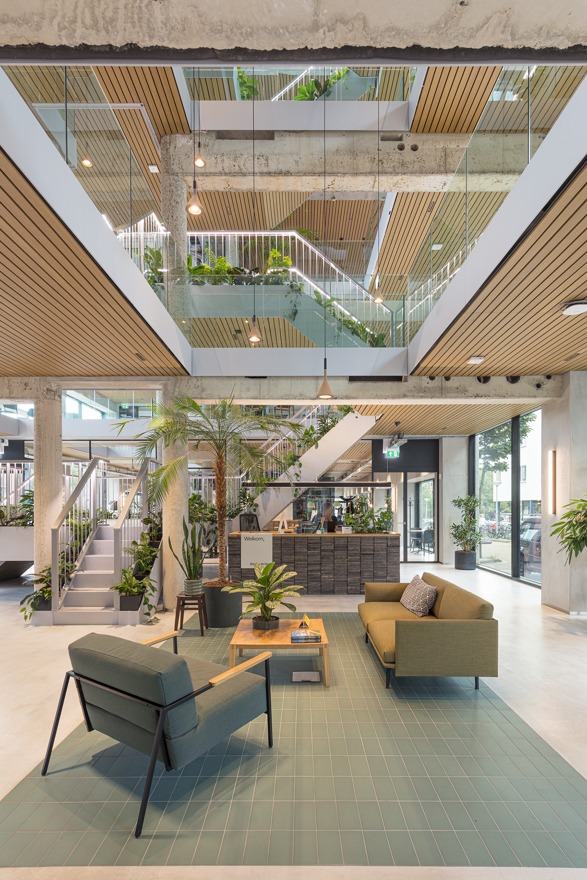Lieven de Key vroeg om een toekomstbestendige werkomgeving. Deze hebben wij op verschillende manieren gecreëerd. De begane grond is geheel opengewerkt om meer interactie (zowel tussen werknemers onderling als tussen de buurt en Lieven de Key) en transparantie te creëren. In het hart van het hoge atrium waar de verschillende gebouwdelen samen komen hebben we groene ontmoetingstrap ontworpen. Deze dubbele bordestrap bevat split level plateaus die plek bieden aan collega’s die elkaar tussen de verdiepingen in ontmoeten, ruim genoeg om te blijven staan praten. Met de balustrades loopt beplanting mee tot bovenin. Deze ‘groene long’ van het complex schakelt de bouwdelen en natuurlijk de verdiepingen. Ook stimuleert deze trap beweging en ontmoetingen tussen de verschillende afdelingen en draagt deze bij aan een gezonde werkomgeving. Vanwege de dynamiek op de trap zijn de collectieve werkfuncties eromheen gegroepeerd. Op wat afstand van de trap worden werkzaamheden naar aard gefaciliteerd zoals bilateraal overleg, telefonisch contact en hoog-concentratiewerk. Door de invoering van flexibele werkvormen wordt het mogelijk om met meer mensen in hetzelfde gebouw te werken.