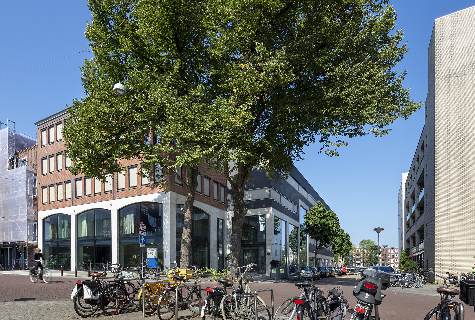 Verbinding is de leidraad in deze transformatie: het verbinden van de bestaande gebouwen, het verbinden van mensen en het verbinden met de buurt. De 3 bestaande gebouwen bleven behouden, zijn gerenoveerd en onderling verbonden. Binnen is de begane grond geheel geopend om er alle ruimtes voor gezamenlijk overleg en informele ontmoeting aaneen te schakelen. Aan de buitenzijde zijn de 3 bouwdelen en de tuin als met een lint bijeengebonden door een doorlopende structuur van betonnen kaders, open of voorzien van glazen puien. Vanaf de Hoogte Kadijk is door de grootste opening het atrium vol planten dé blikvanger. Deze transparante uitstraling nodigt de buurt uit binnen te komen. De open ruimte op de begane grond heeft ook een heldere buurtfunctie, bijvoorbeeld door deze in te zetten als locatie voor een stembureau tijdens verkiezingen. Waar eerder een parkeerplaats lag is nu de grote binnentuin gesitueerd, die beeldbepalend is vanaf de Nieuwe Vaart. De auto’s zijn hier weggehaald om groen terug te brengen in de stad. De binnentuin vormt het hart van de 3 gebouwen en is daarmee een belangrijke overgang van binnen naar buiten. In de tuin wordt regen opgevangen, er is een groen dak aanwezig en op het dak liggen PV-panelen.