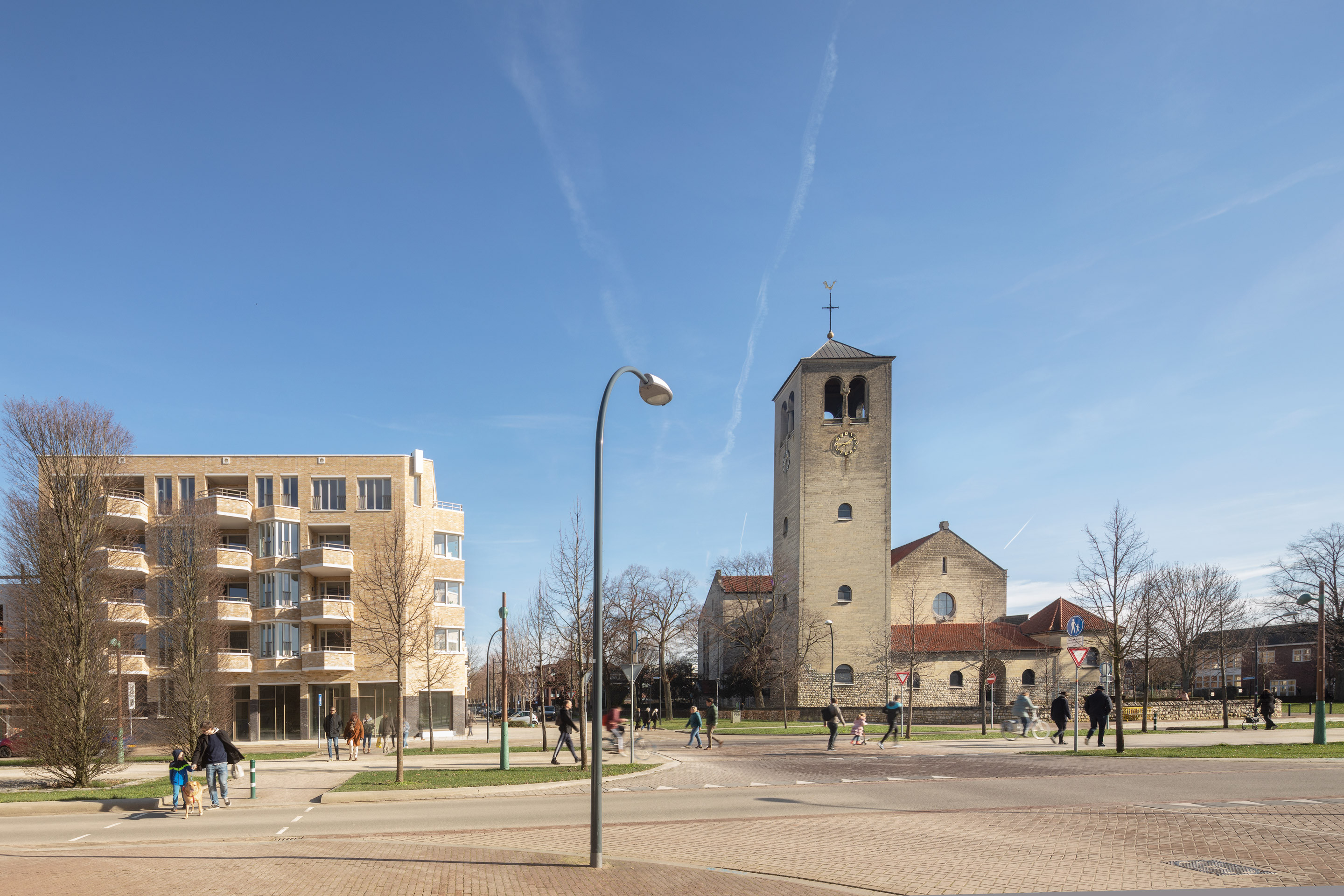 Tegenover de monumentale mergelkerk (arch. F. Peutz 1936).