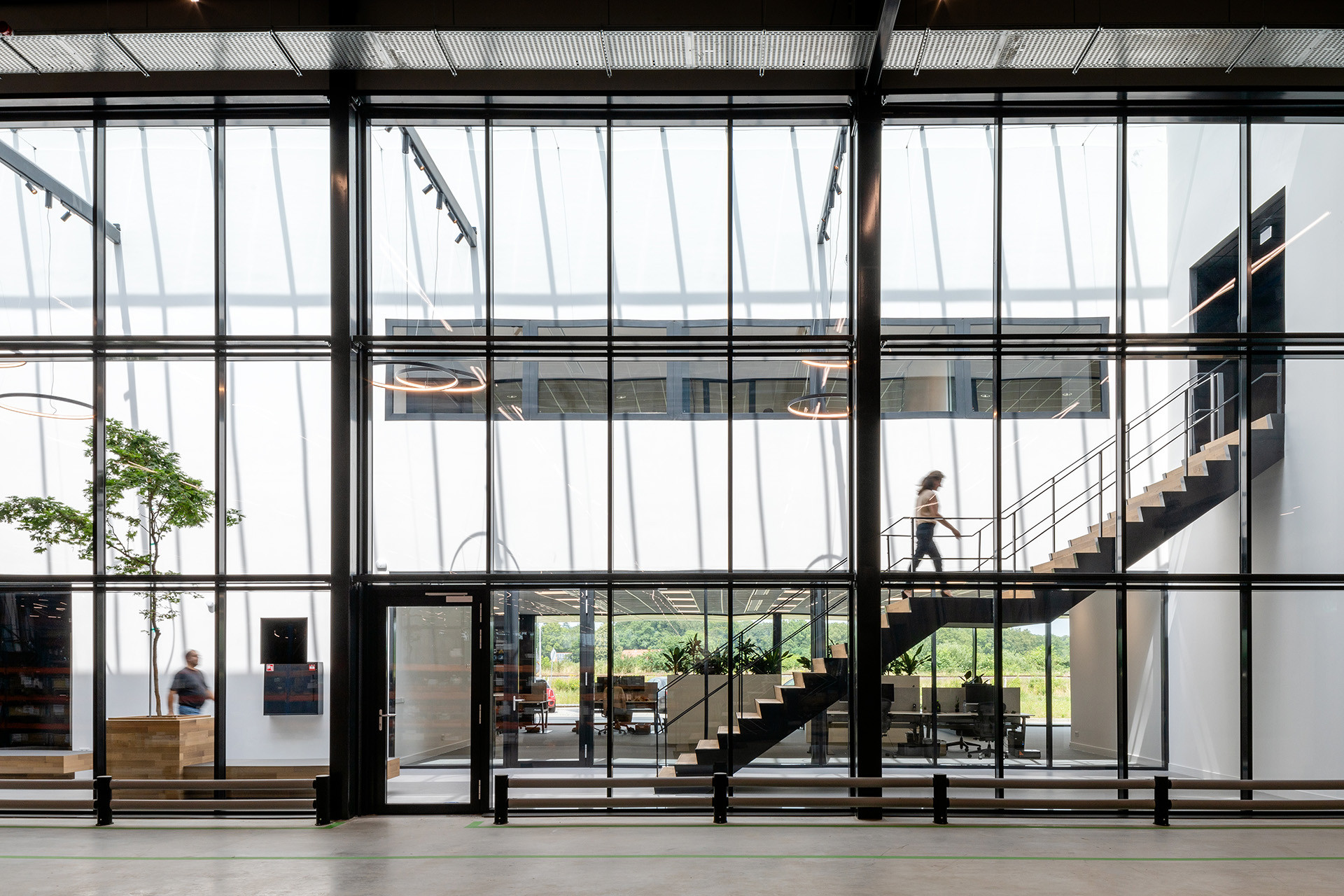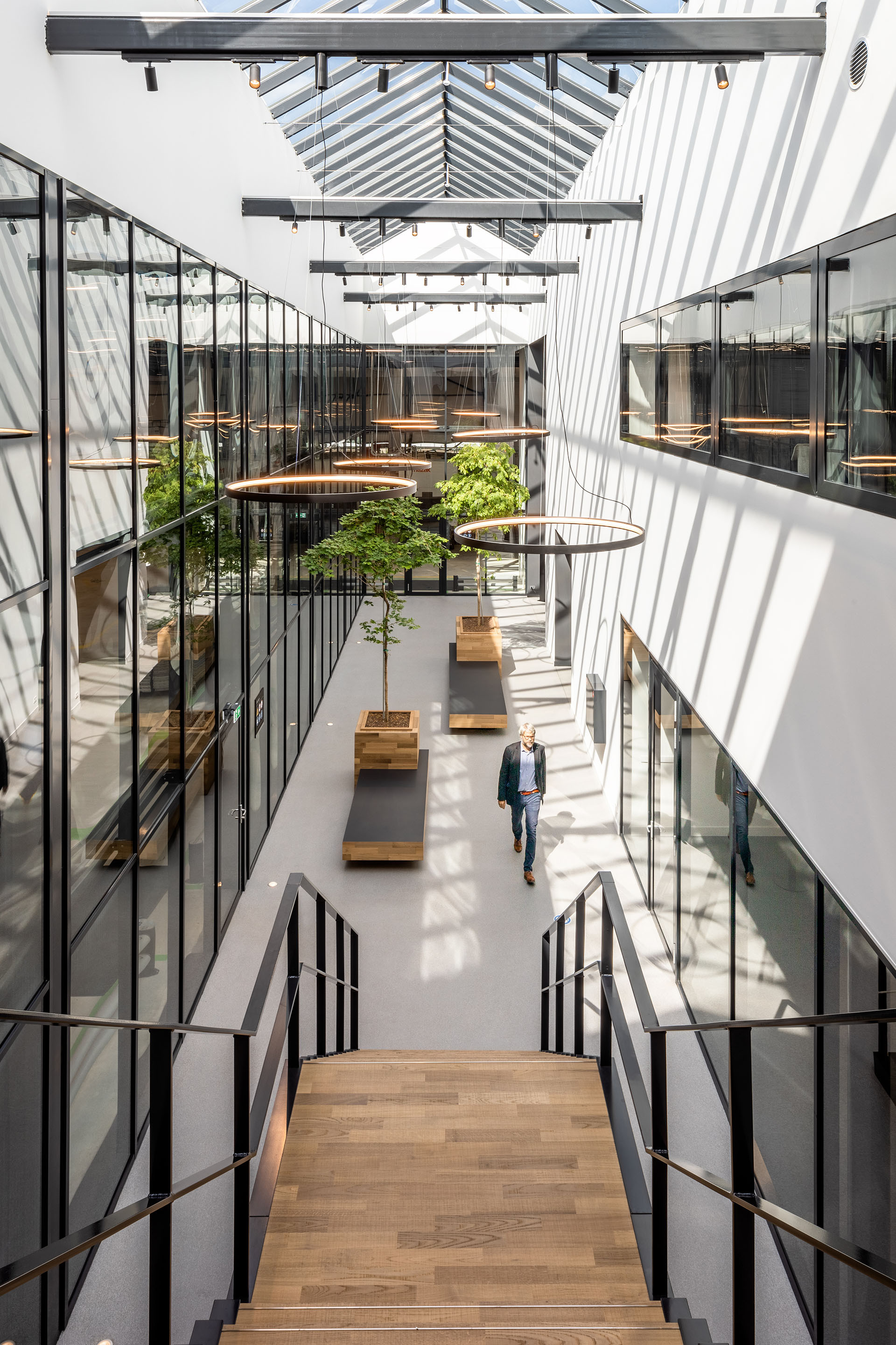 Het gebouw is zodanig geïntegreerd ontworpen dat zowel aan de noordzijde als aan de zuidzijde ondersteunende functies zijn neergelegd. Tussen de kantoren en de productiehal is een glazen atrium gemaakt. Dit zorgt voor veel licht en zicht, maar ook voor groenbeleving. Twee enorme bomen bevestigen de hoge ruimte. Dit atrium is tevens het entreegebied en het verbindende element voor informele ontmoetingen. Van daaruit kan gekozen worden om of naar de productiehal te lopen of middels een industriële trap omhoog te gaan naar het kantoorlandschap met een panorama view.