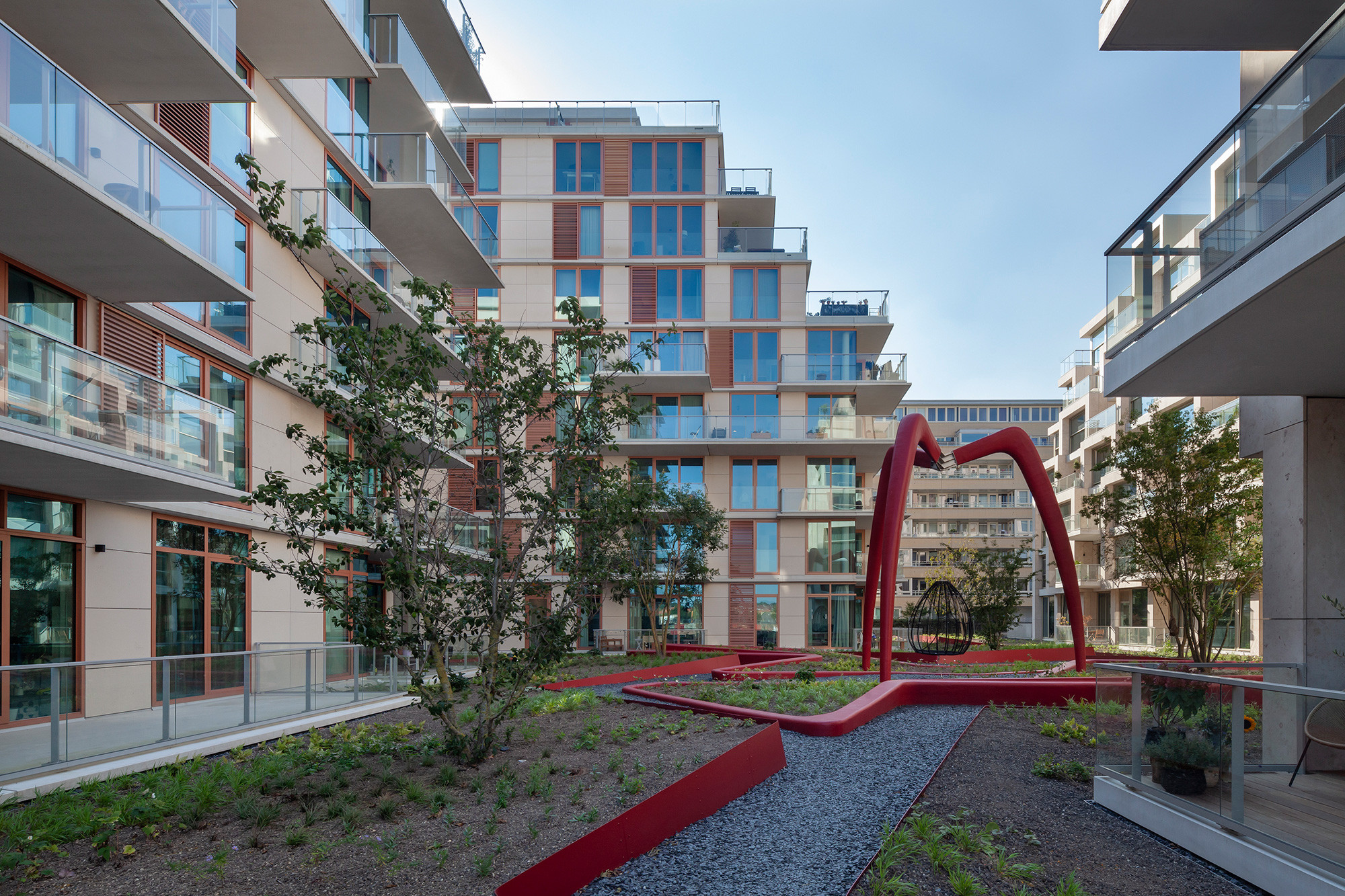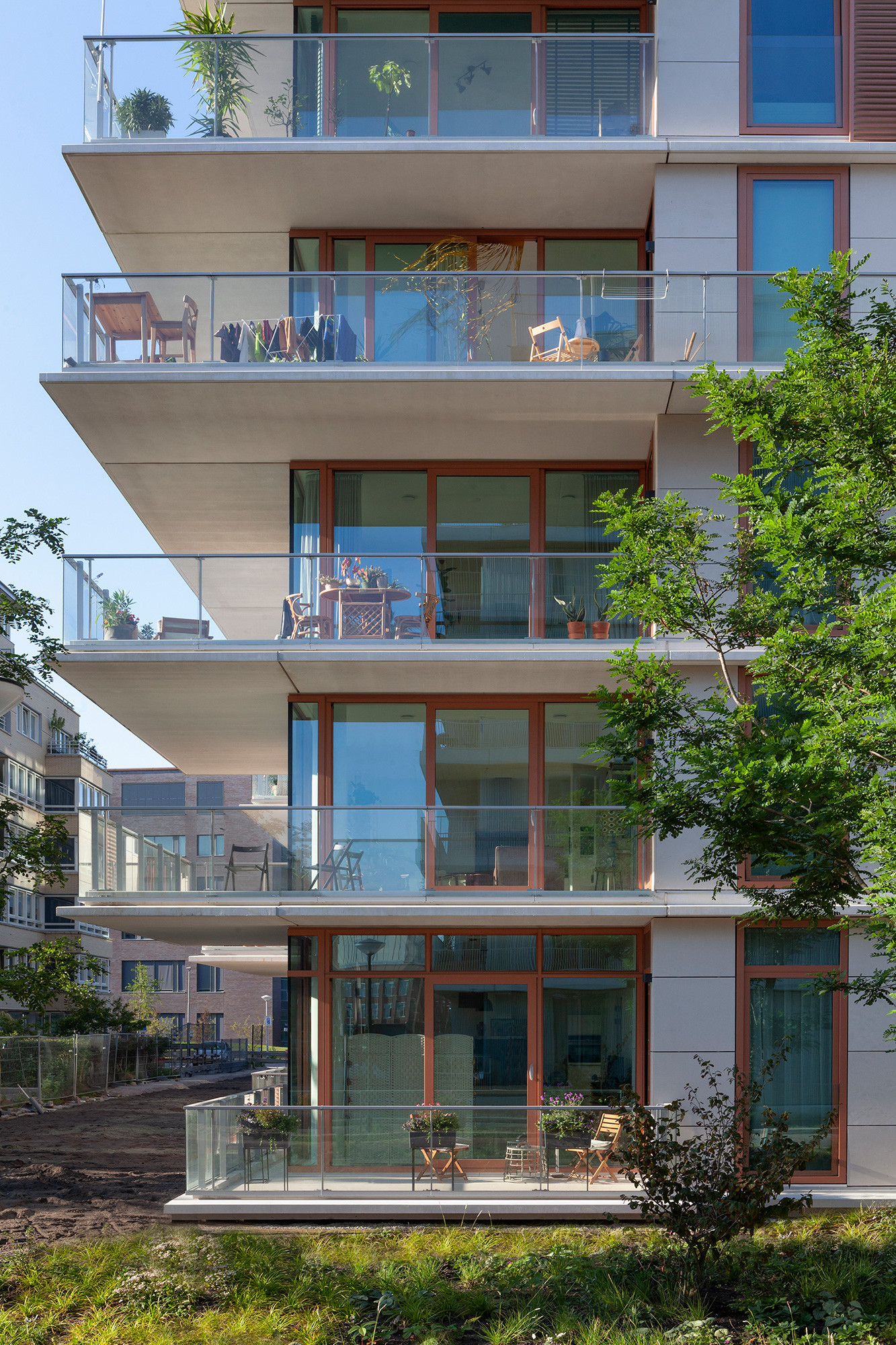 Uitzicht en zon optimalisatie van de buitenruimtes bepaalden verder de vorm van het woongebouw. De voor een groot deel overhoeks liggende ruime balkons geven het wooncomplex een expressieve plasticiteit. Door het slanke beton en de transparante balustrades is de binnen-buiten beleving vanuit de woningen optimaal, wat tegelijkertijd ook de levendigheid en veiligheid op straatniveau vergroot. Ook zorgt het voor perfecte lichtinval binnenin de woningen. In het binnengebied, tussen de twee gebouwen van kavel A, ligt een parkachtige tuin die door alle bewoners gebruikt kan worden, een waardevolle toevoeging op de individuele buitenruimtes.