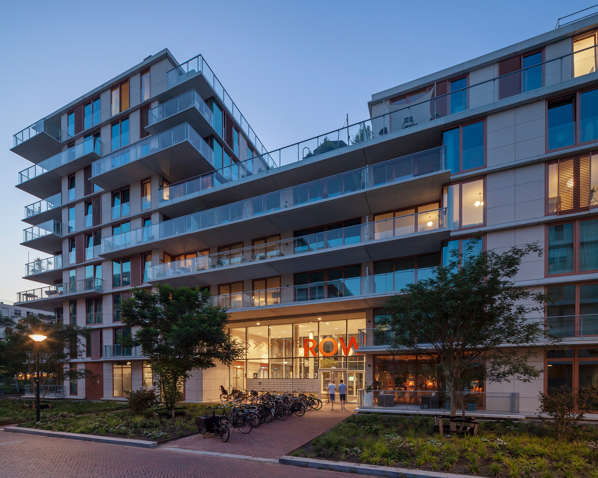 Comfort en woongenot waren de basis uitgangspunten voor het ontwerp van het hogere segment huurgebouw, The Row. In samenspraak met Amvest is dit verder uitgewerkt in de uitgangspunten: lichtheid, transparantie, relatie tussen binnen buiten, ruime balkons en een hoogwaardige, maar duurzame en onderhoudsarme materialisering.
