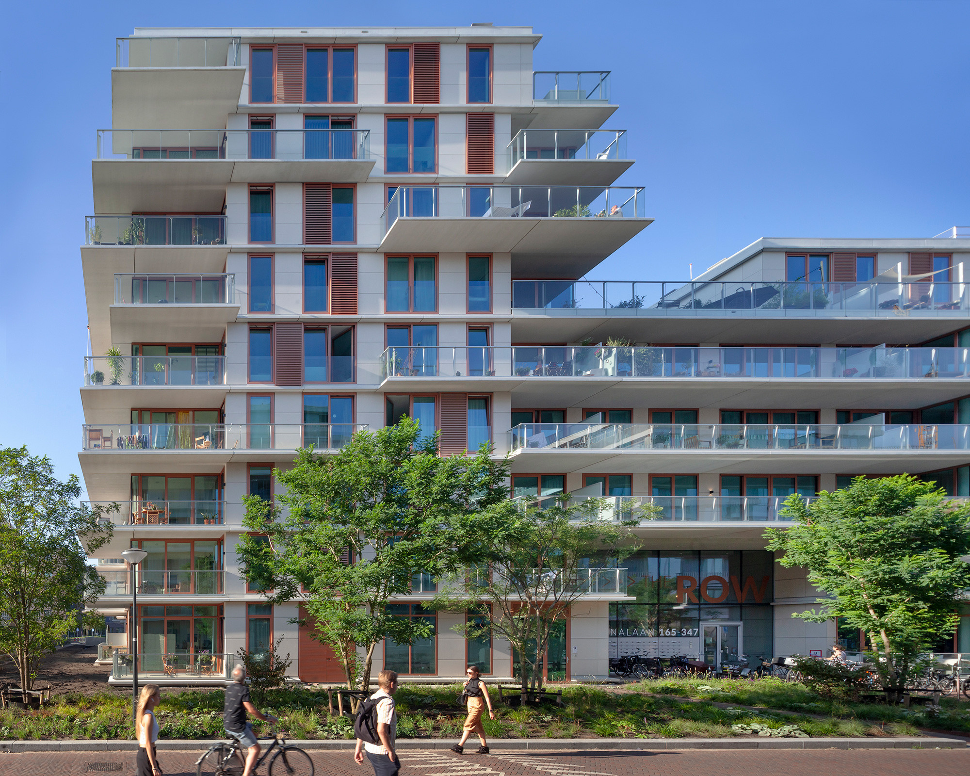 In de nieuwe Amsterdamse wijk Aan het IJ ligt The Row, een speels woonblok ontworpen op comfort en woongenot, met bij elk appartement een royale buitenruimte. Het is een opvallend ranke verschijning in het statige stedenbouwkundige grid.